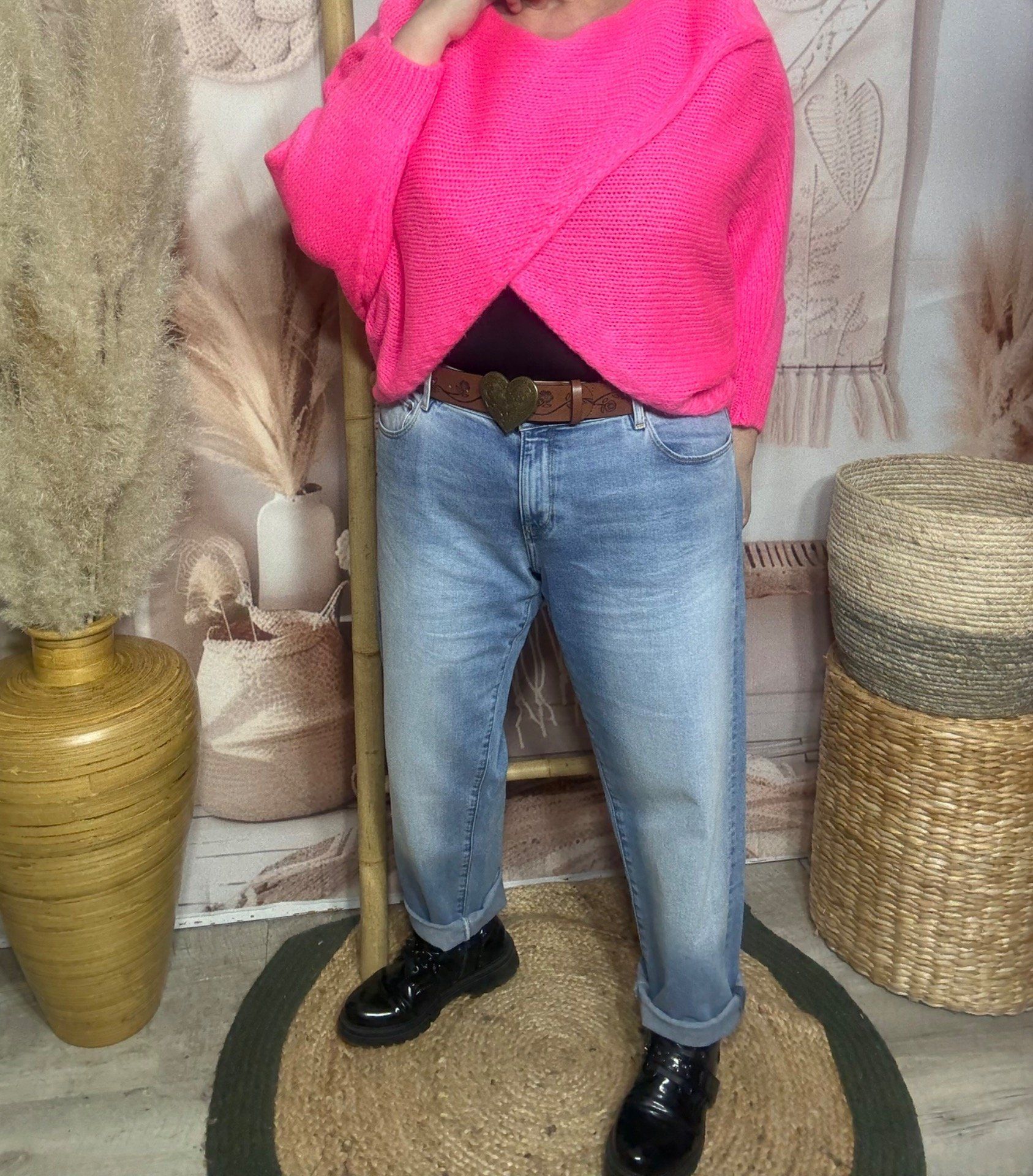 Je mesure 1m57 et je porte habituellement une taille 42 avec un 100E de poitrine. Le pull est bien oversize pour moi.