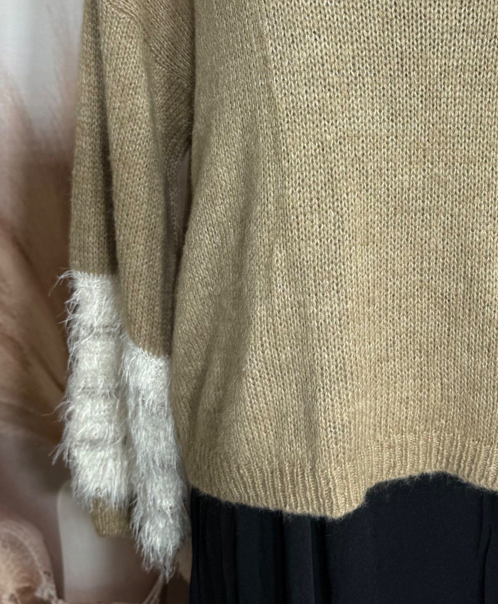 col bateau, manches longues avec au niveau des poignets, 3 bandes en laine duveteuse "poilue" d'une douceur de dingue :-)