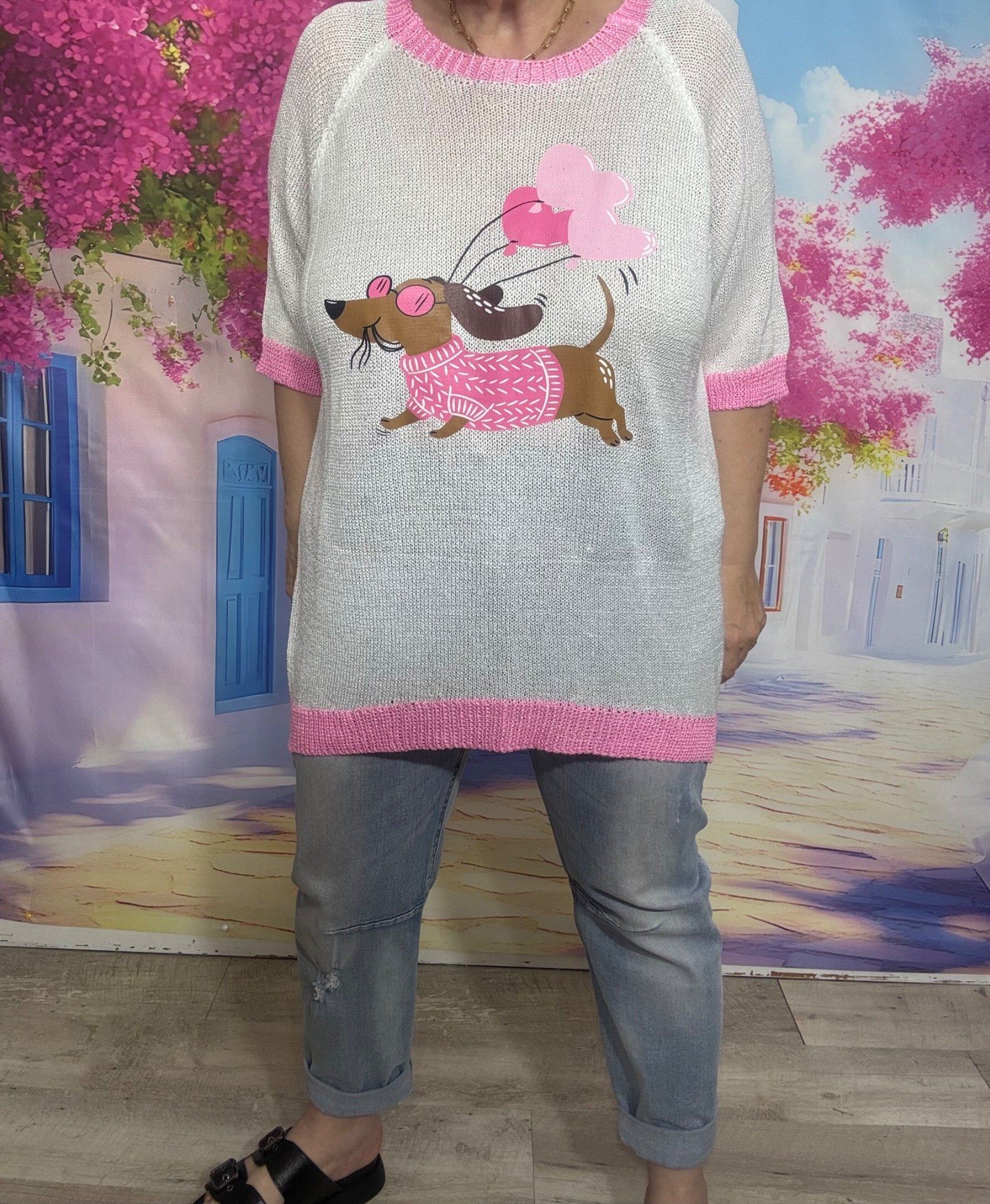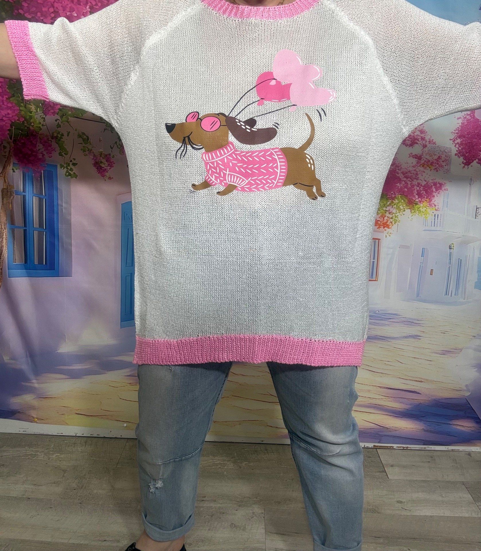Pull fin SANS LAINE blanc & rose bébé Le Chien Teckel aux ballons coeurs du 40 au 50/52