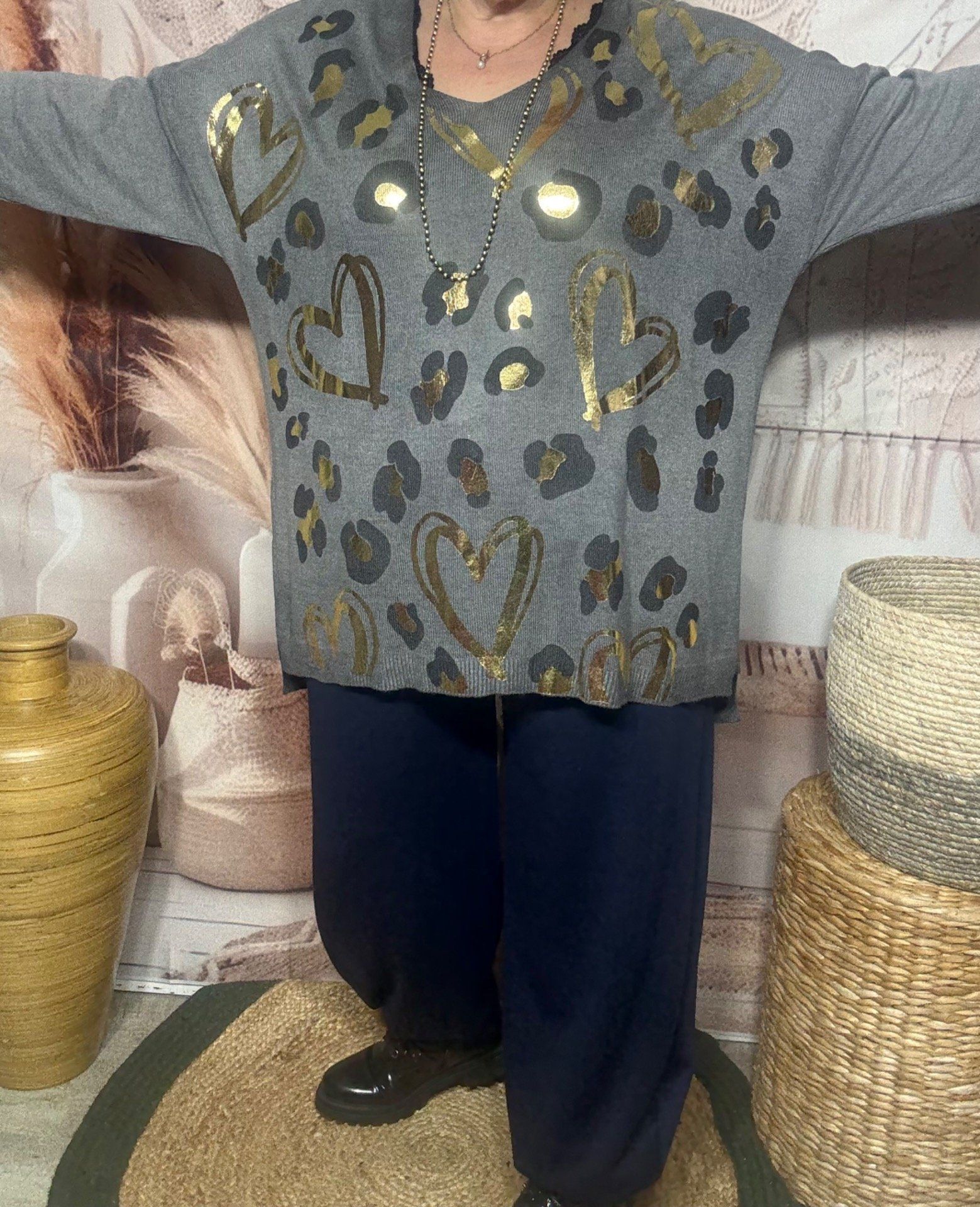pull sans laine gris souris délavé coeurs dorés or douceur +++