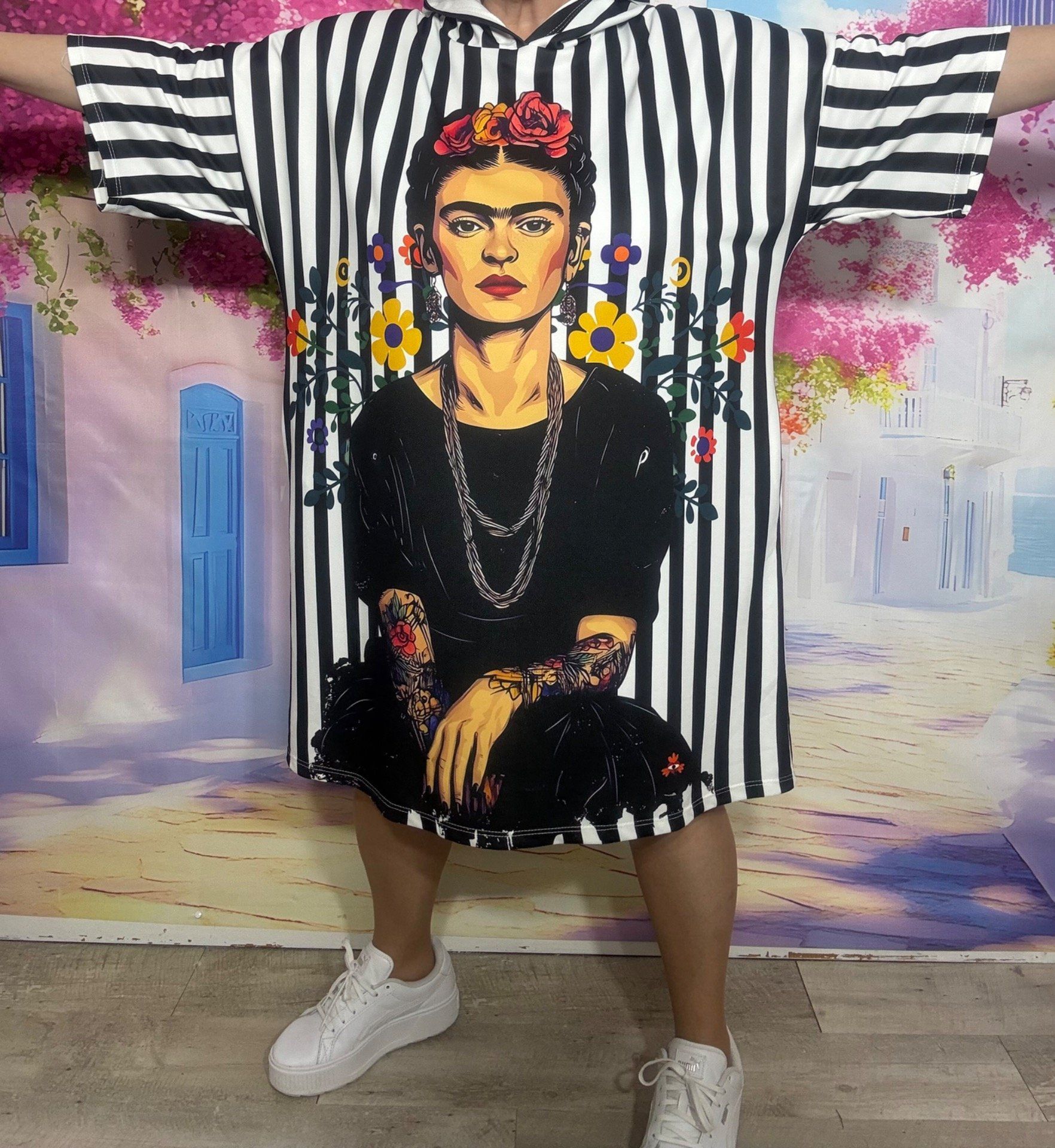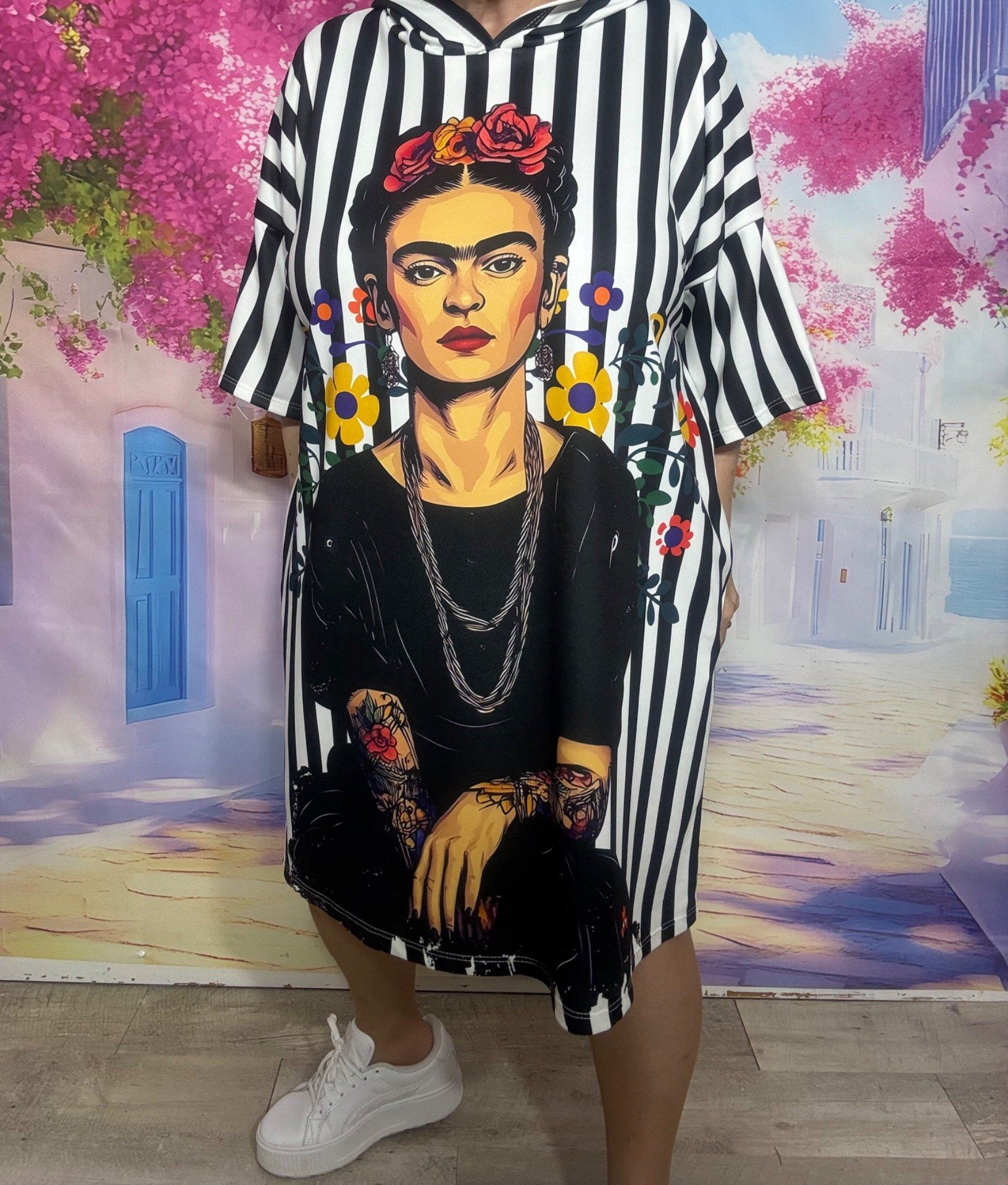 fond blanc rayé noir avec un sublime imprimé Frida Kahlo tattoo devant et derrière !