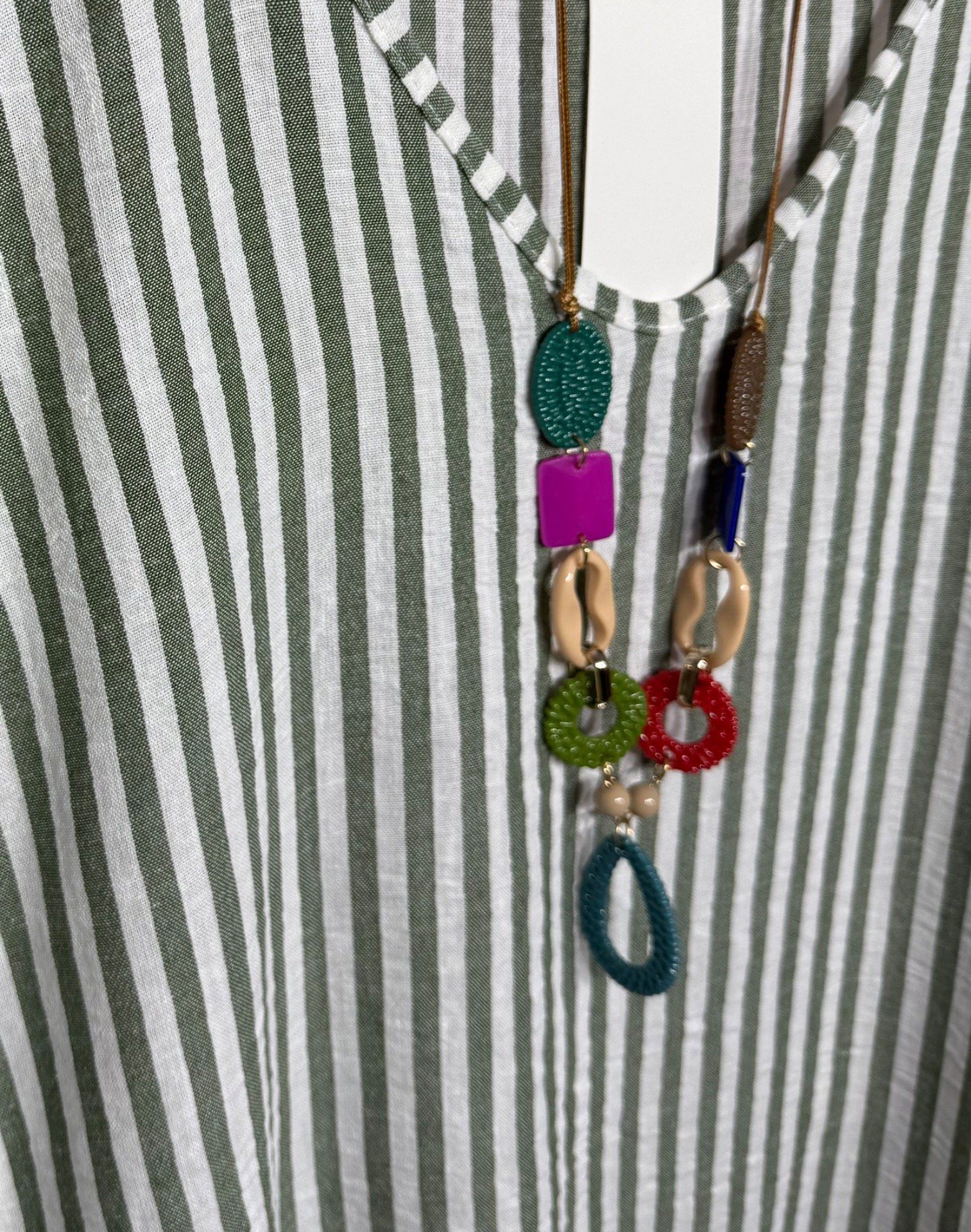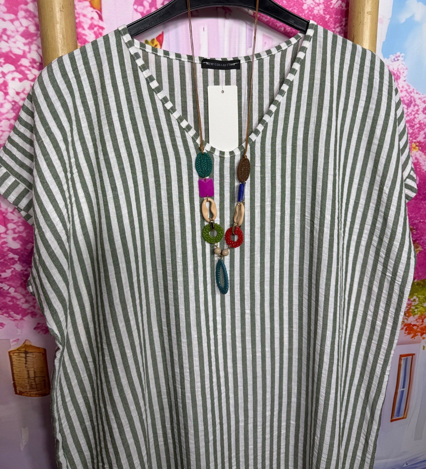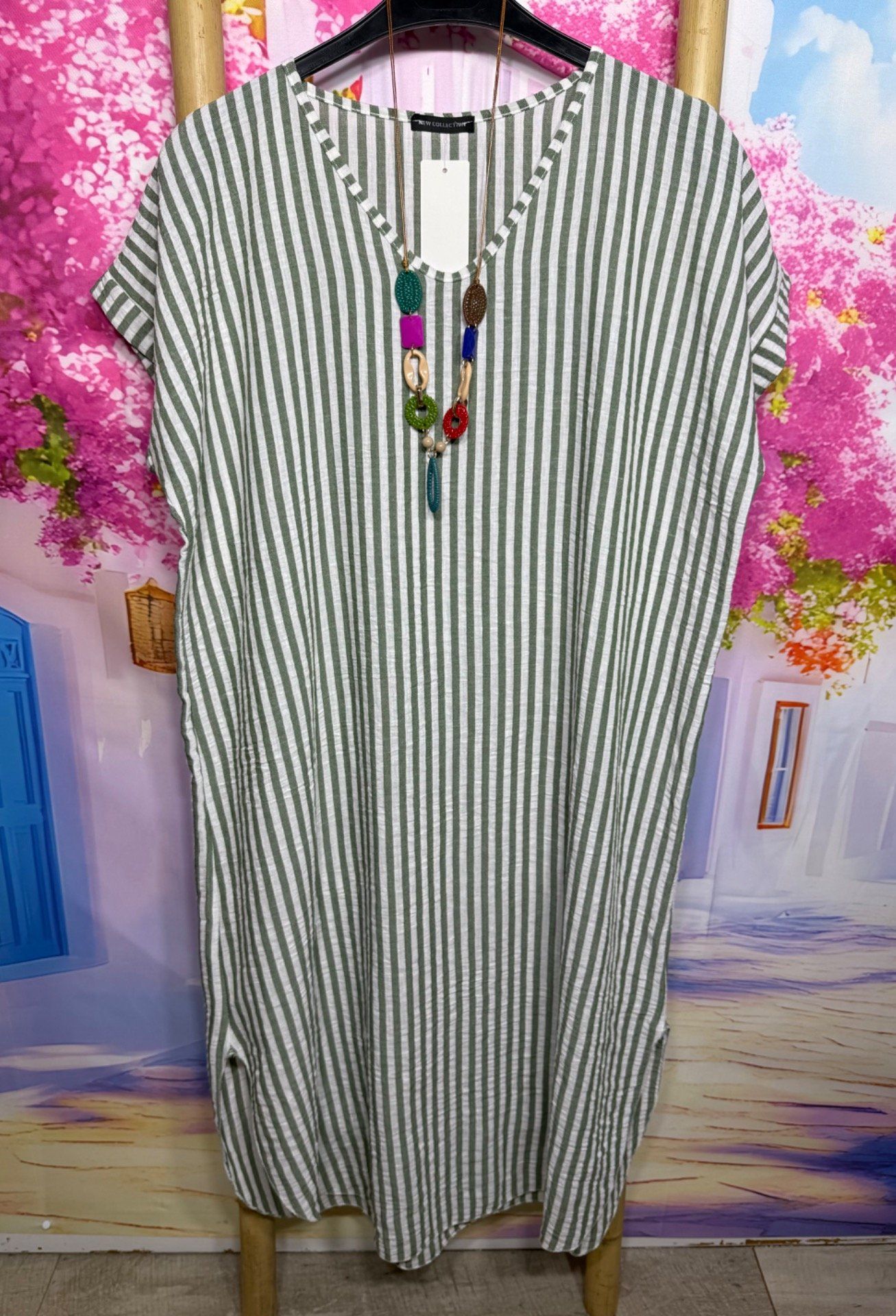 Robe ample mi-longue aspect lin rayé Kaki chiné et écru + collier