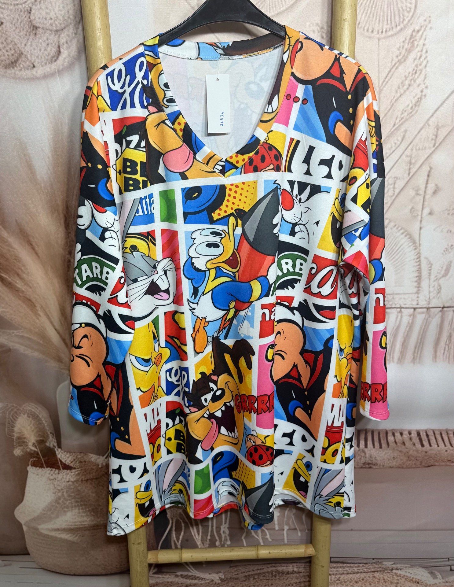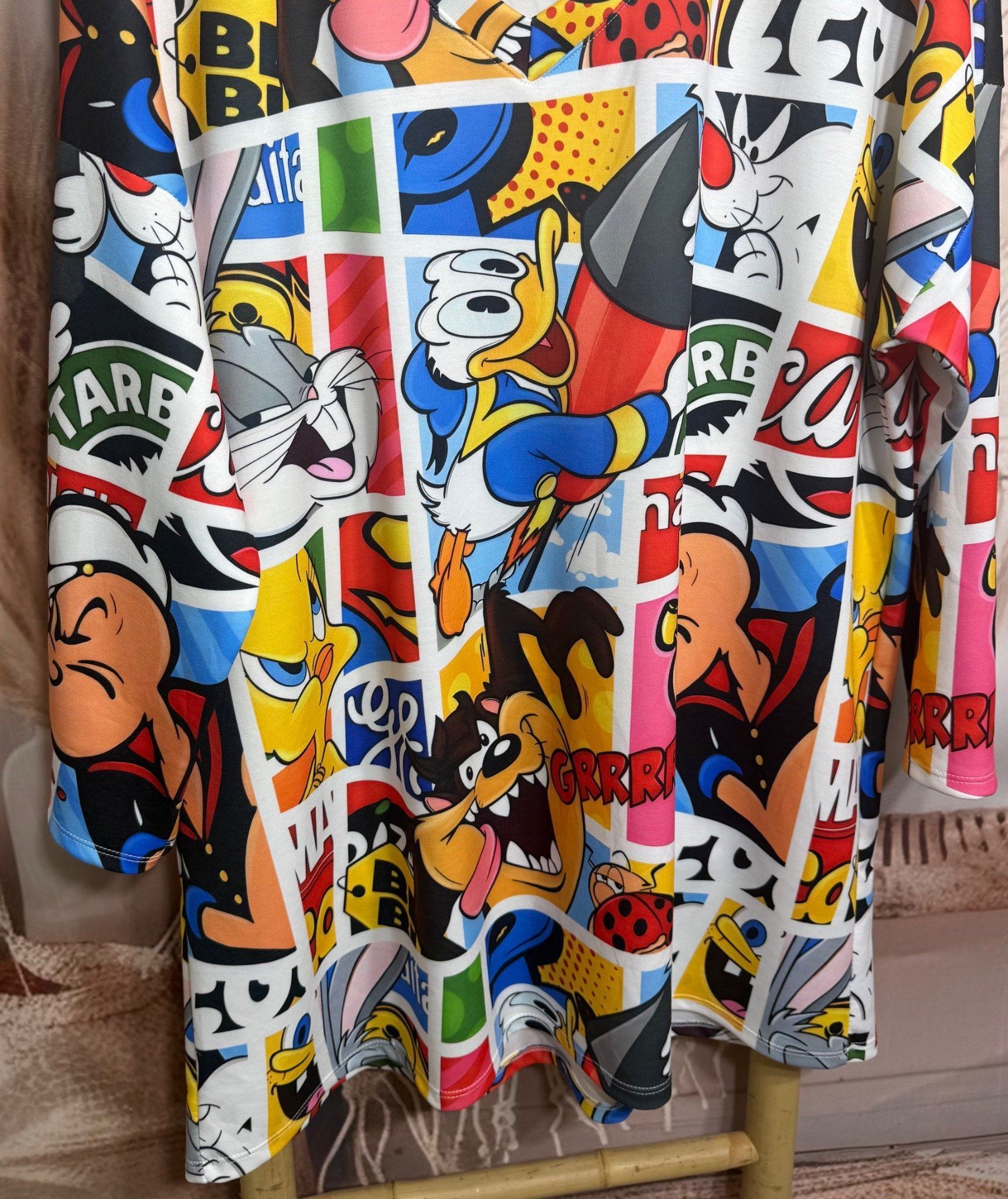 adorable imprimé pétillant et original partout mélangeant plein de personnages de dessins animés différents : Donald, Popeye, Taz, Bugs Bnny, Grominet... :-)