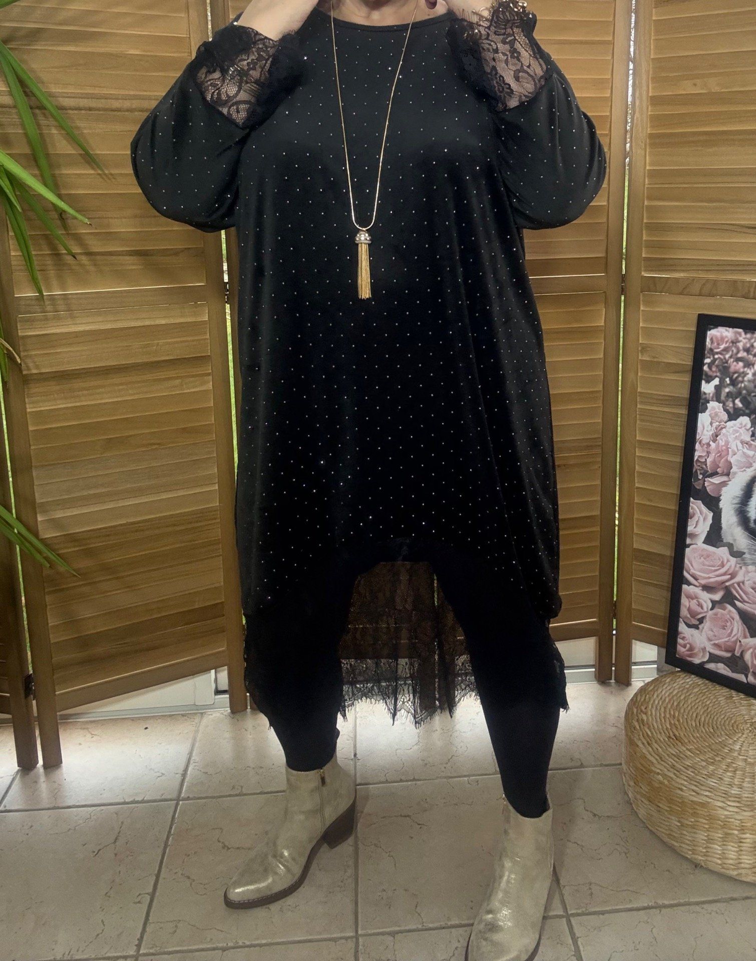 Robe asymétrique mi-longue velours noir dentelle noire strass argentés du 38 au 48/50