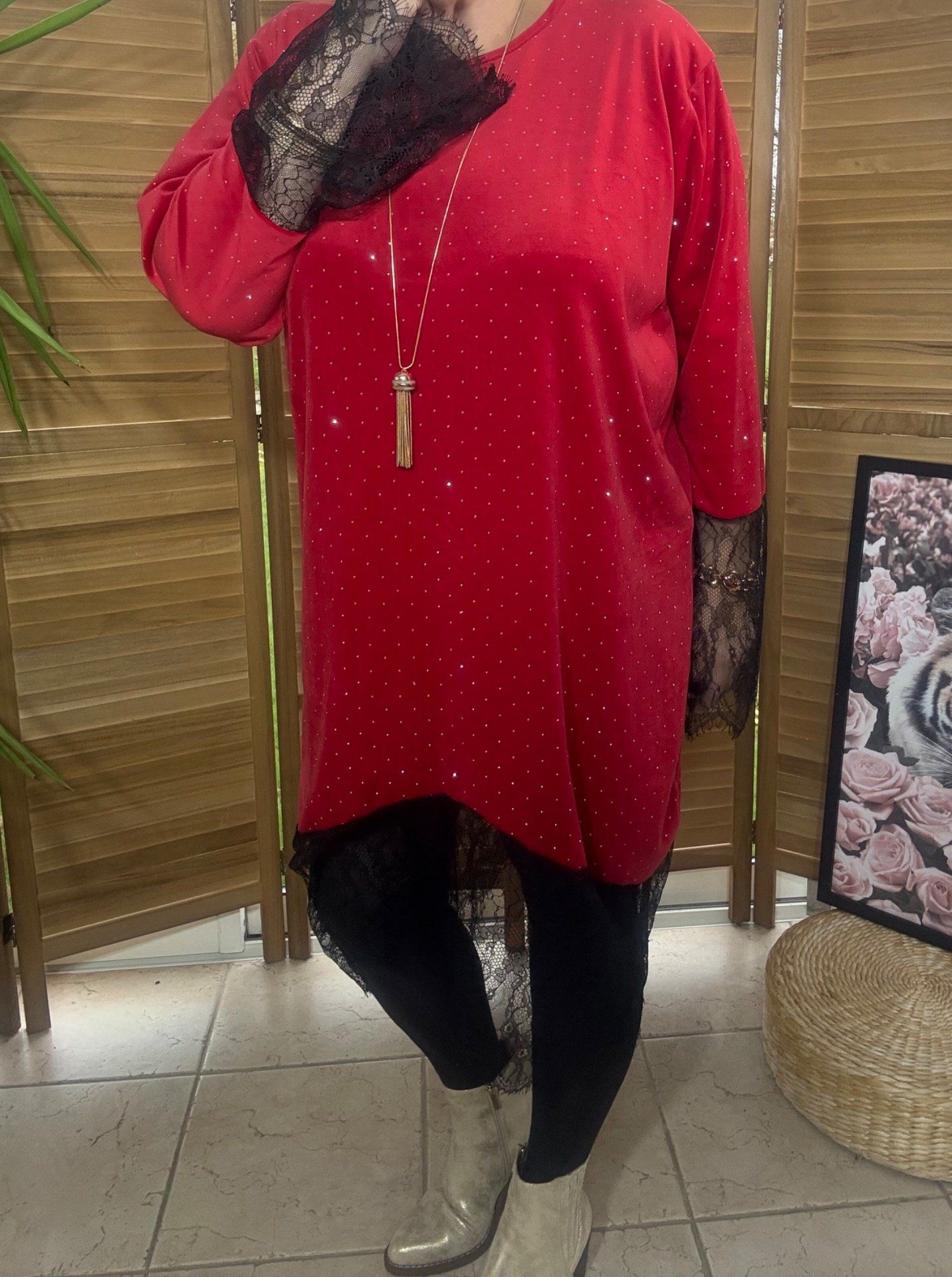 Robe asymétrique mi-longue velours rouge dentelle noire strass argentés du 38 au 48/50