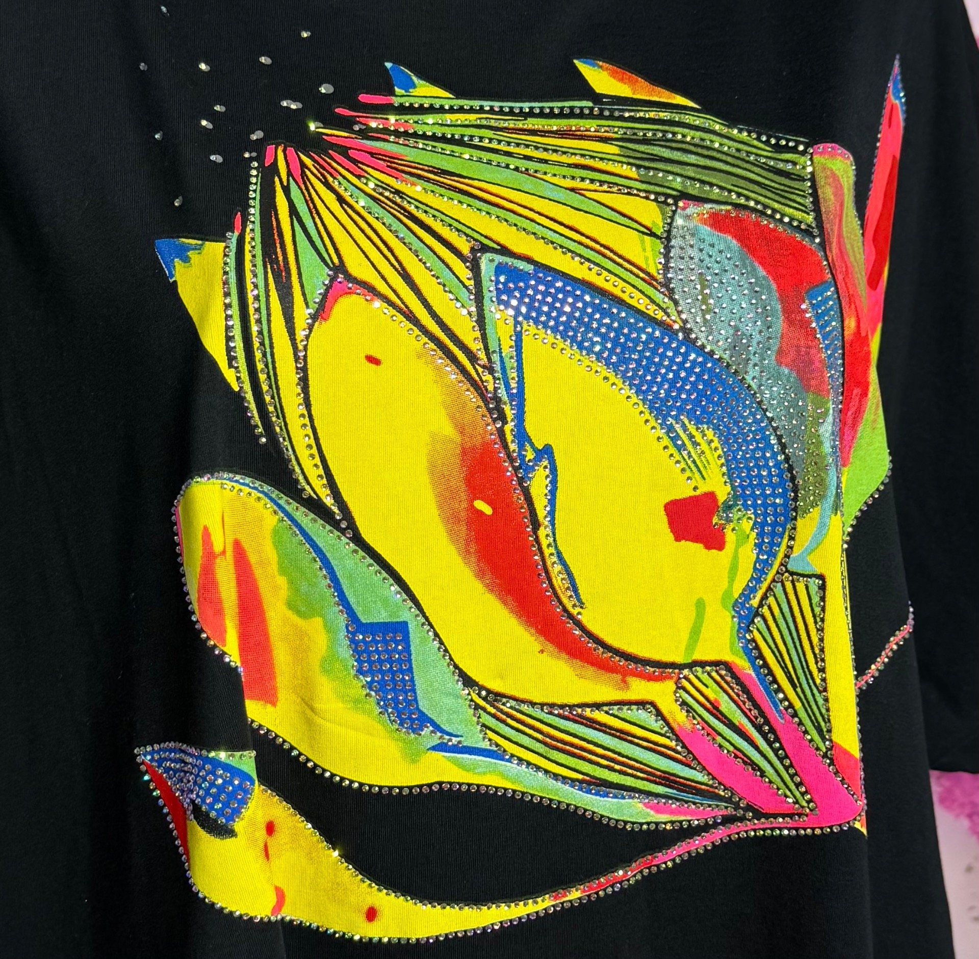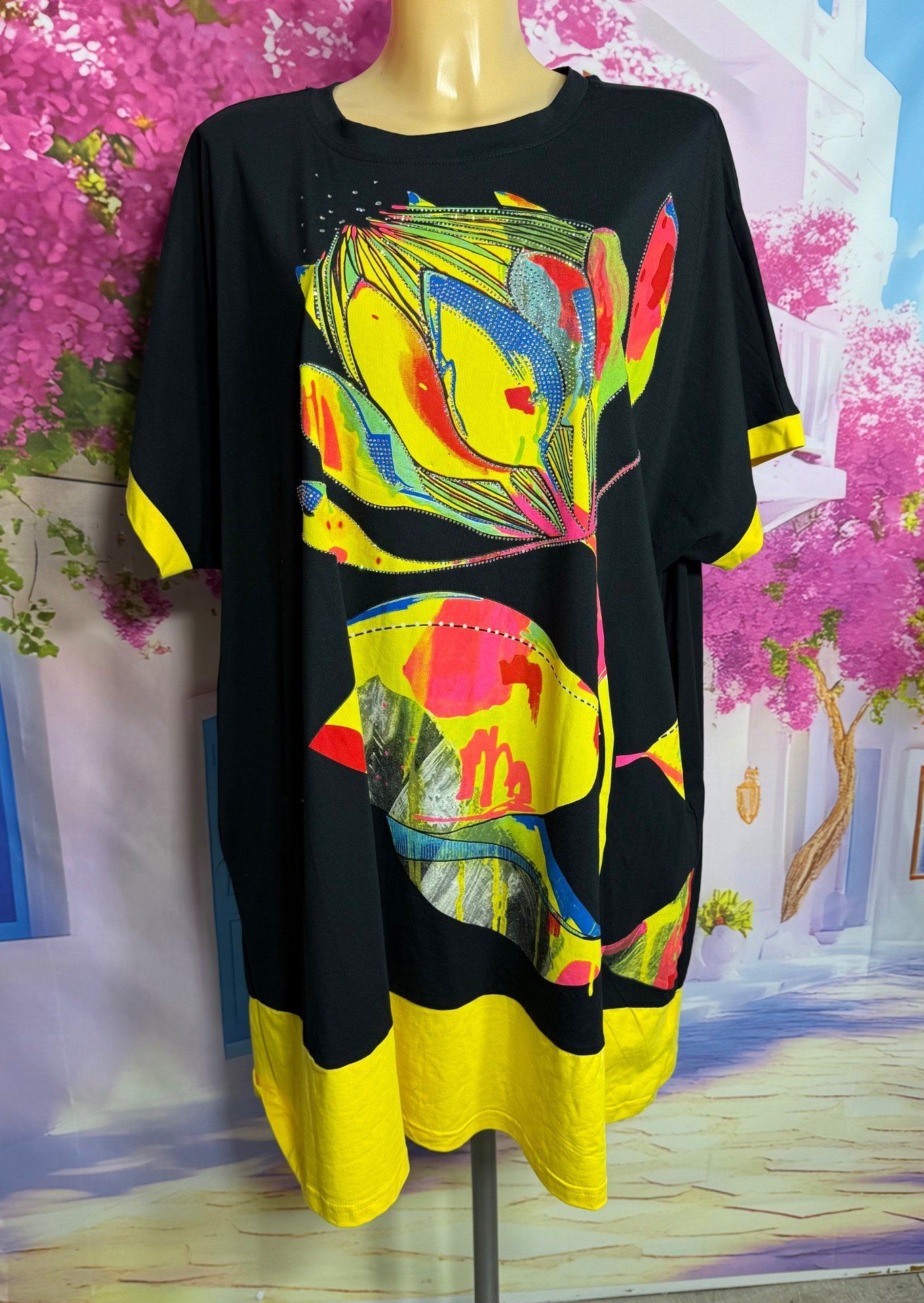 Robe courte oversize noire & jaune Fly Out Fleurs tropicales Strass argentés du 42 au 52/54