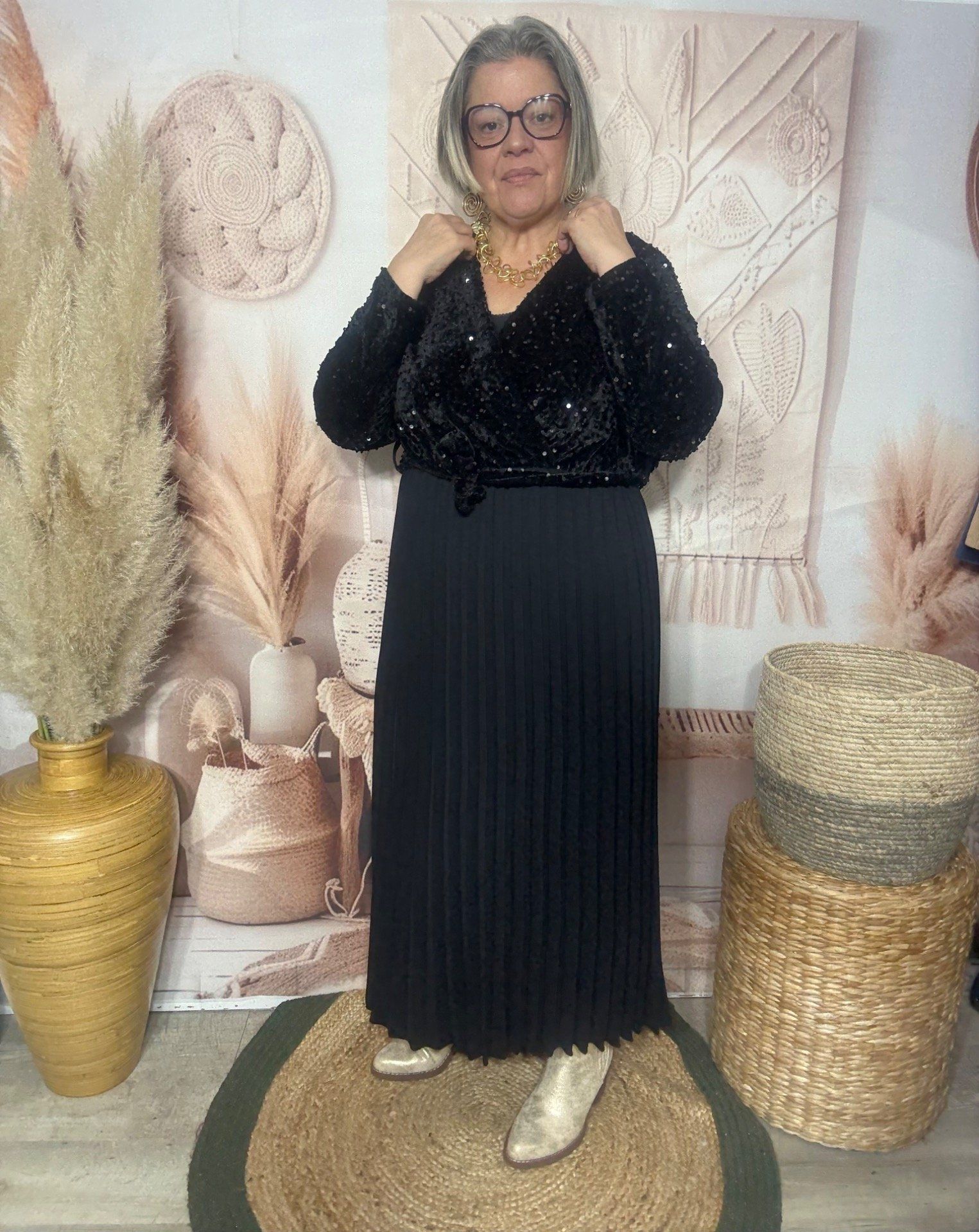 Robe longue cache-coeur sequins noirs et bas plissé + ceinture du 40 au 52/54
