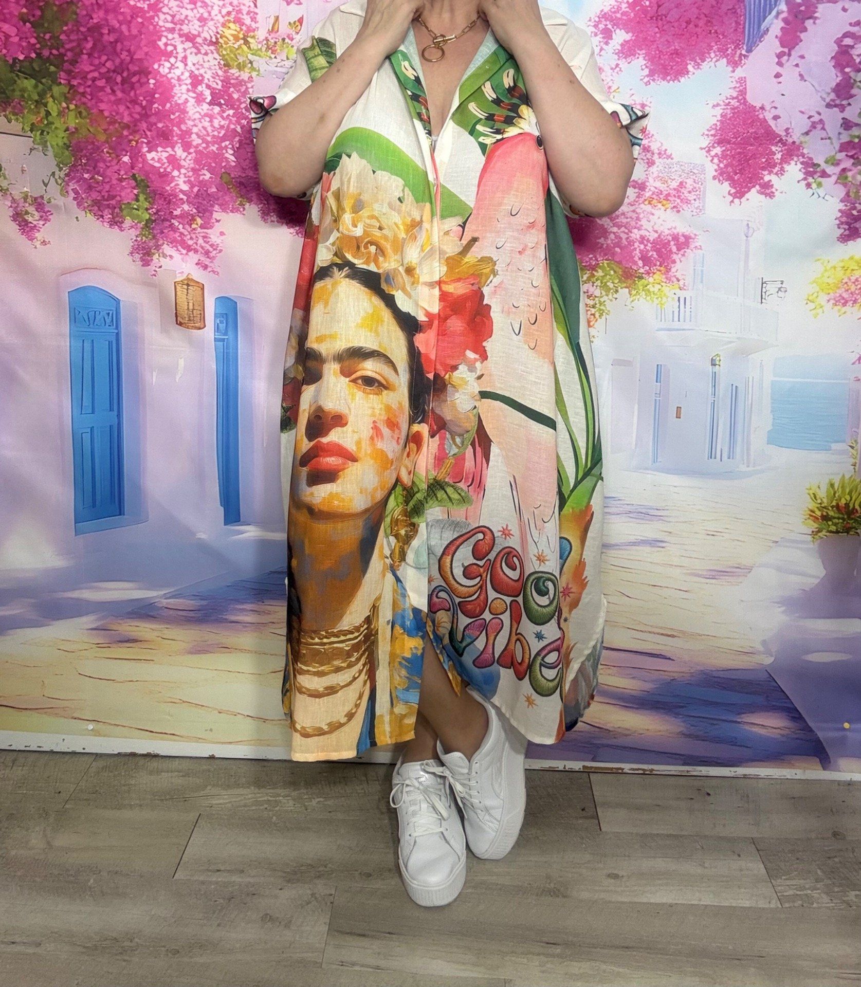Robe longue oversize lin manches courtes crème rayée Frida Kahlo Perroquets Tropicaux