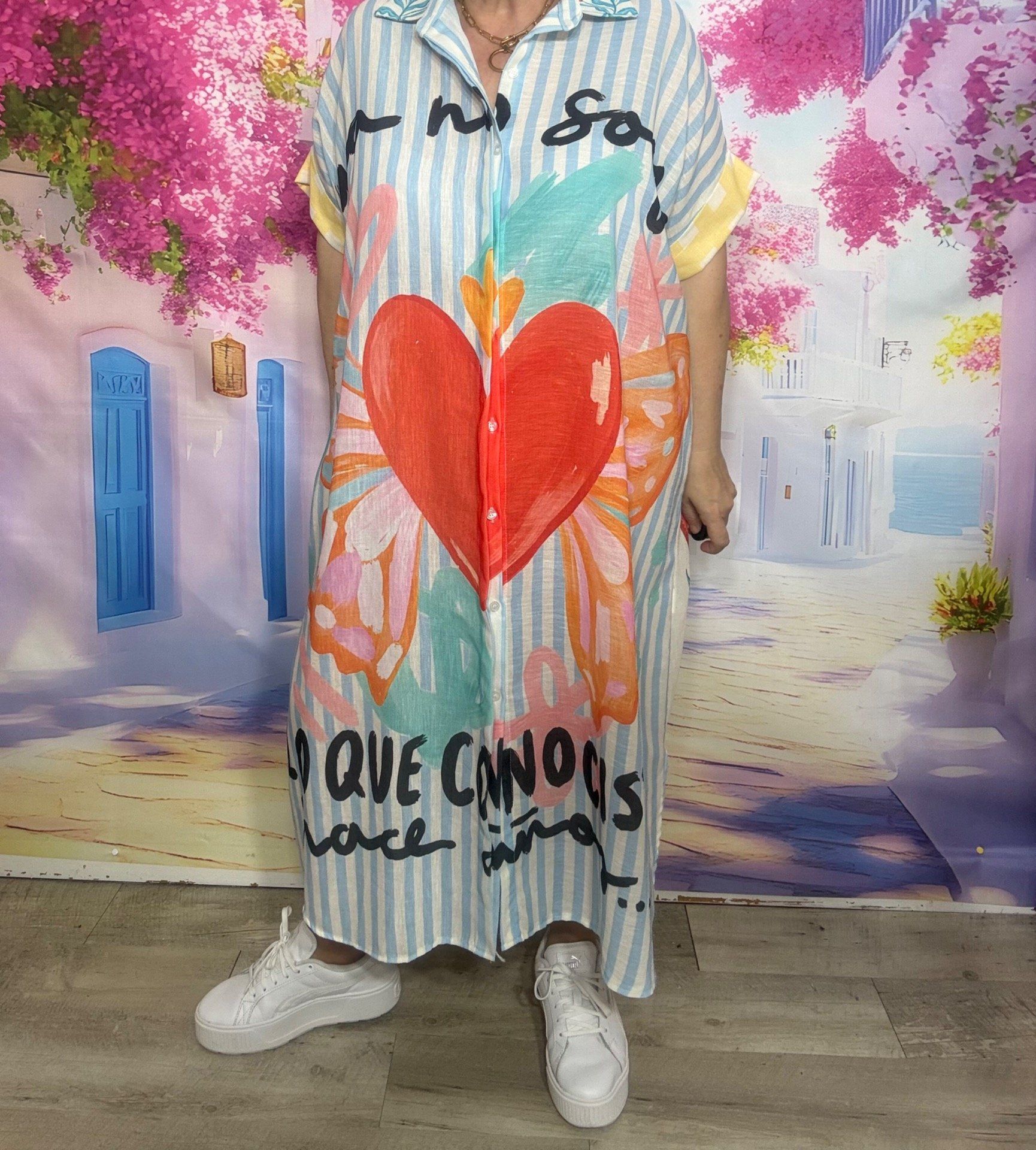 Robe longue oversize lin manches courtes Rayé ciel Coeur Papillon Colombes