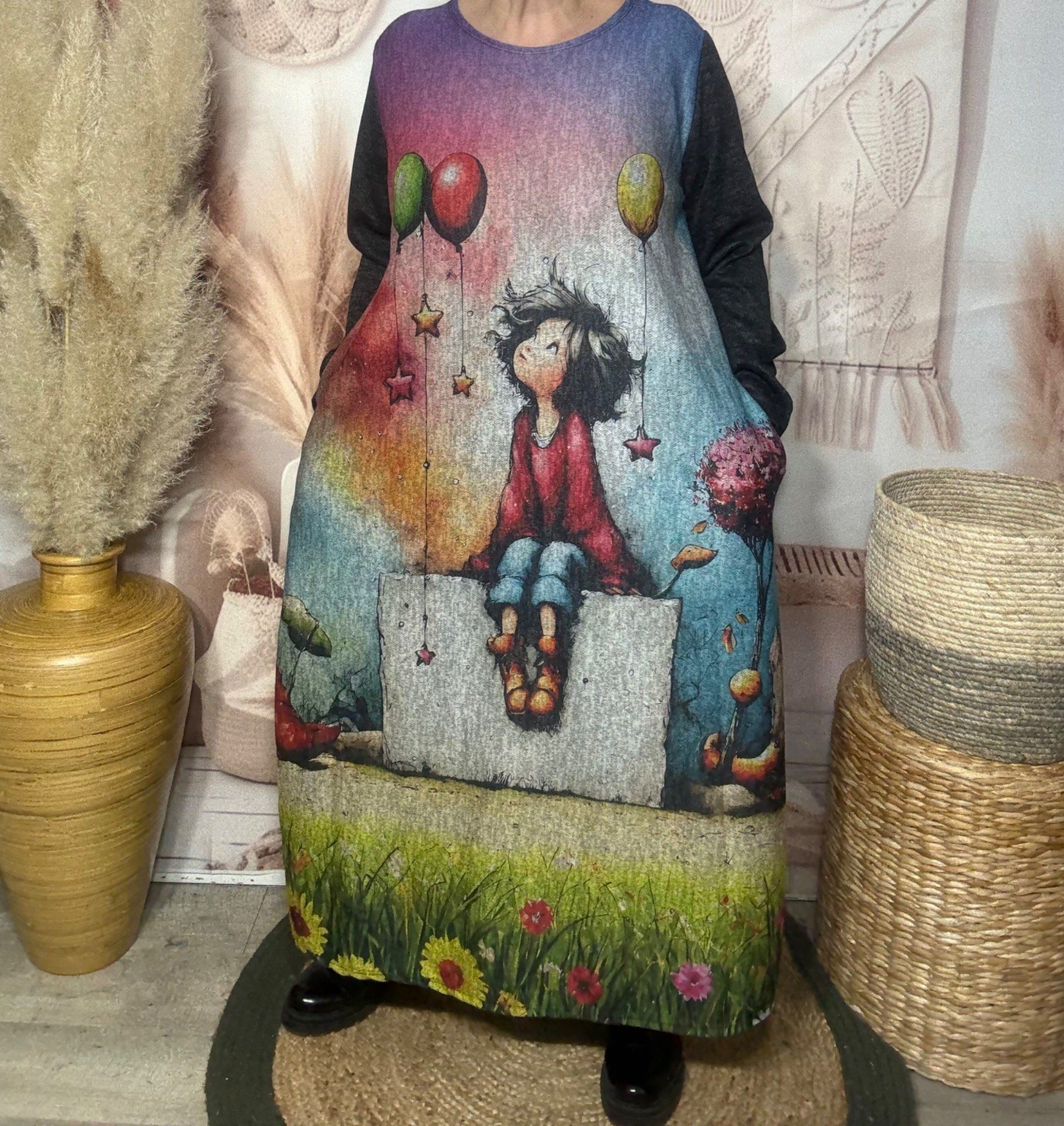 Robe longue trapèze chinée La Fillette rêveuse aux ballons + tour de cou assorti du 40 au 50