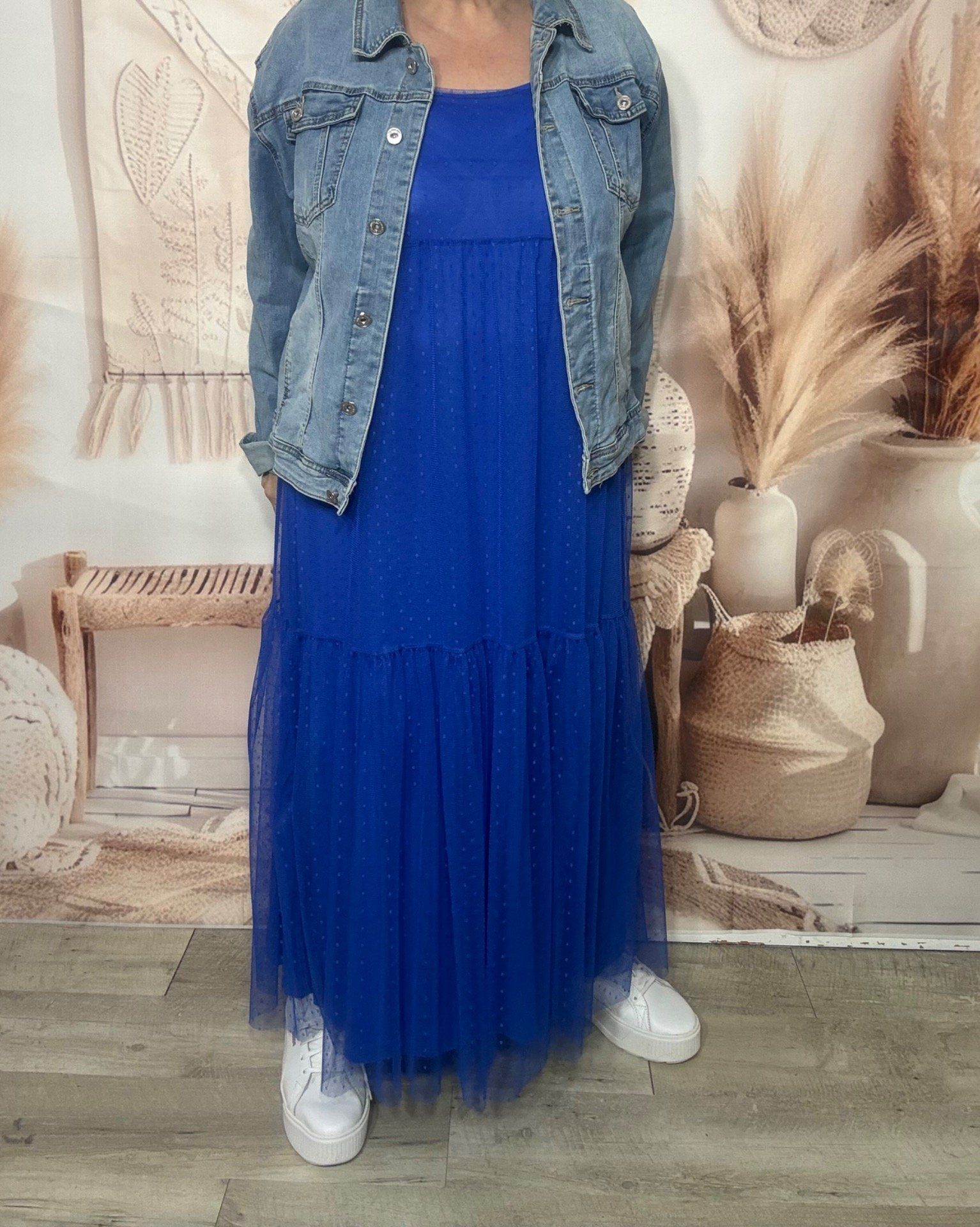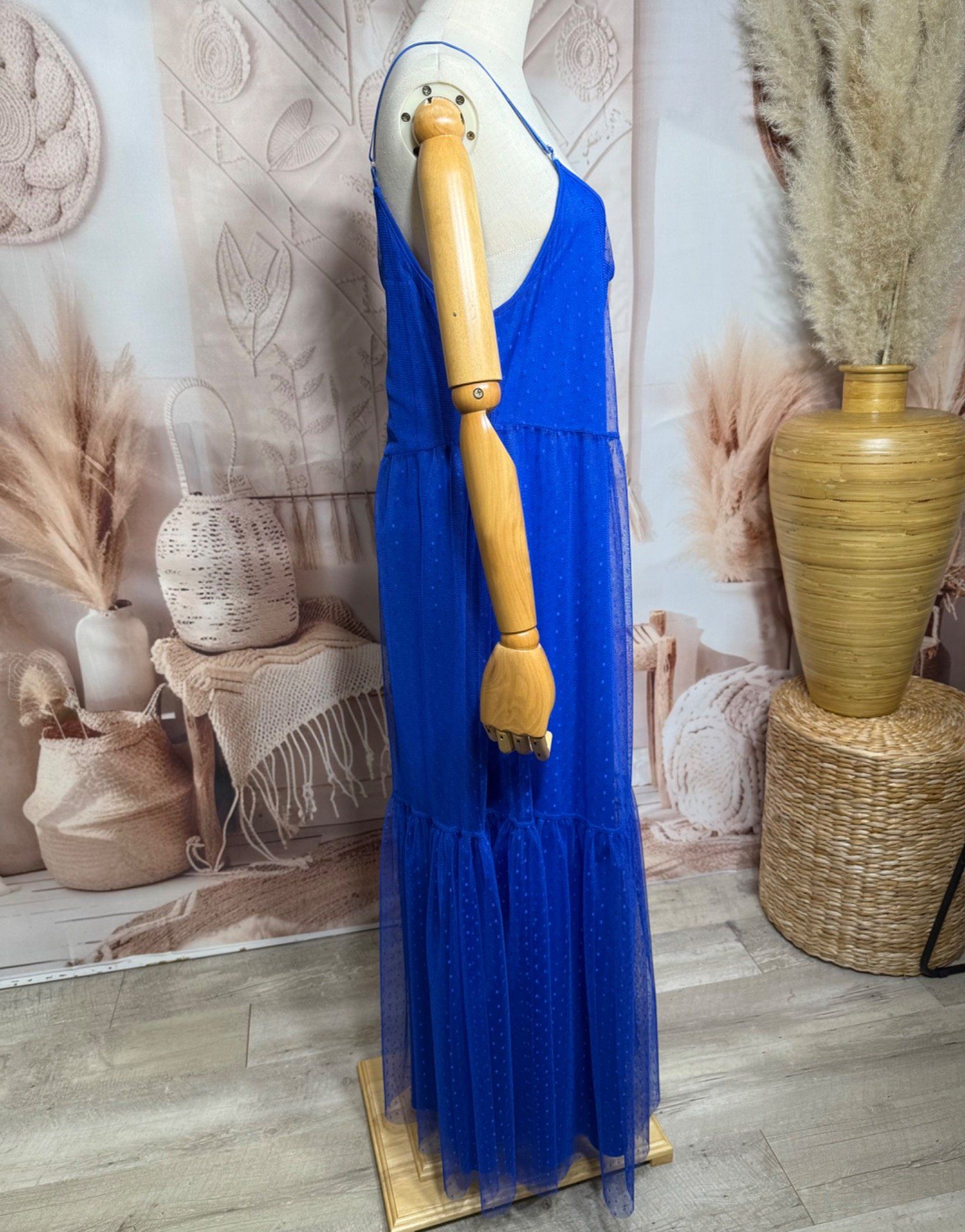 Robe longue tulle bleu électrique et plumetis fines bretelles réglables du 38 au 48