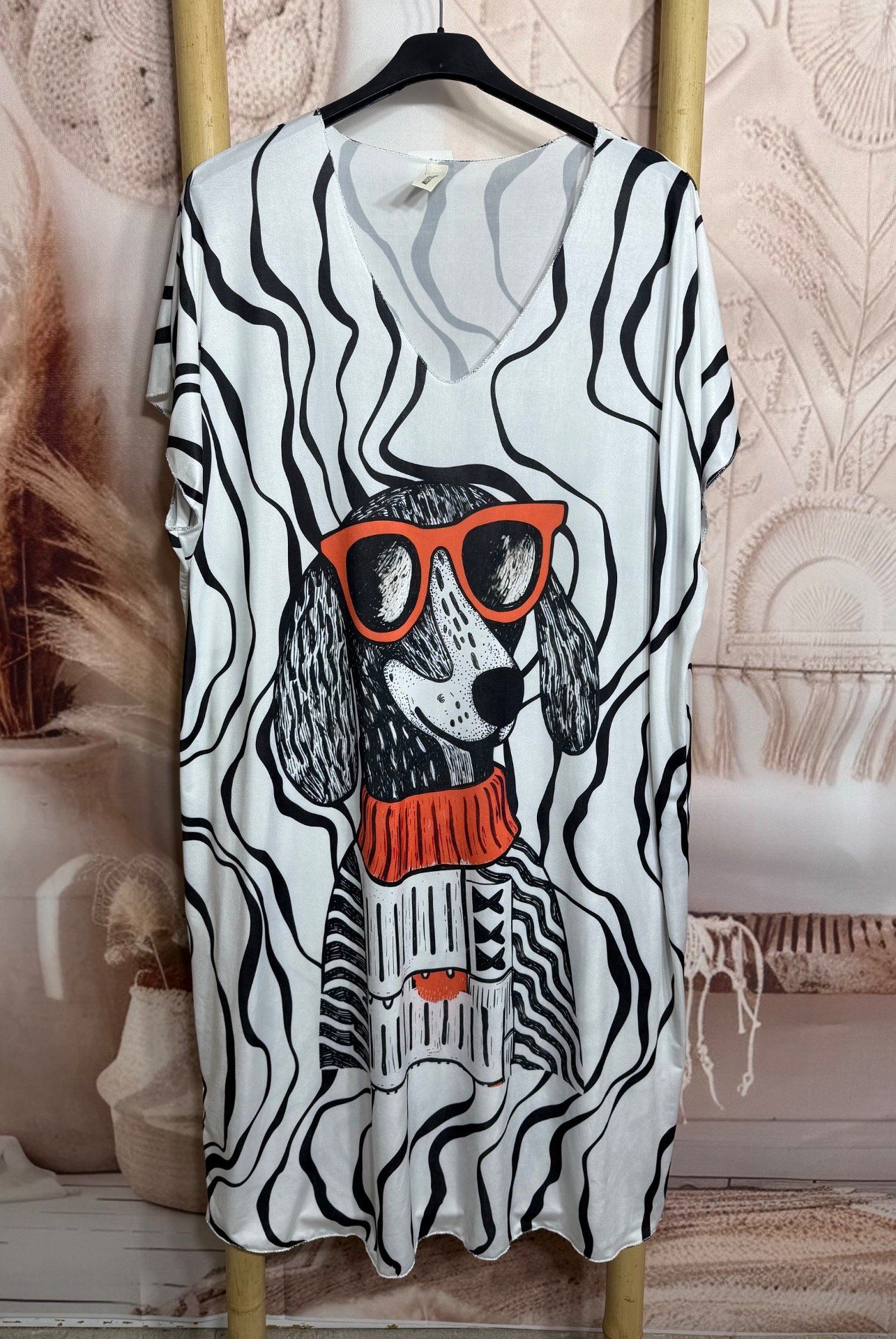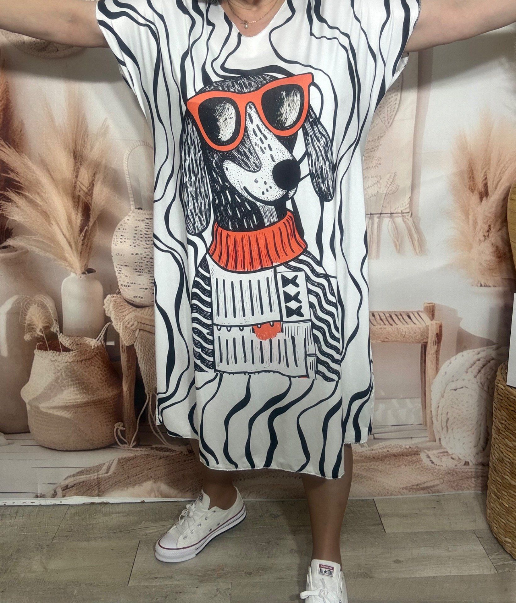 Robe mi-longue ample lycra blanche zébrée Le Chien Lévrier à lunettes du 42 au 54