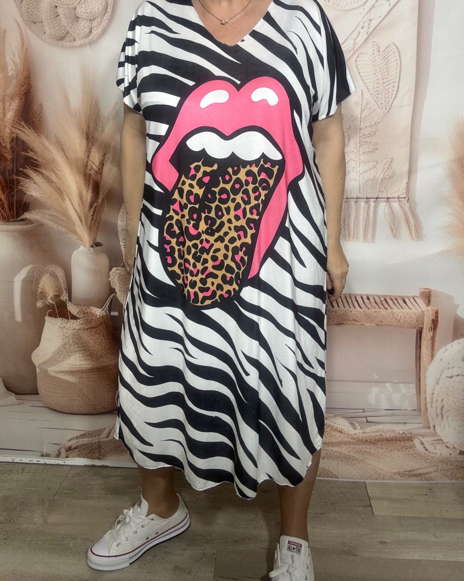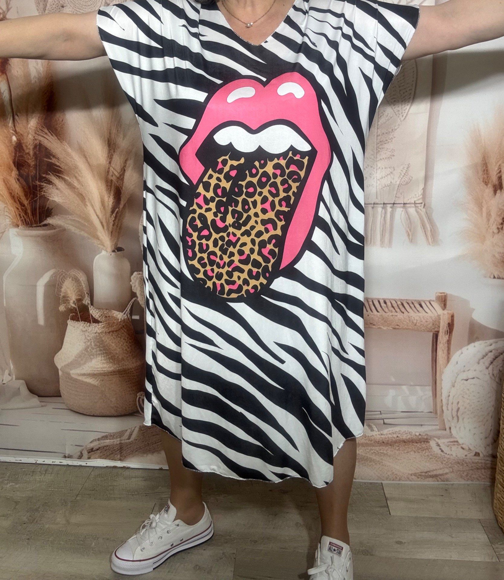 Robe mi-longue ample lycra blanche zébrée The Rolling Stones Léopard du 42 au 54