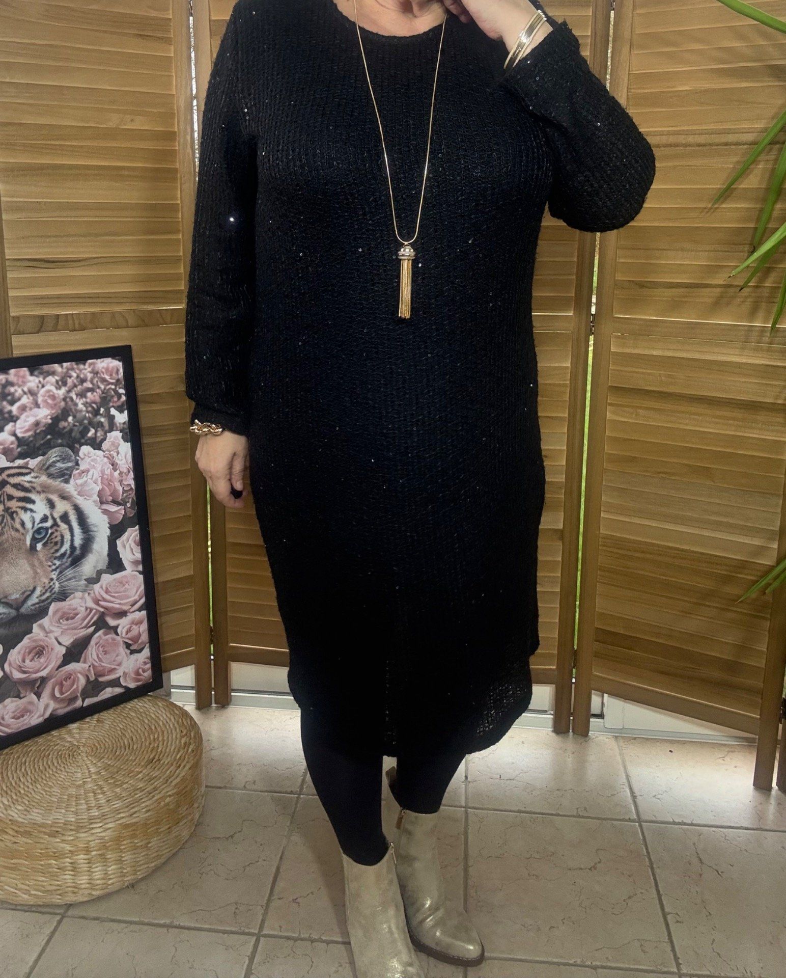 Robe noire ou maxi-Pull paillettes et sequins noirs brillants