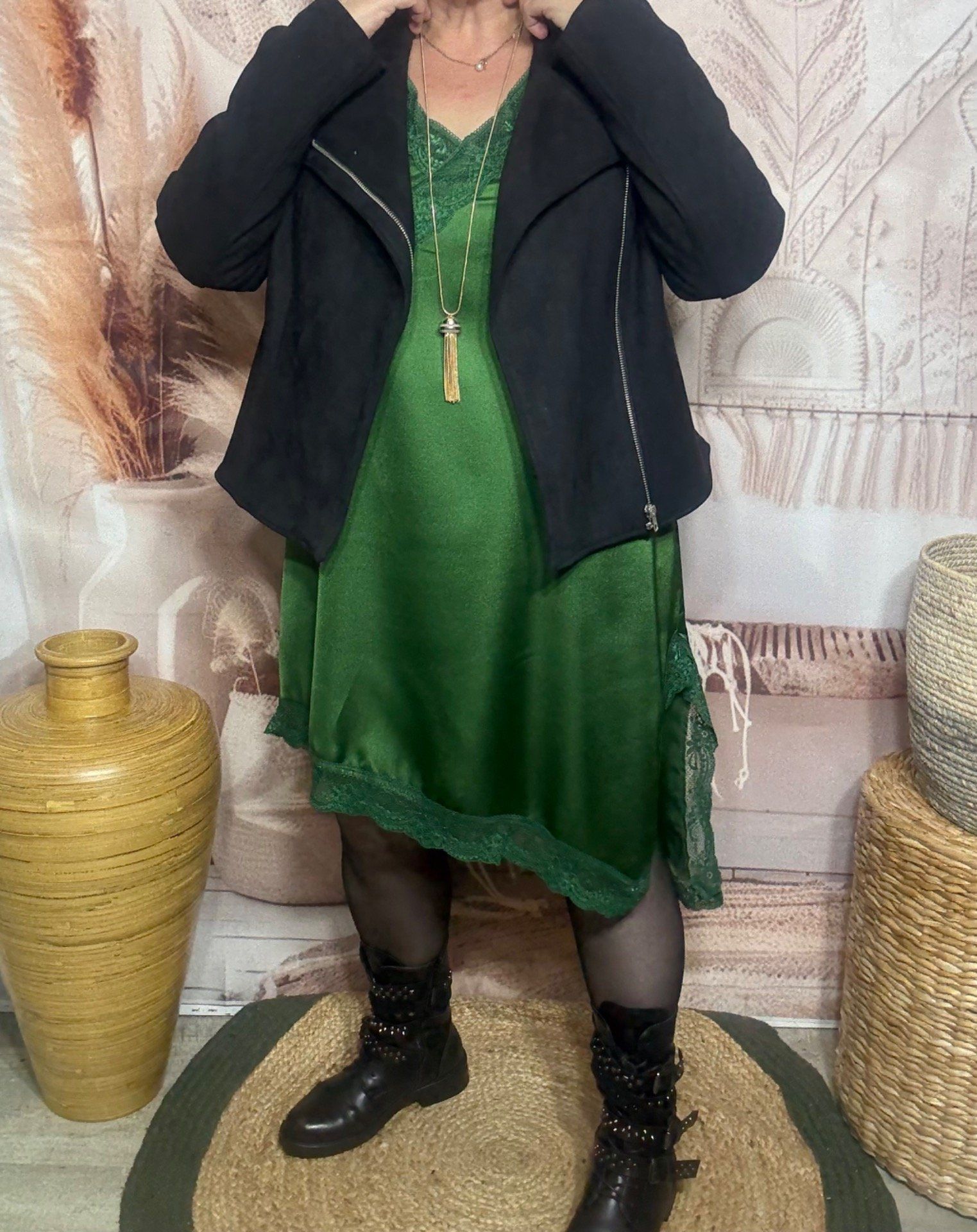 Robe nuisette asymétrique satinée vert bouteille et dentelle du 36 au 46