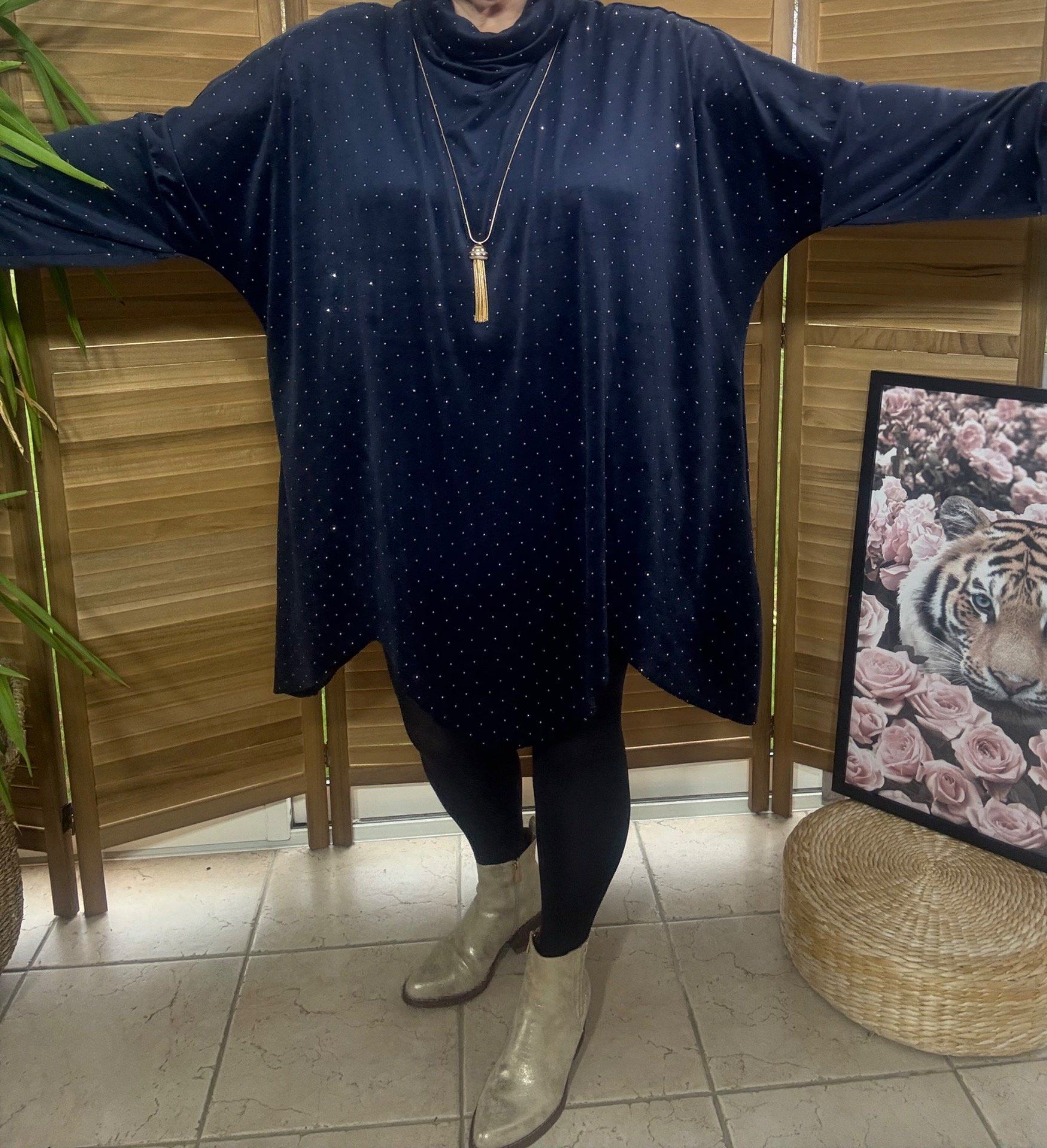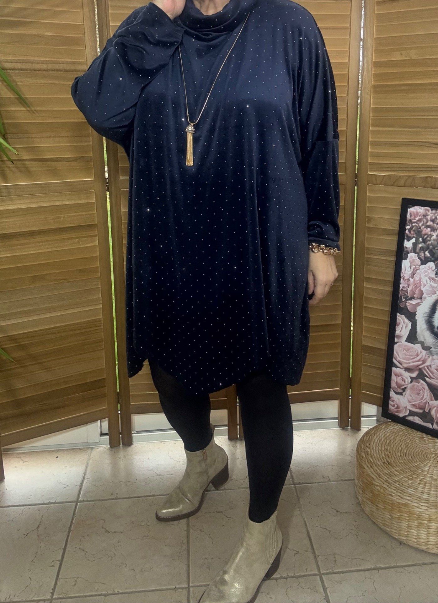 Robe ou tunique asymétrique velours ras bleu nuit strass paillettes argentées du 42 au 54/56