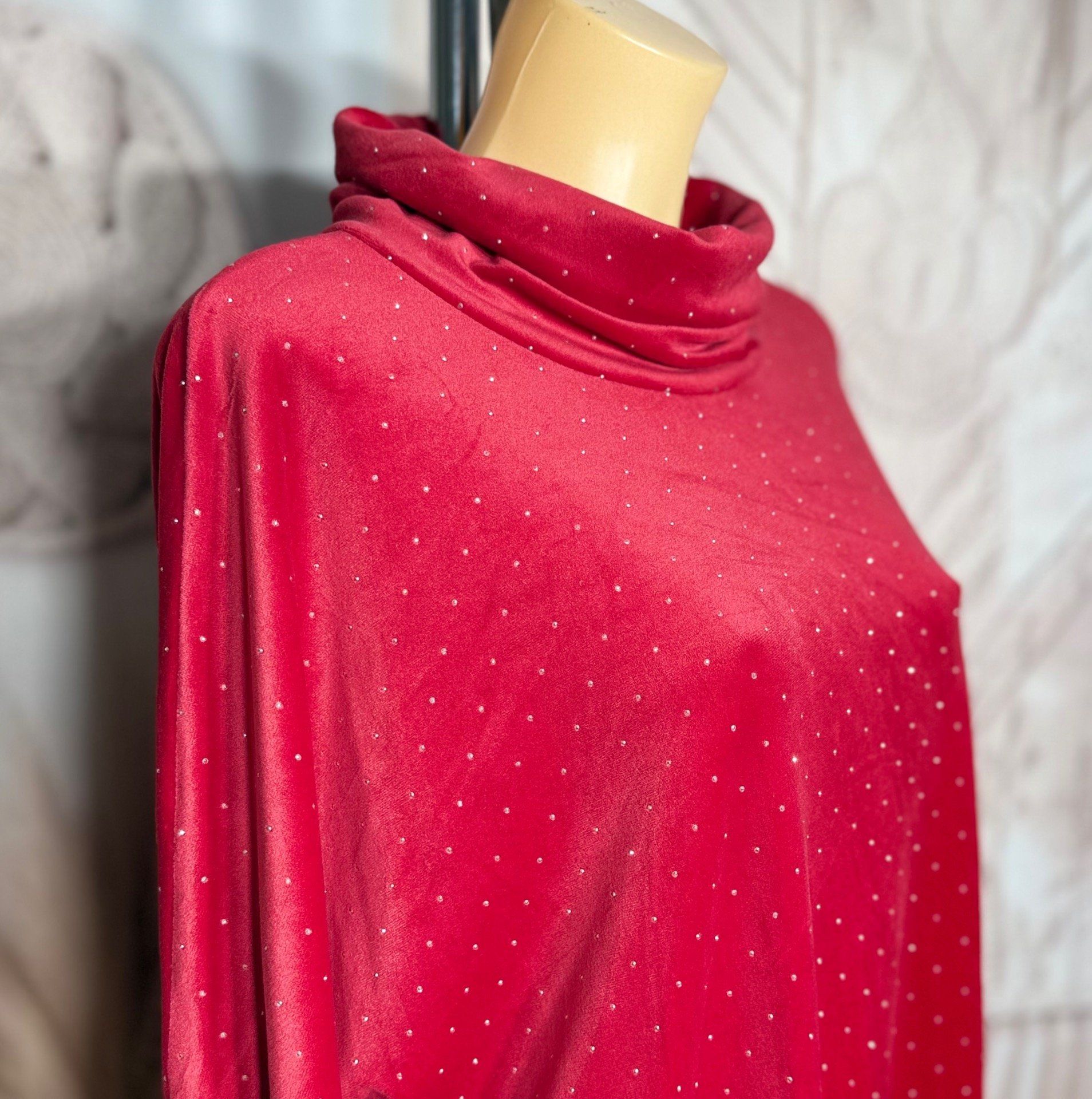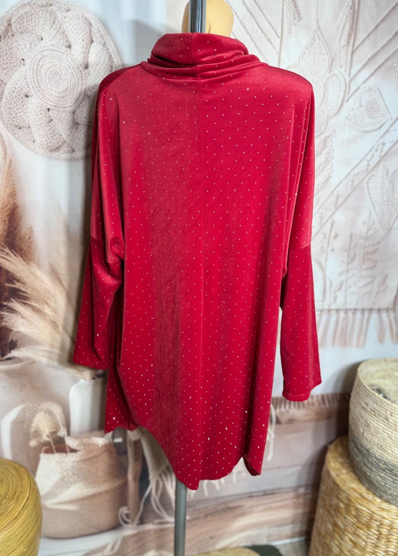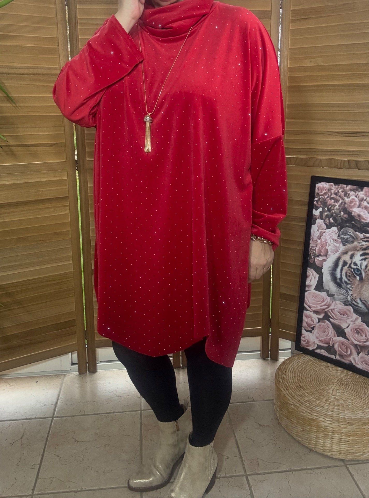Robe ou tunique asymétrique velours ras rouge strass paillettes argentées du 42 au 54/56