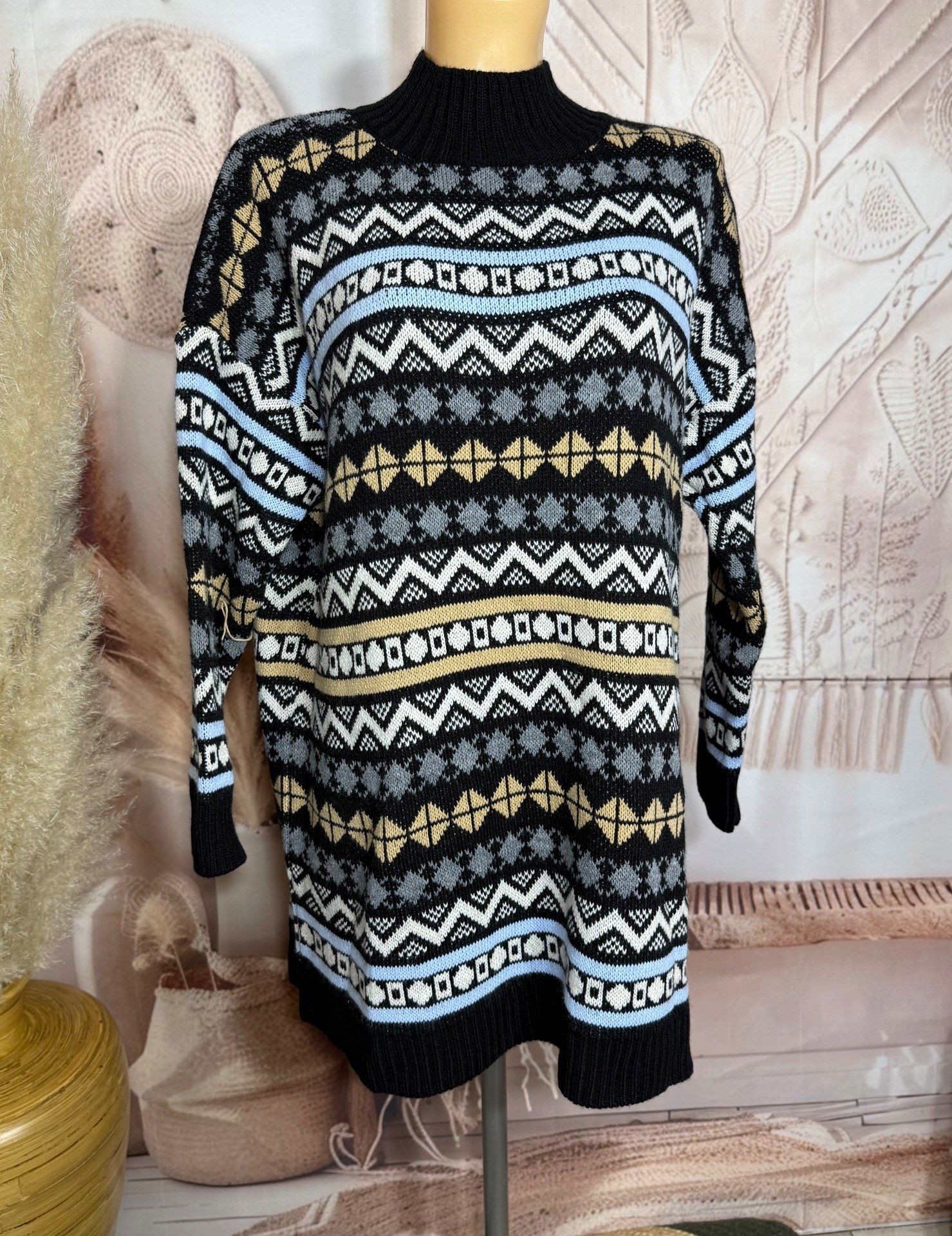 Robe-pull SANS LAINE Jacquard montagnard noir beige écru gris ciel du 34 au 46/48
