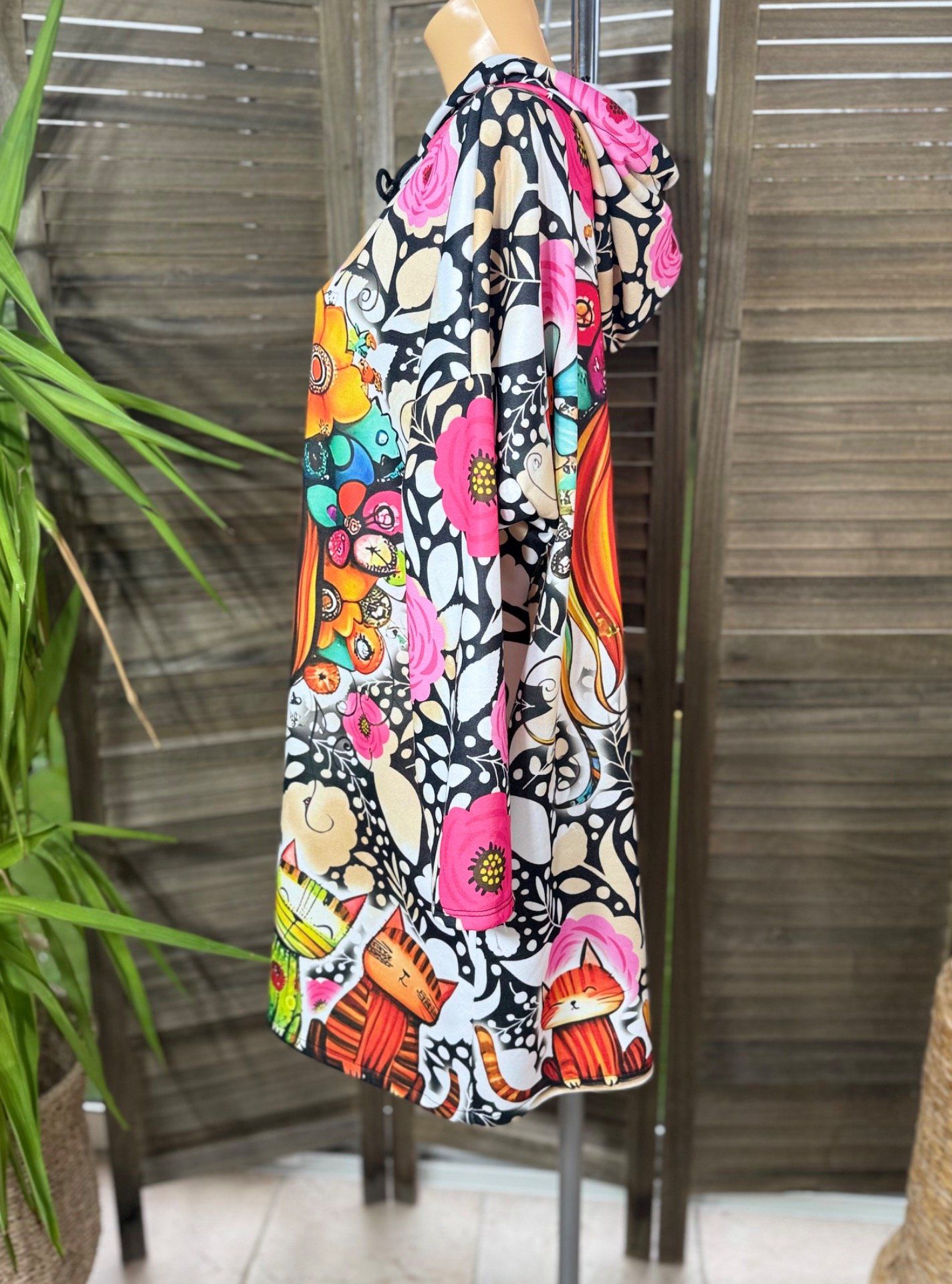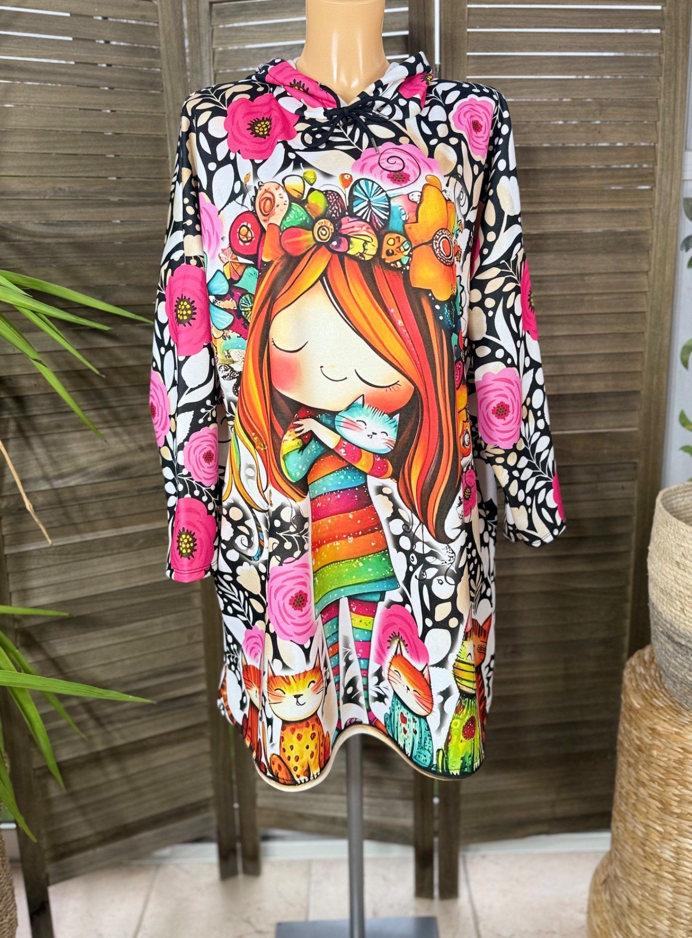 Robe-sweat trapèze à capuche multicolore La Fillette et ses chats du 40 au 50/52