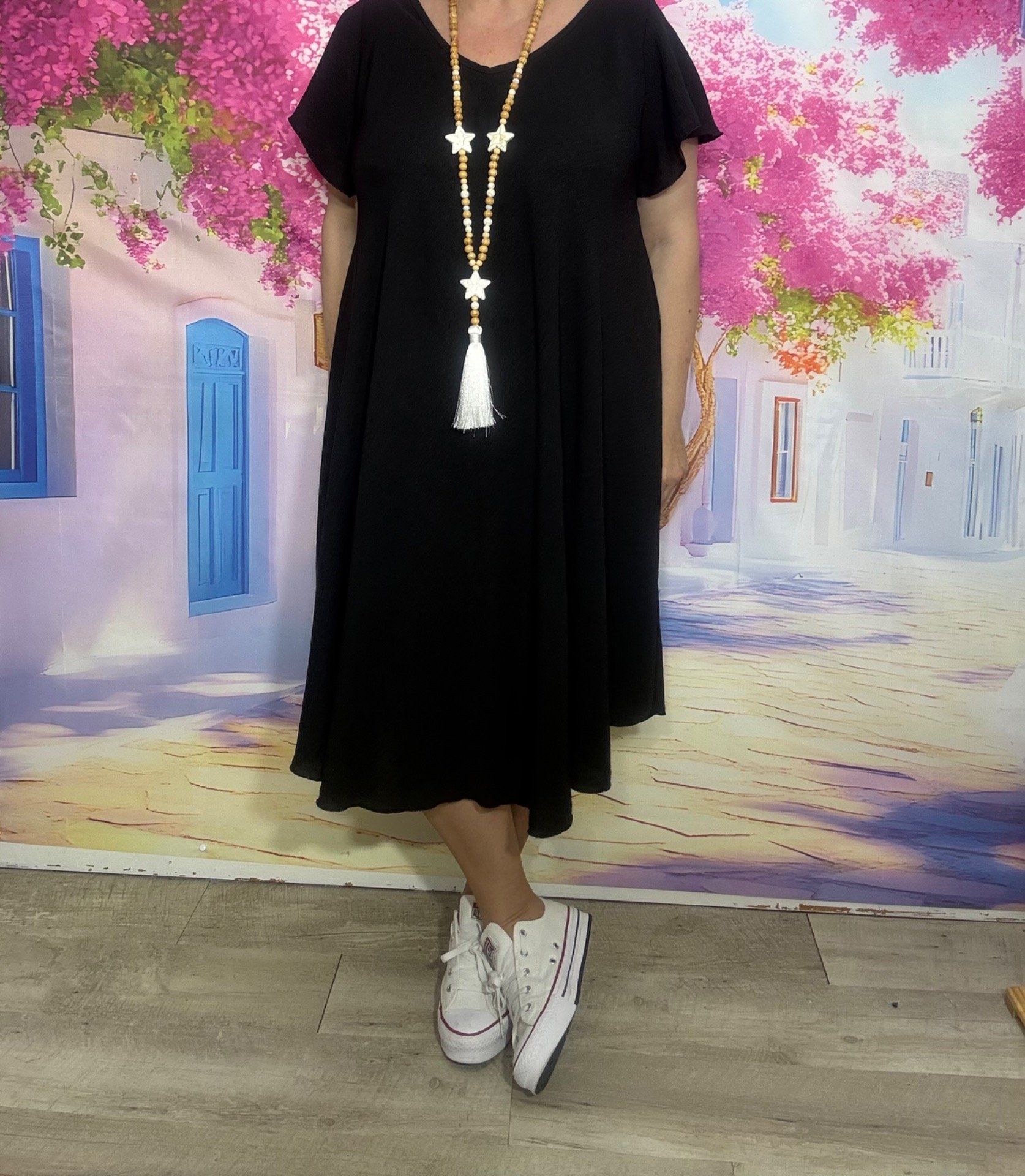 Robe trapèze mi-longue noire manches courtes volantées douceur ++++ du 38 au 50