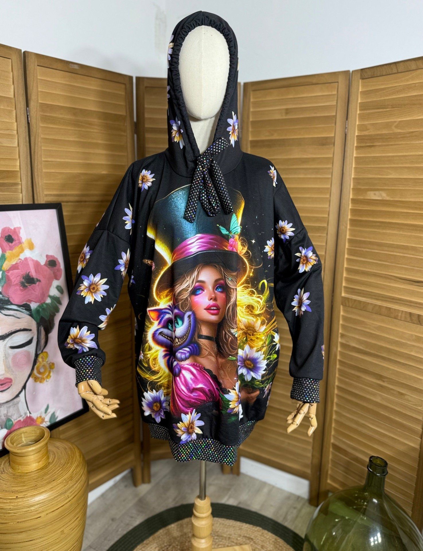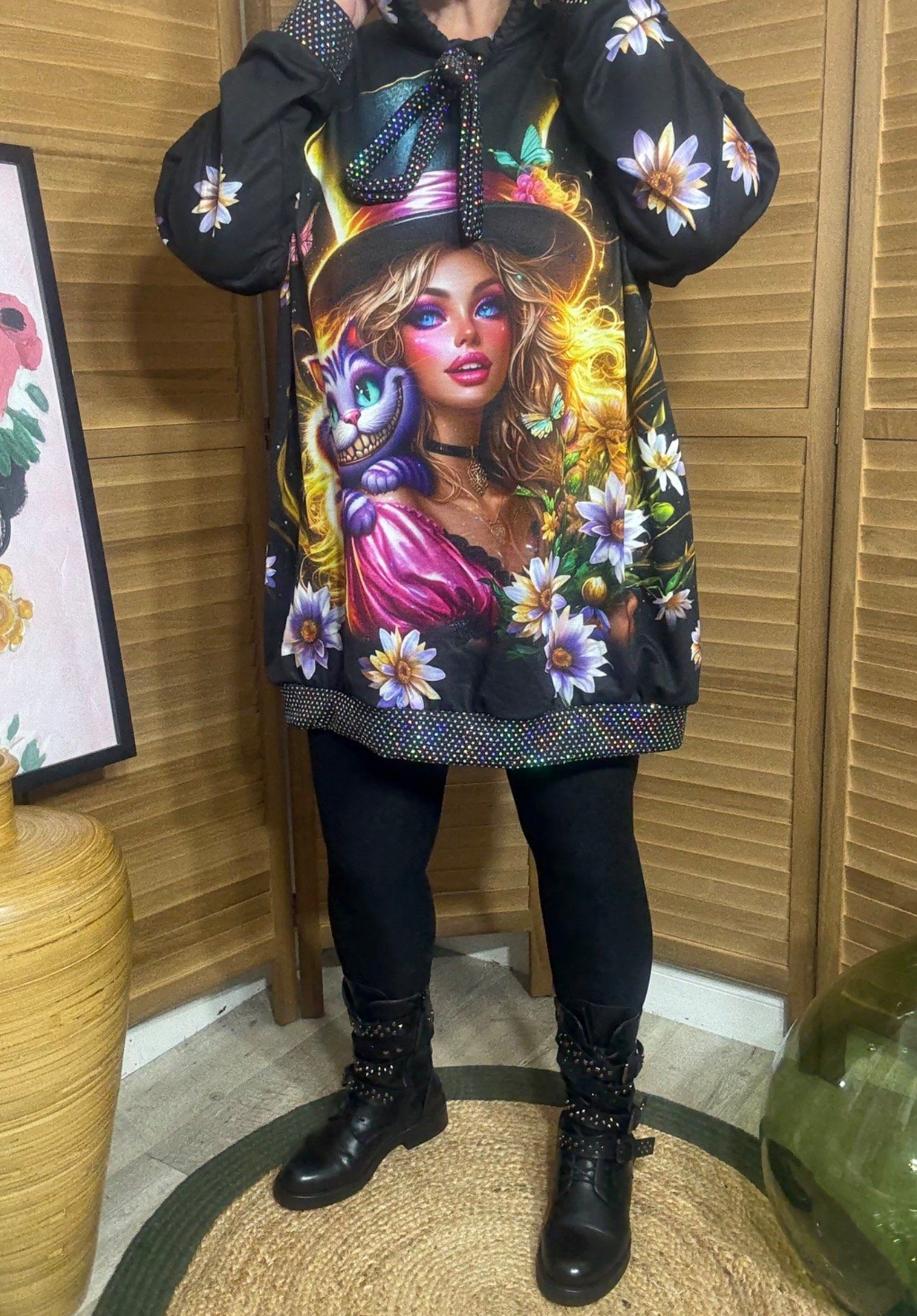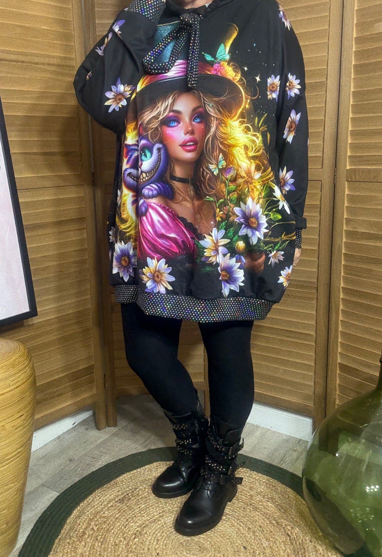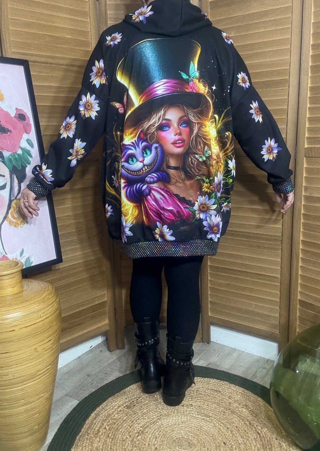 Sweat à capuche long noir Alice in Wonderland paillettes du 40 au 50/52