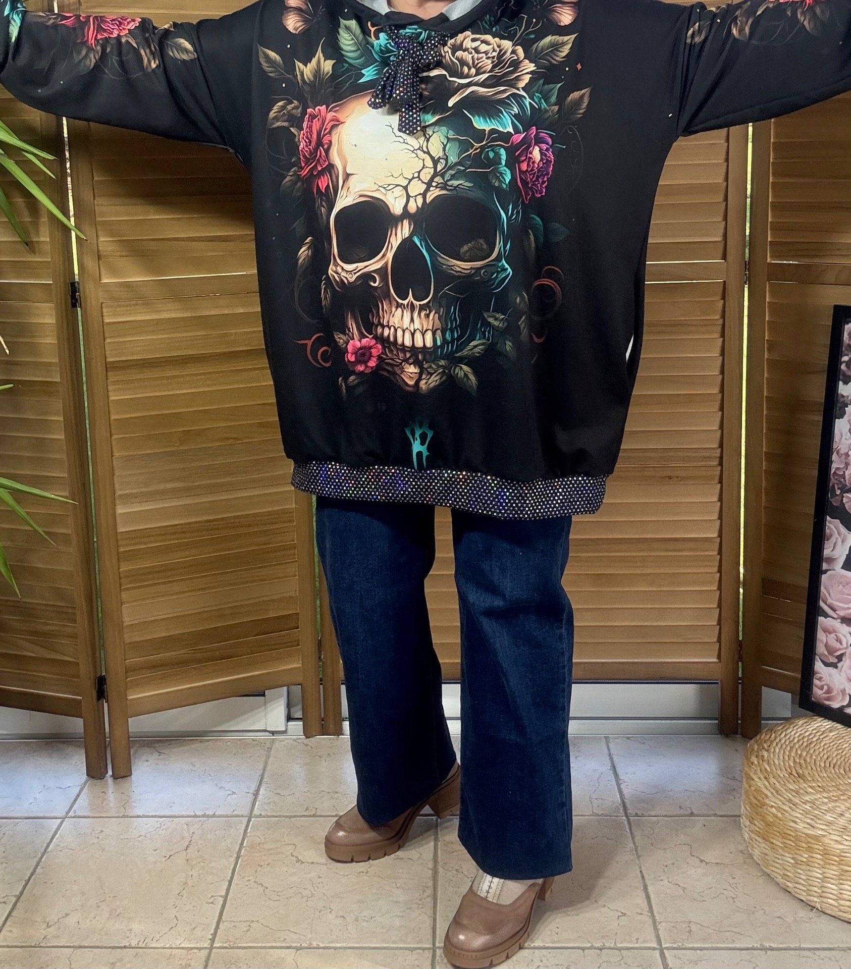 Sweat à capuche long noir Skulls & Pink Flowers paillettes du 40 au 50/52