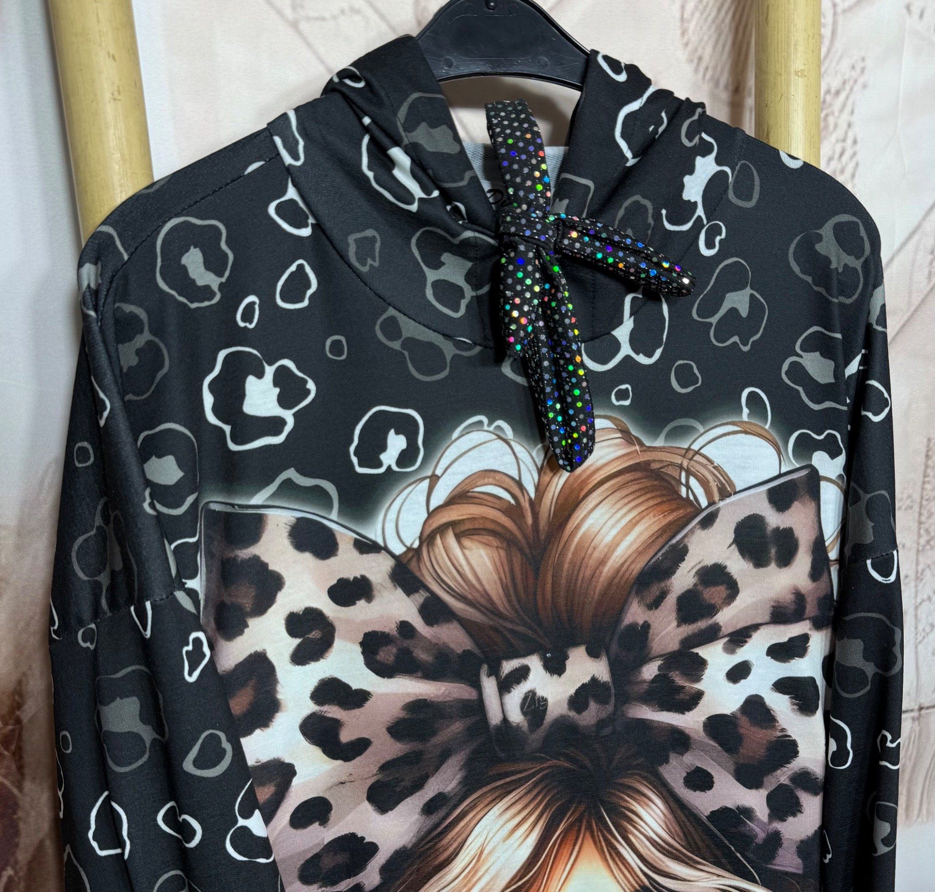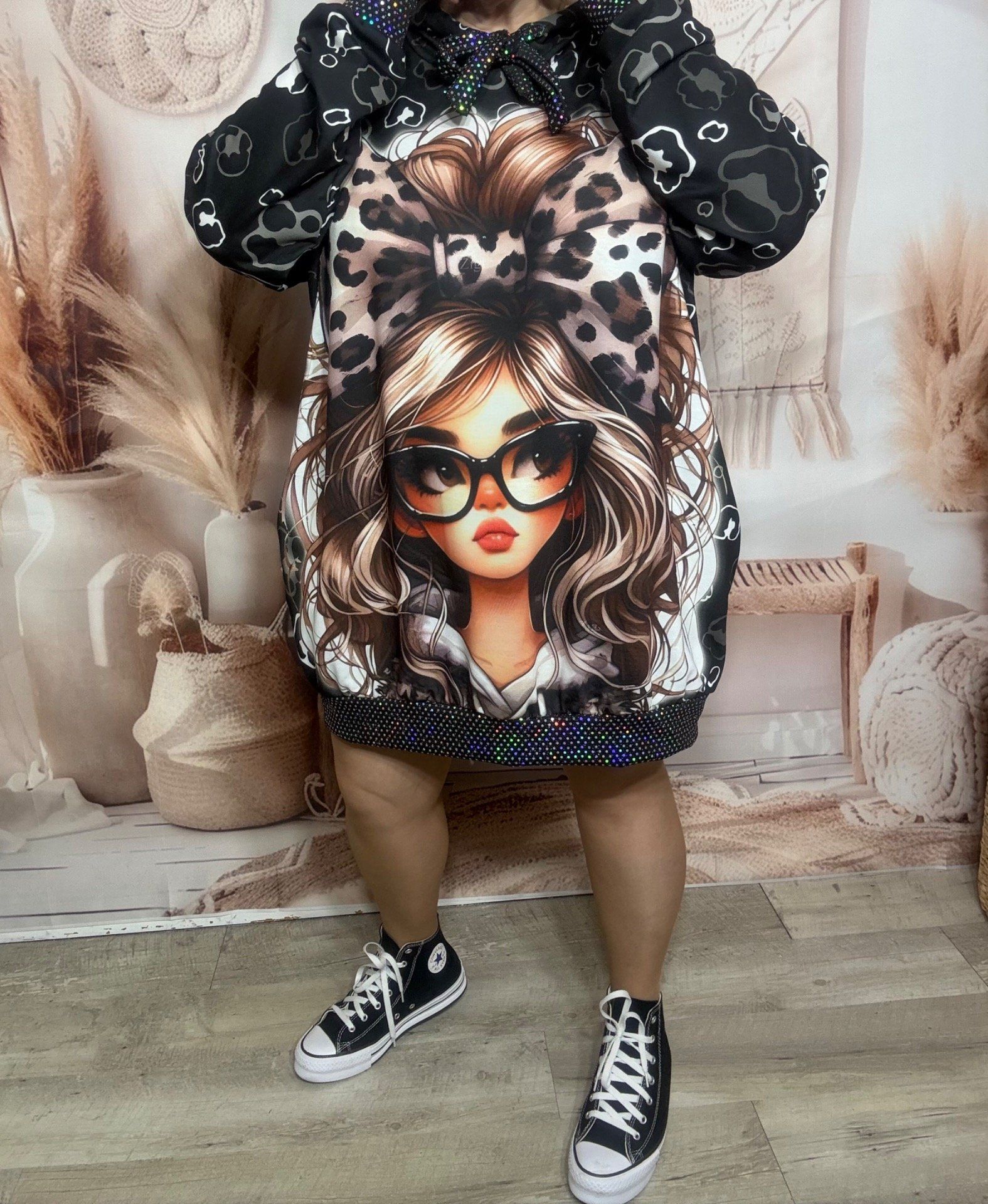 Sweat à capuche long noir The Fashion Leopard Pretty Girl paillettes argentées du 40 au 50/52