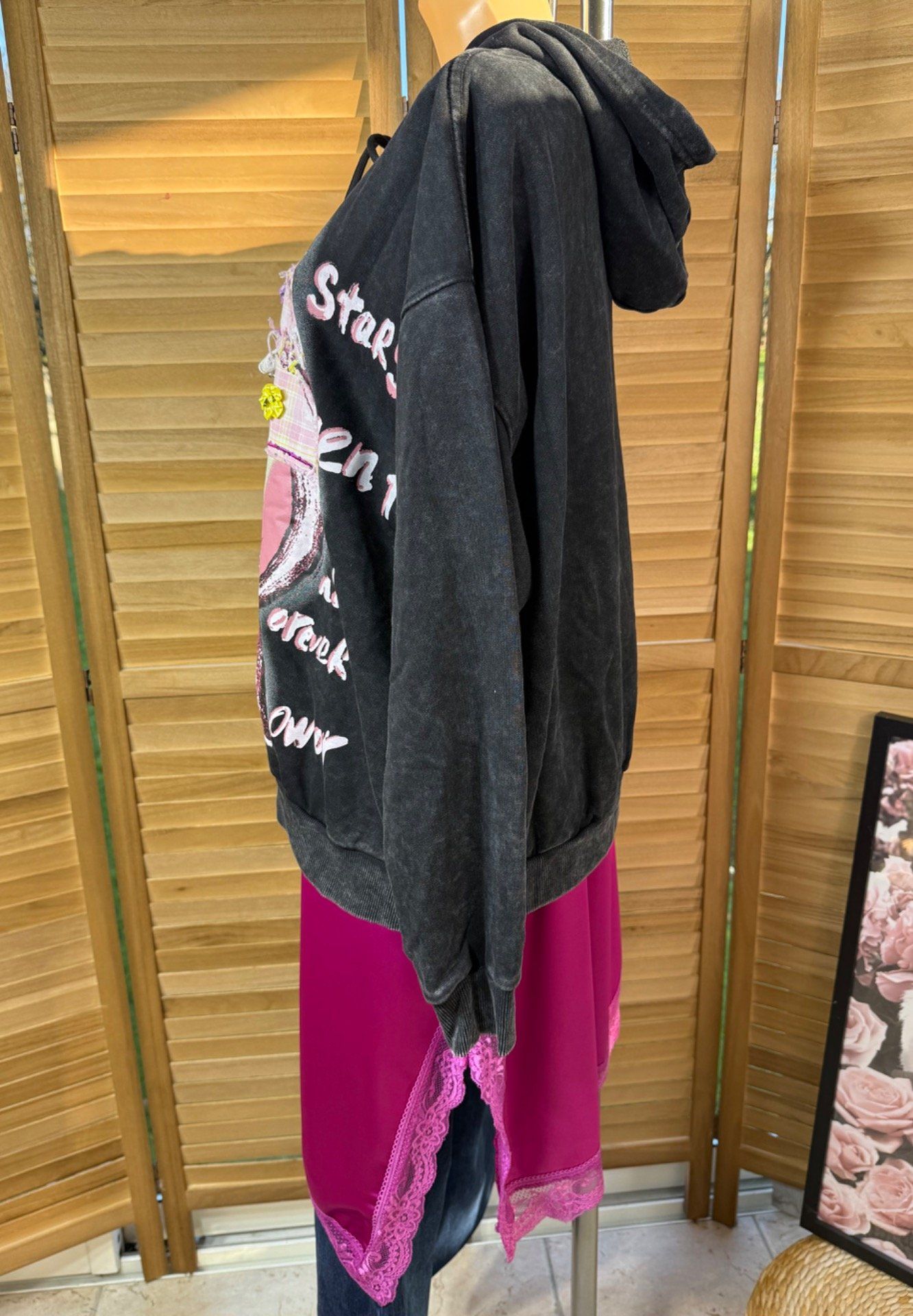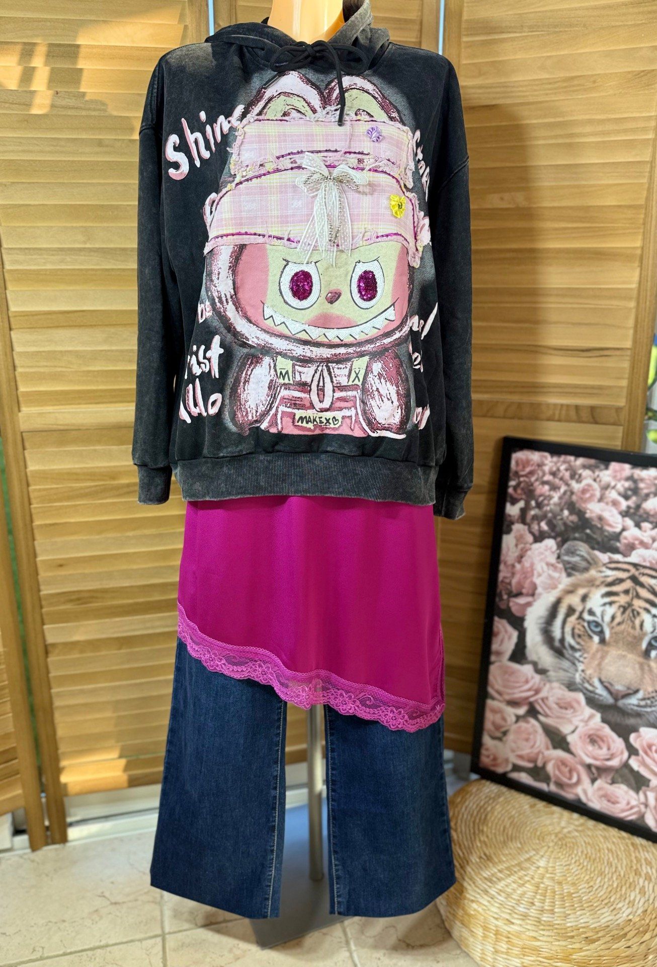 Sweat à capuche noir délavé Labubu & sequins strass perles noeuds en relief du 38 au 50