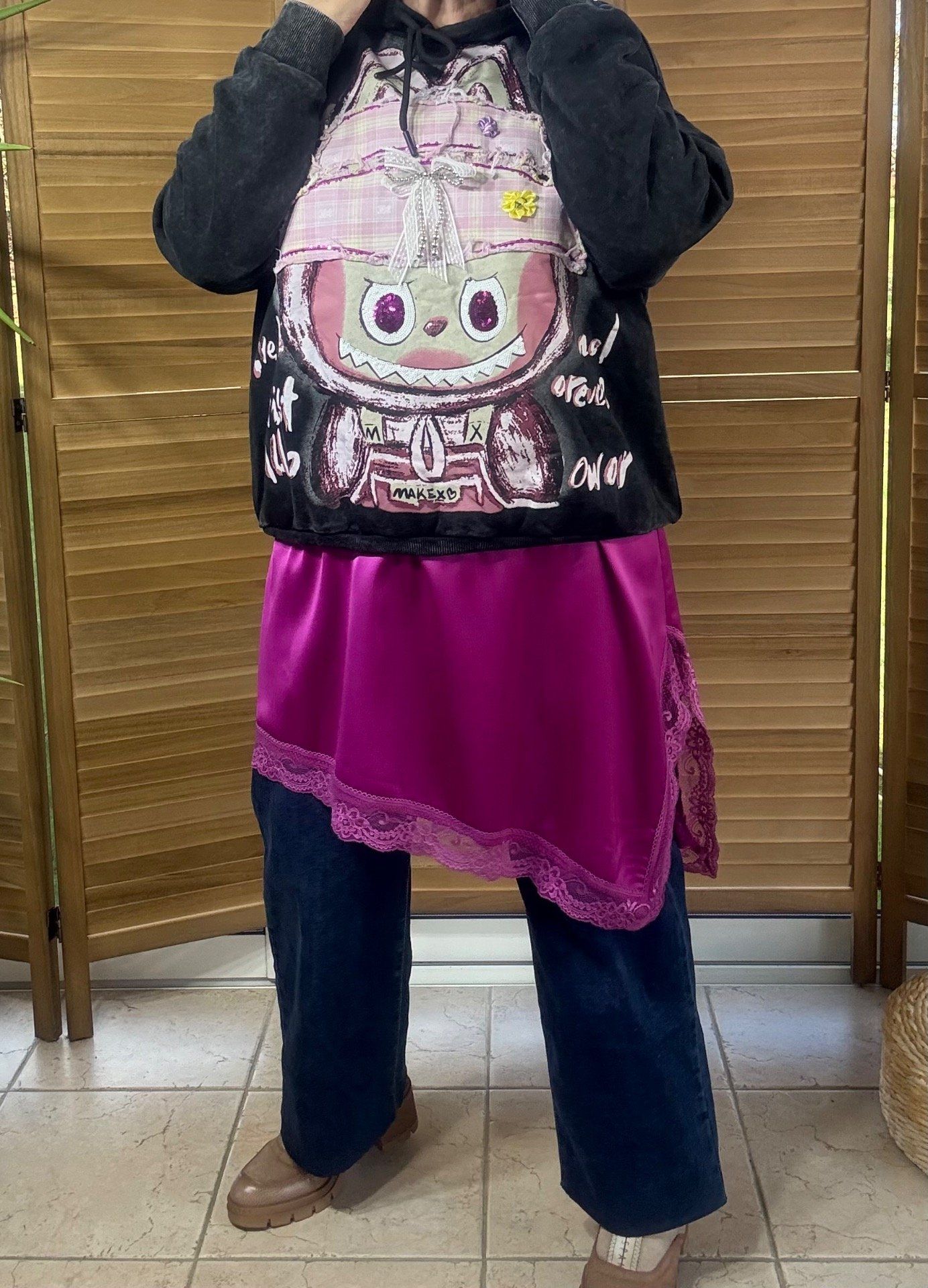 super imprimé Labubu avec plein de détails trop craquants : sequins brillants fuschia, des petits noeuds satinés en relief, un noeud en guilrande de perles argentées, de la dentelle...