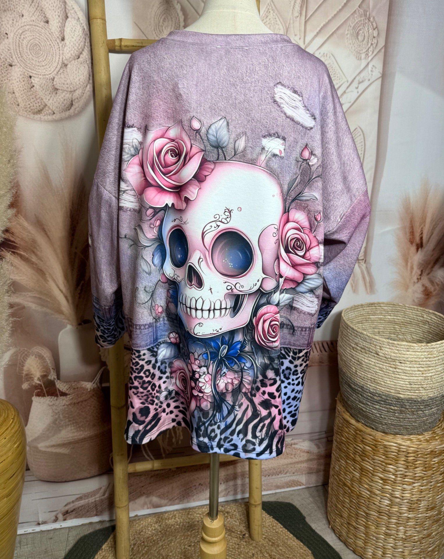 Sweat ample violine marbré Mexican Skulls Calavera & Pink Roses du 40 au 52/54
