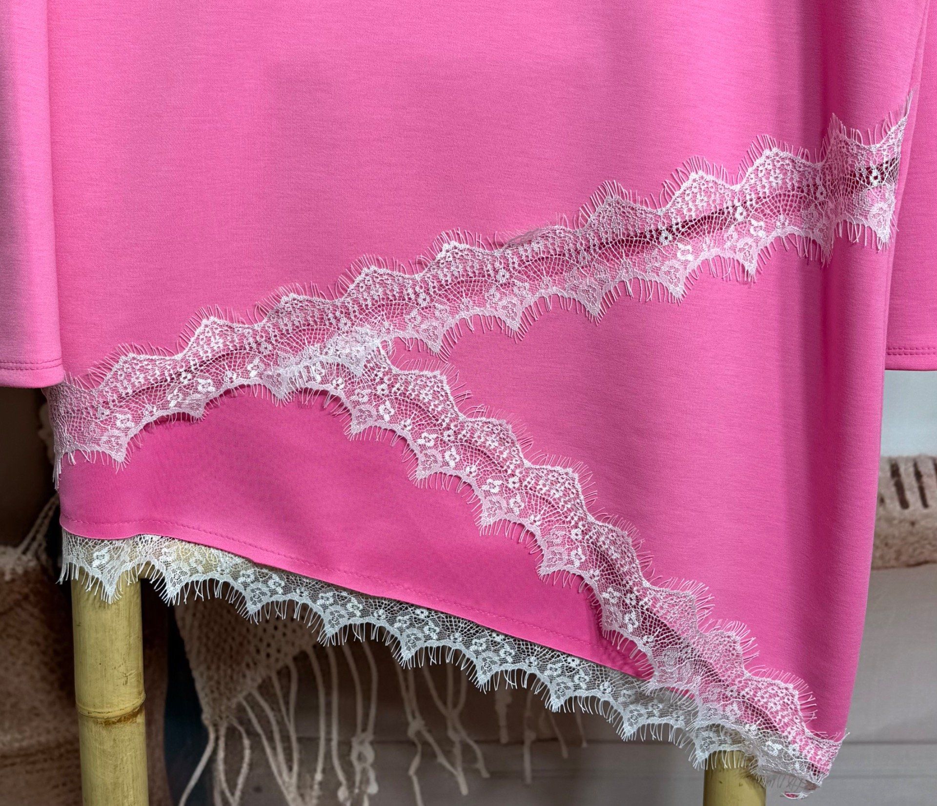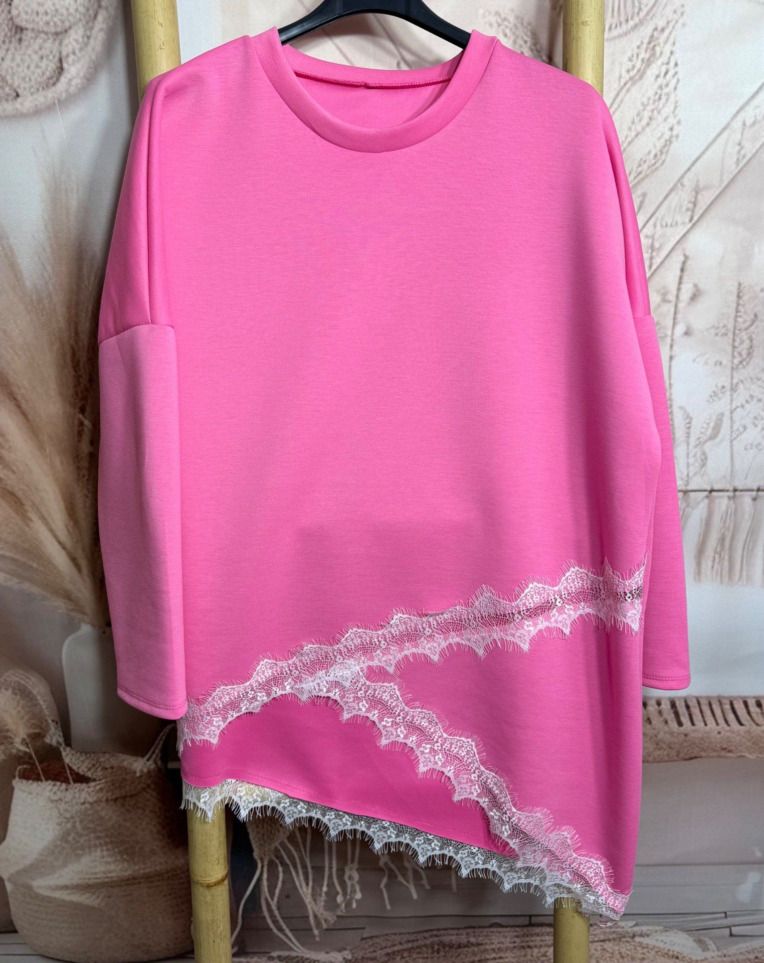 Sweat asymétrique long fuschia col rond et dentelle blanche du 38 au 50