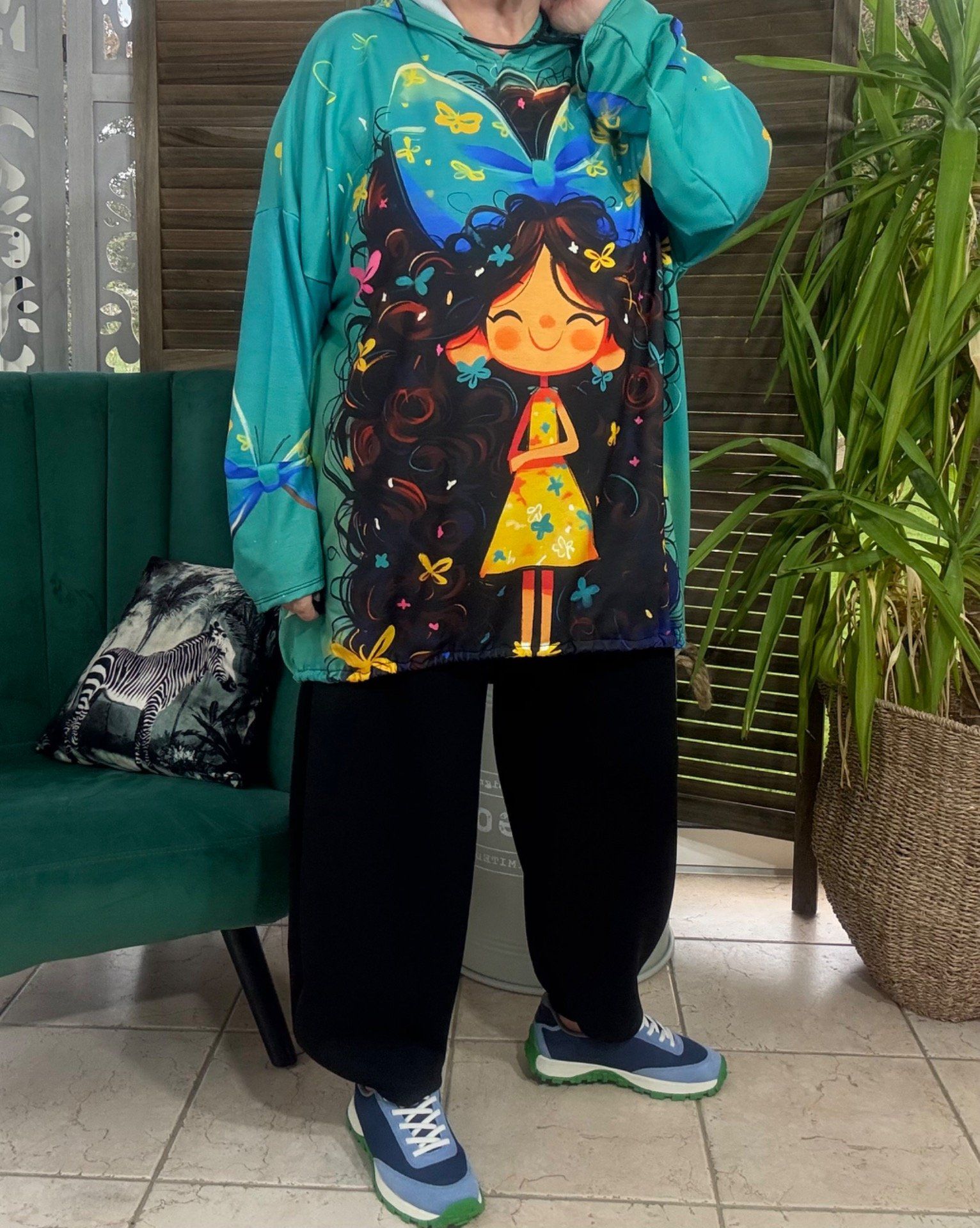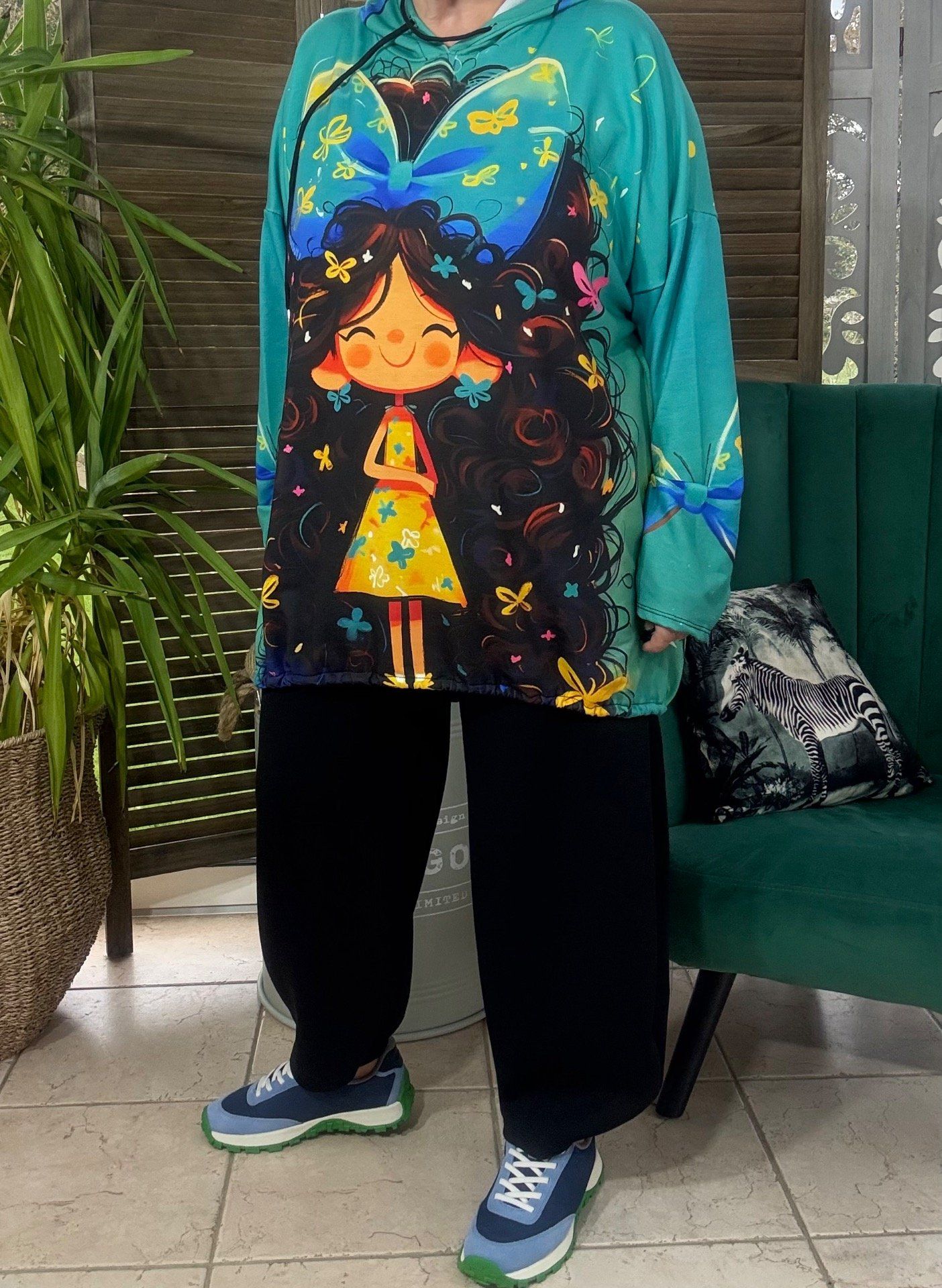 Sweat fin à capuche long bleu La Fillette au noeud bleu