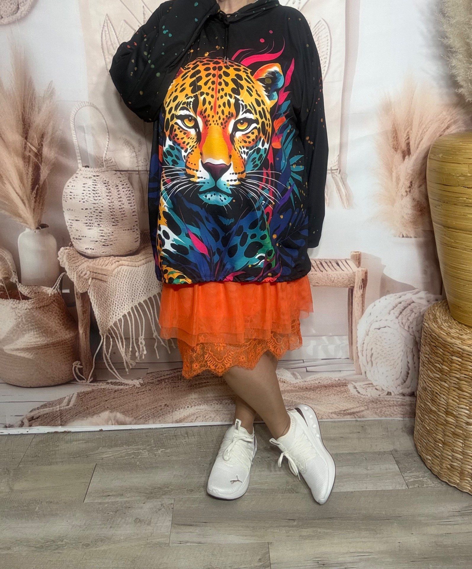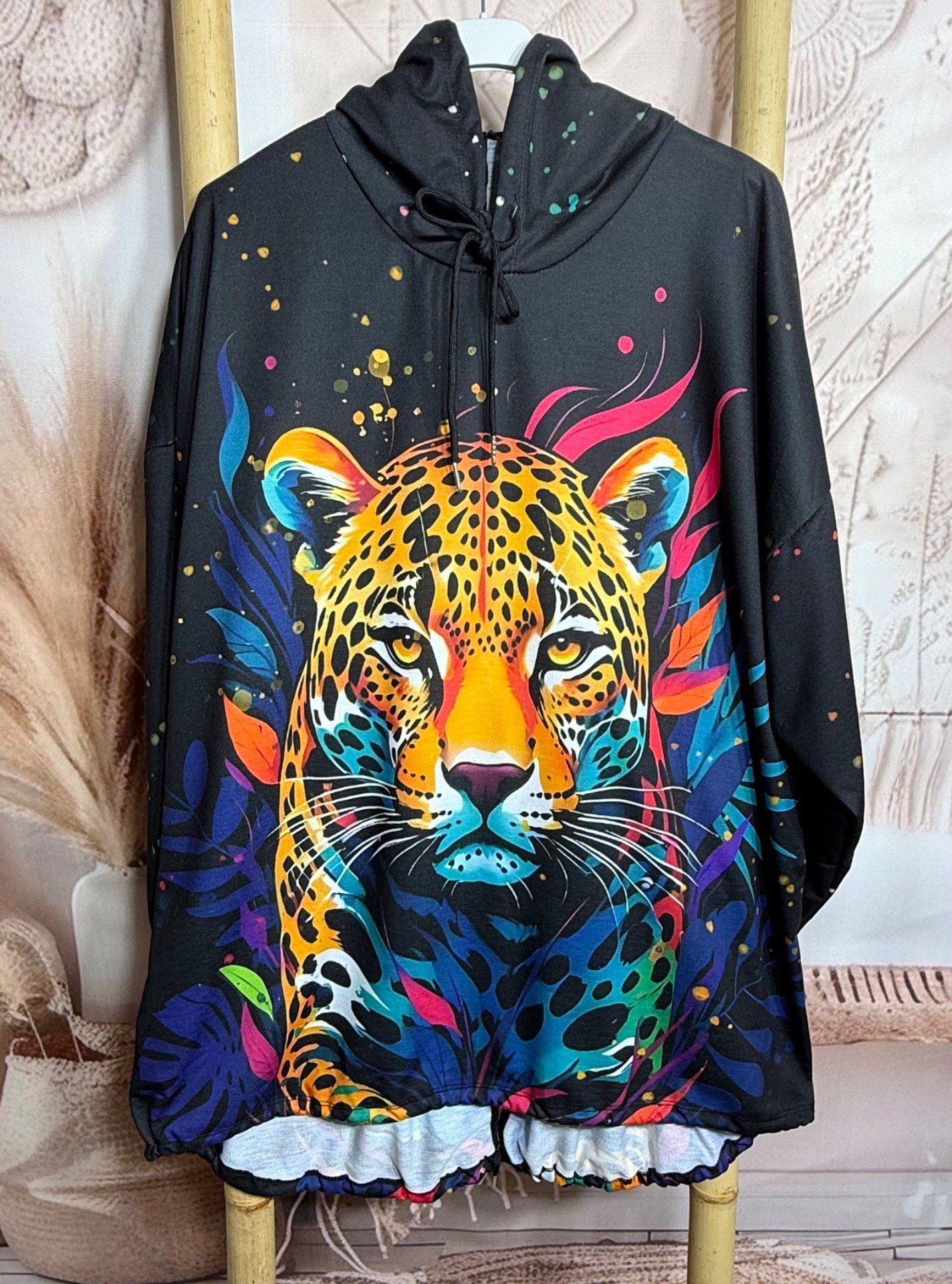 Sweat fin à capuche long noir Le Majestueux Tigre multicolore du 40 au 52/54
