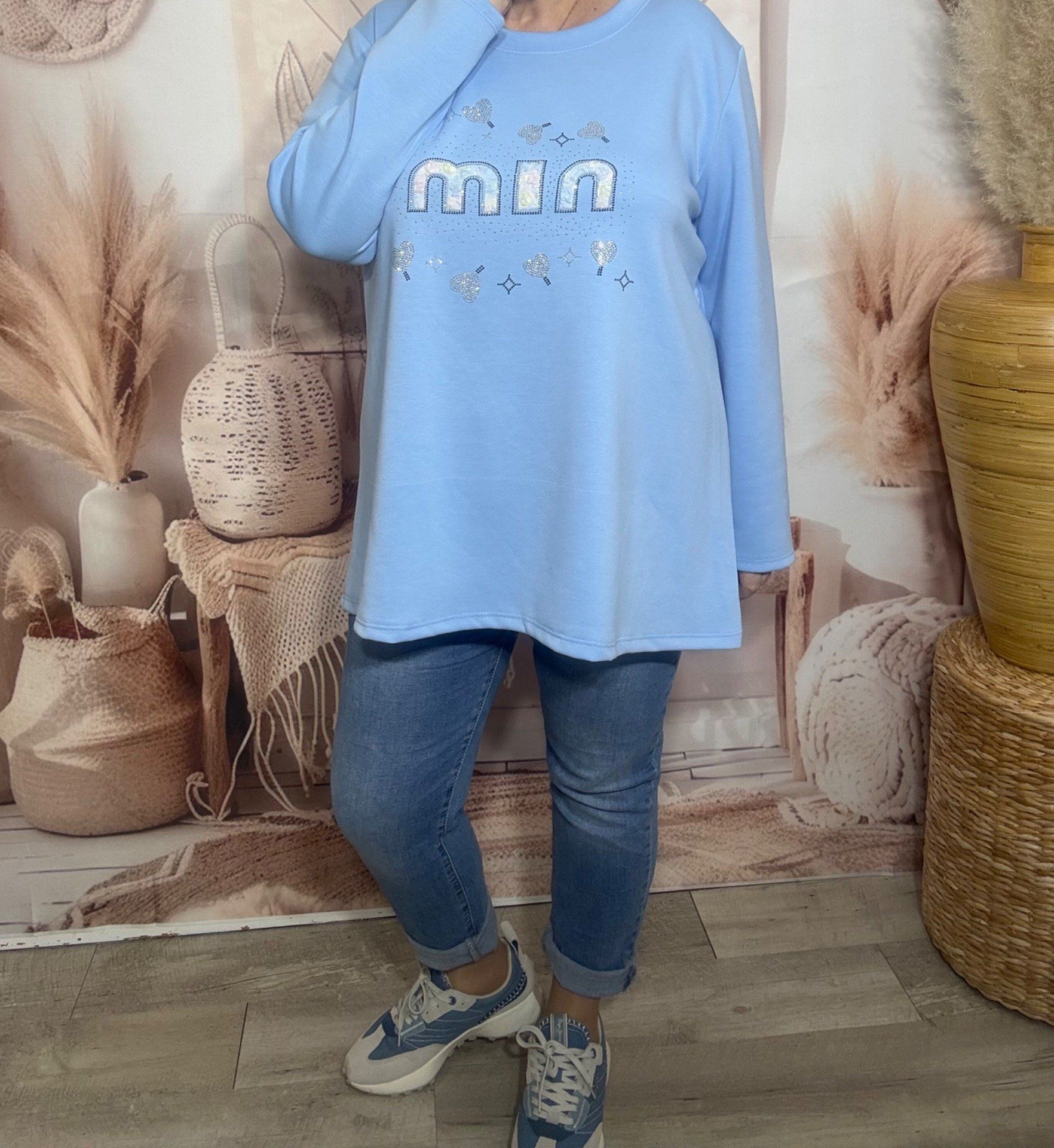 Sweat trapèze ample bleu ciel Min dentelle arc-en-ciel et strass argentés du 38 au 48/50