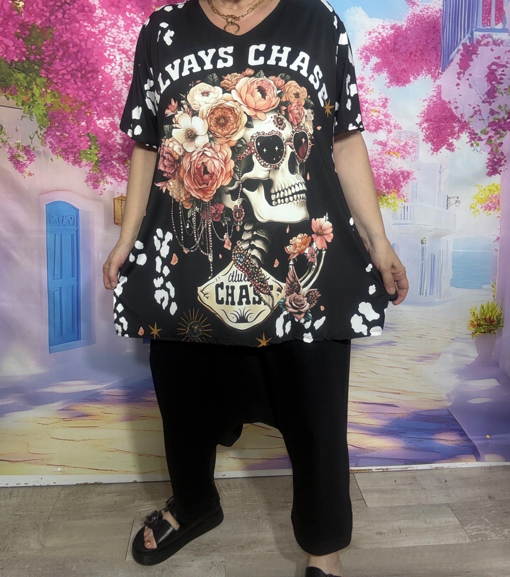 Tee-shirt fin trapèze oversize lycra noir Skulls TDM & Pink Roses du 42 au 54/56