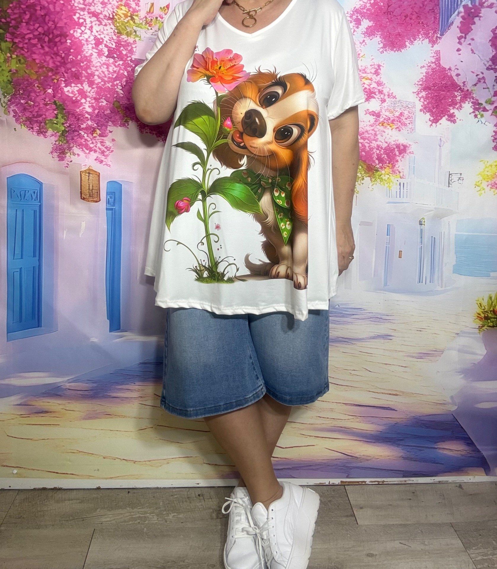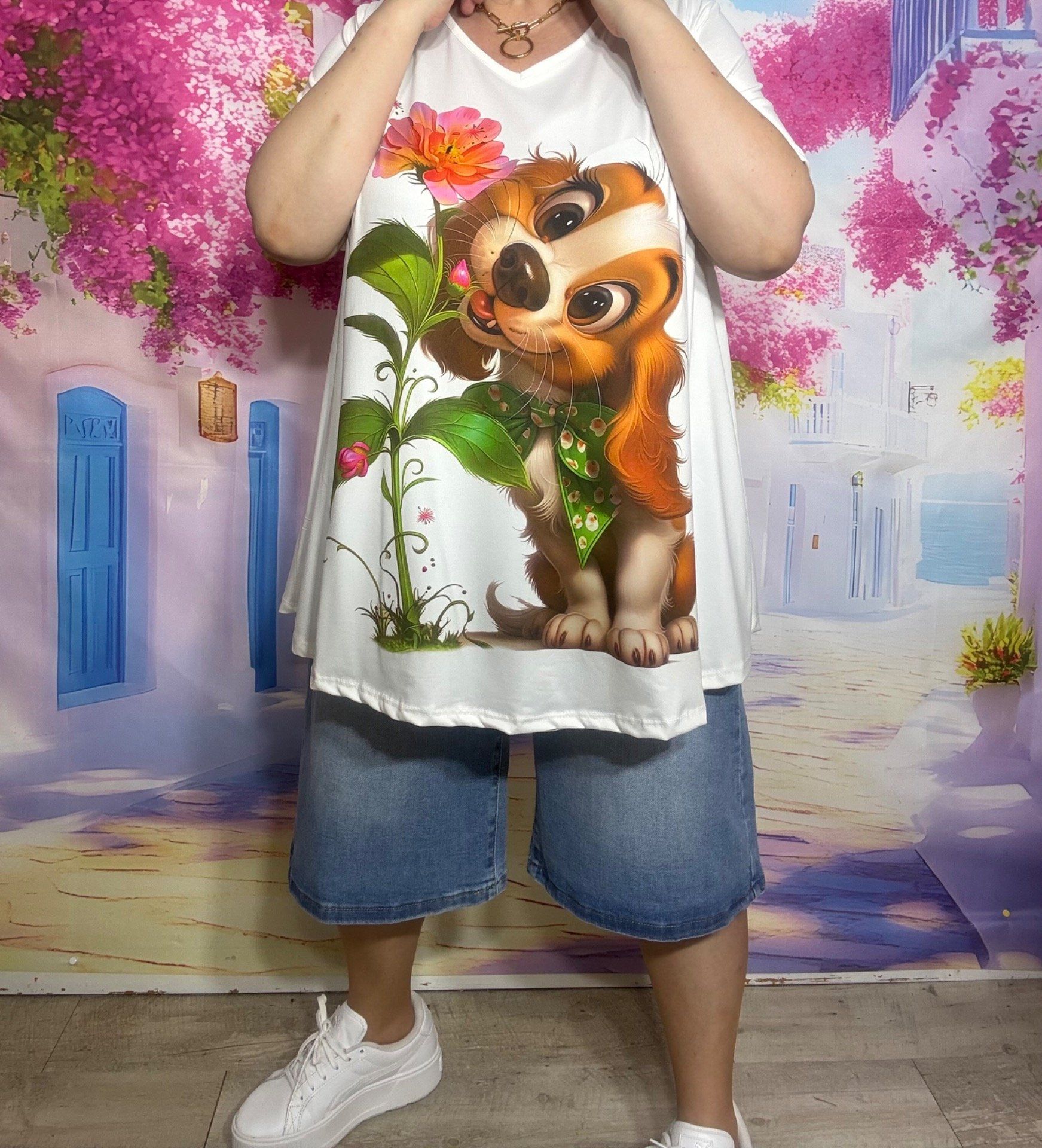 Tee-shirt trapèze écru manches courtes Col V L'adorable chien à la Fleur du 40 au 54