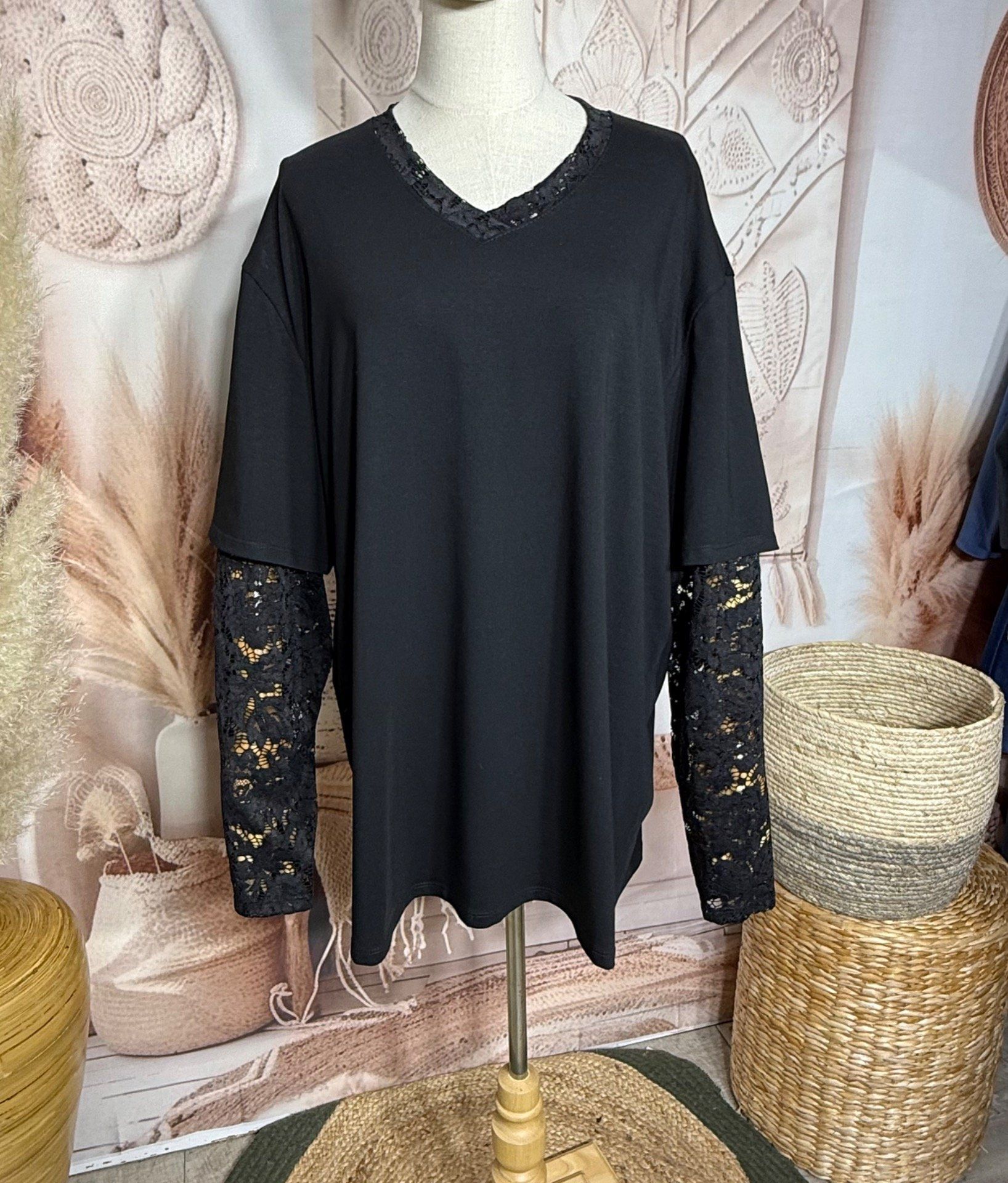 Top "2 en 1" col et manches longues en dentelle noire qualité +++ du 40 au 52/54