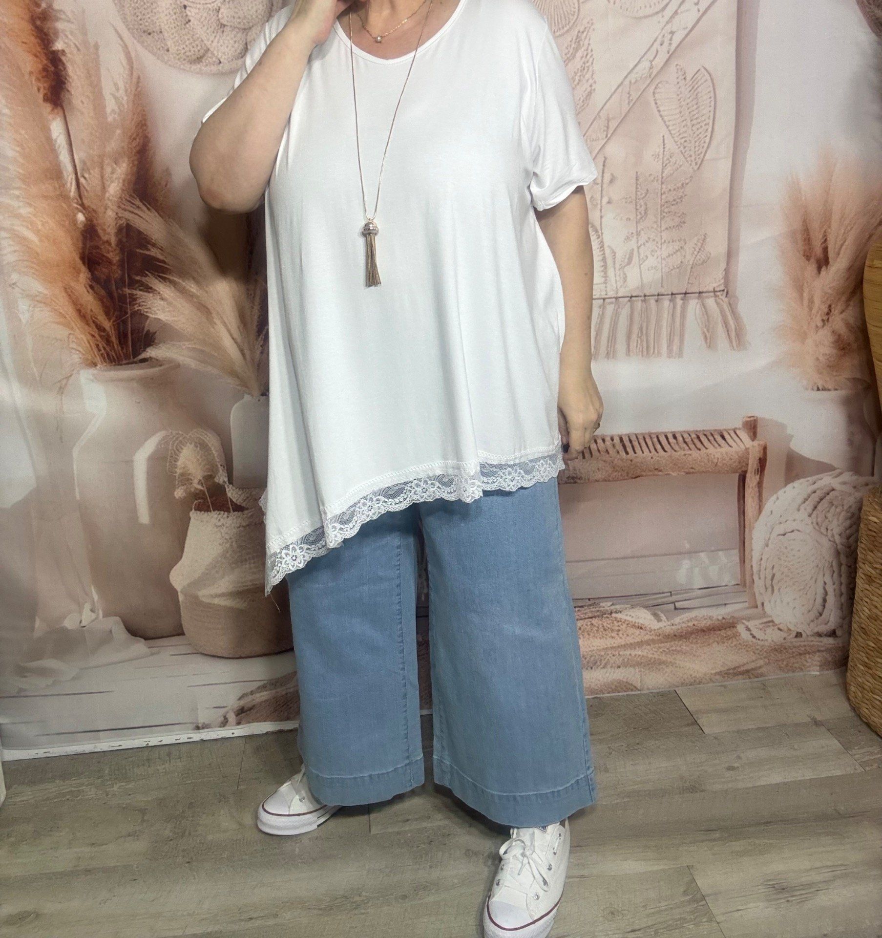 Top ample asymétrique blanc manches courtes & dentelle en bas douceur +++