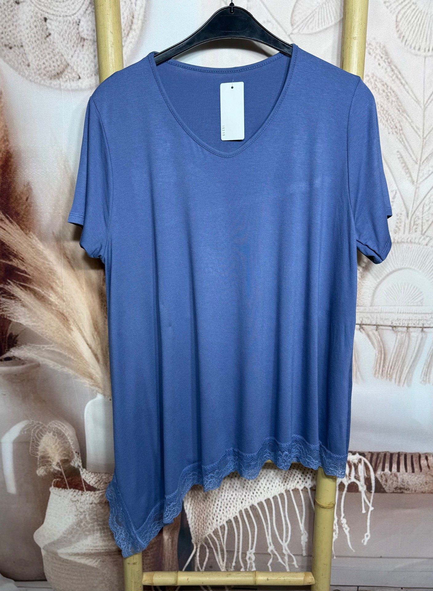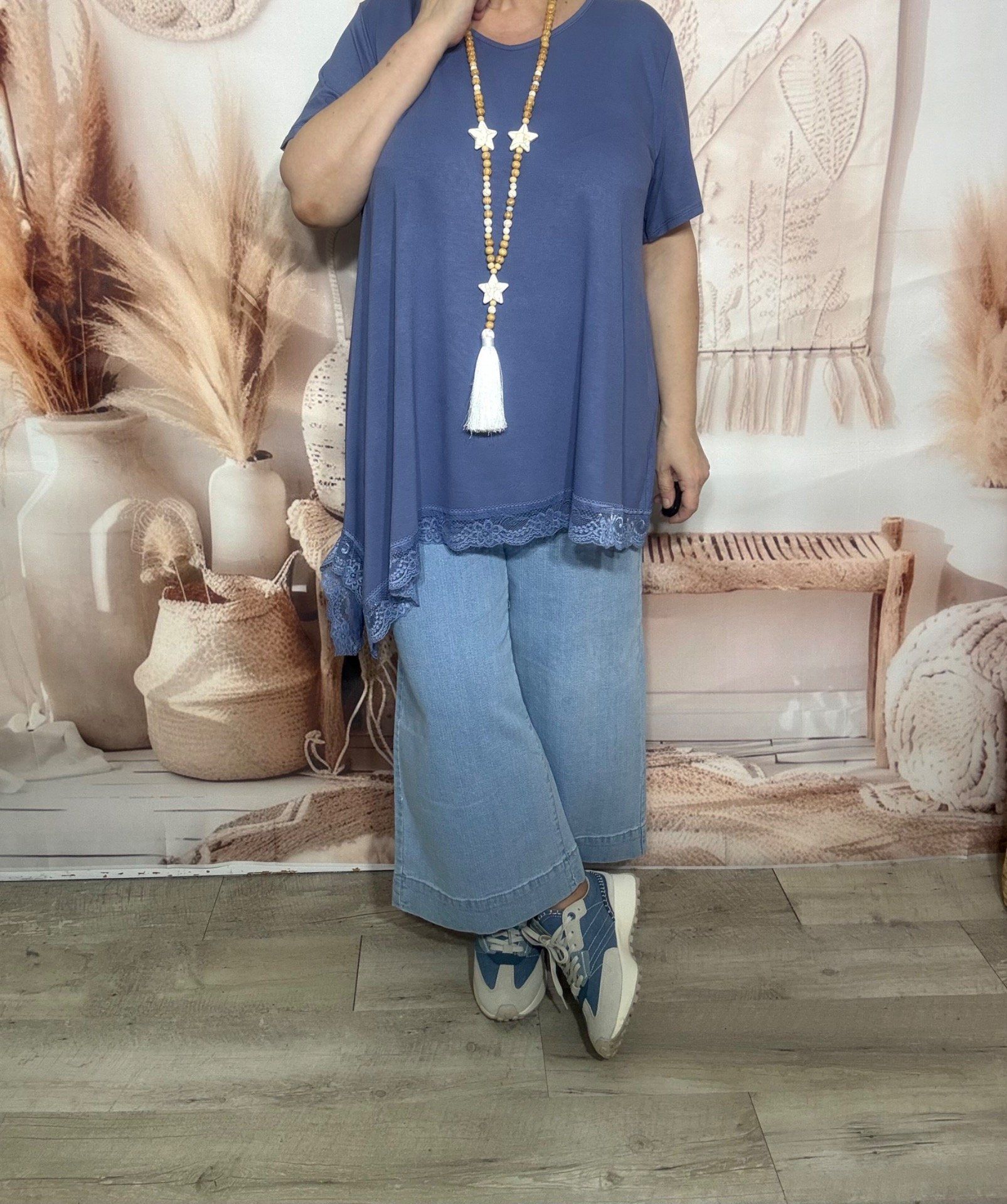 Top ample asymétrique bleu jeans manches courtes & dentelle en bas douceur +++ du 40 au 52/54