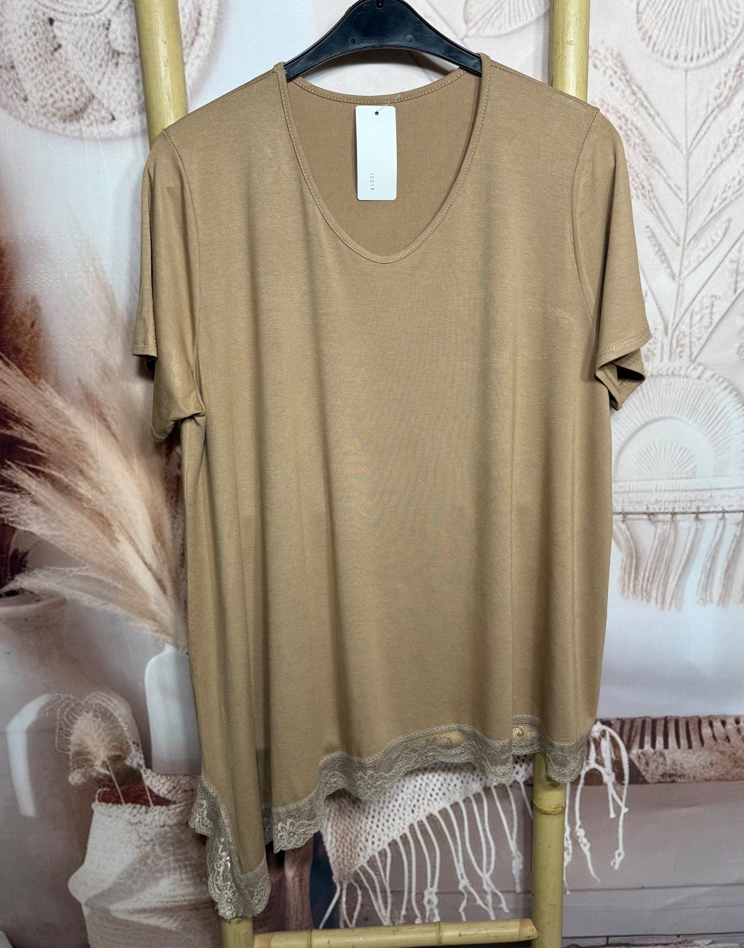 Top ample asymétrique Camel manches courtes & dentelle en bas douceur +++ du 40 au 52/54