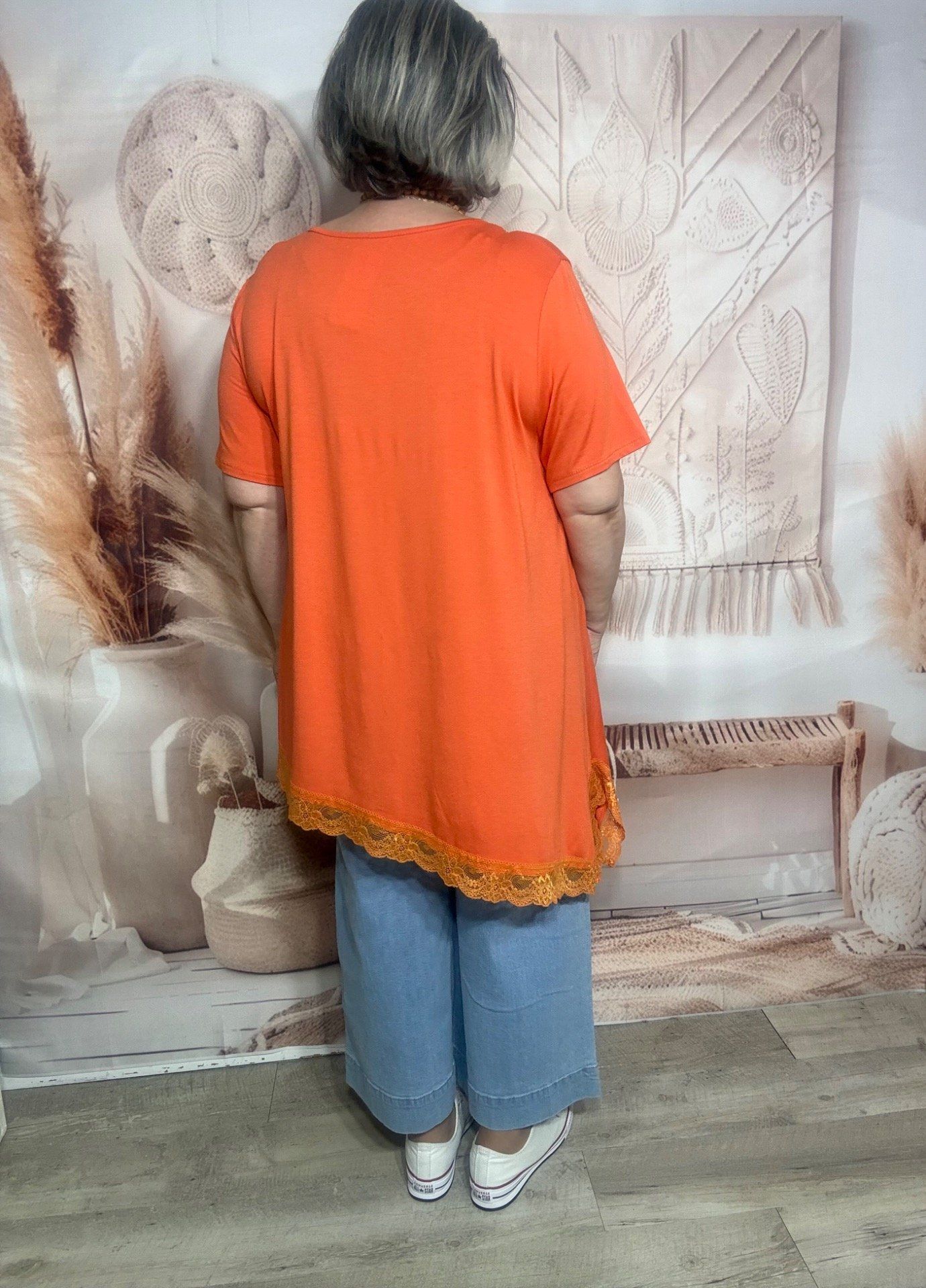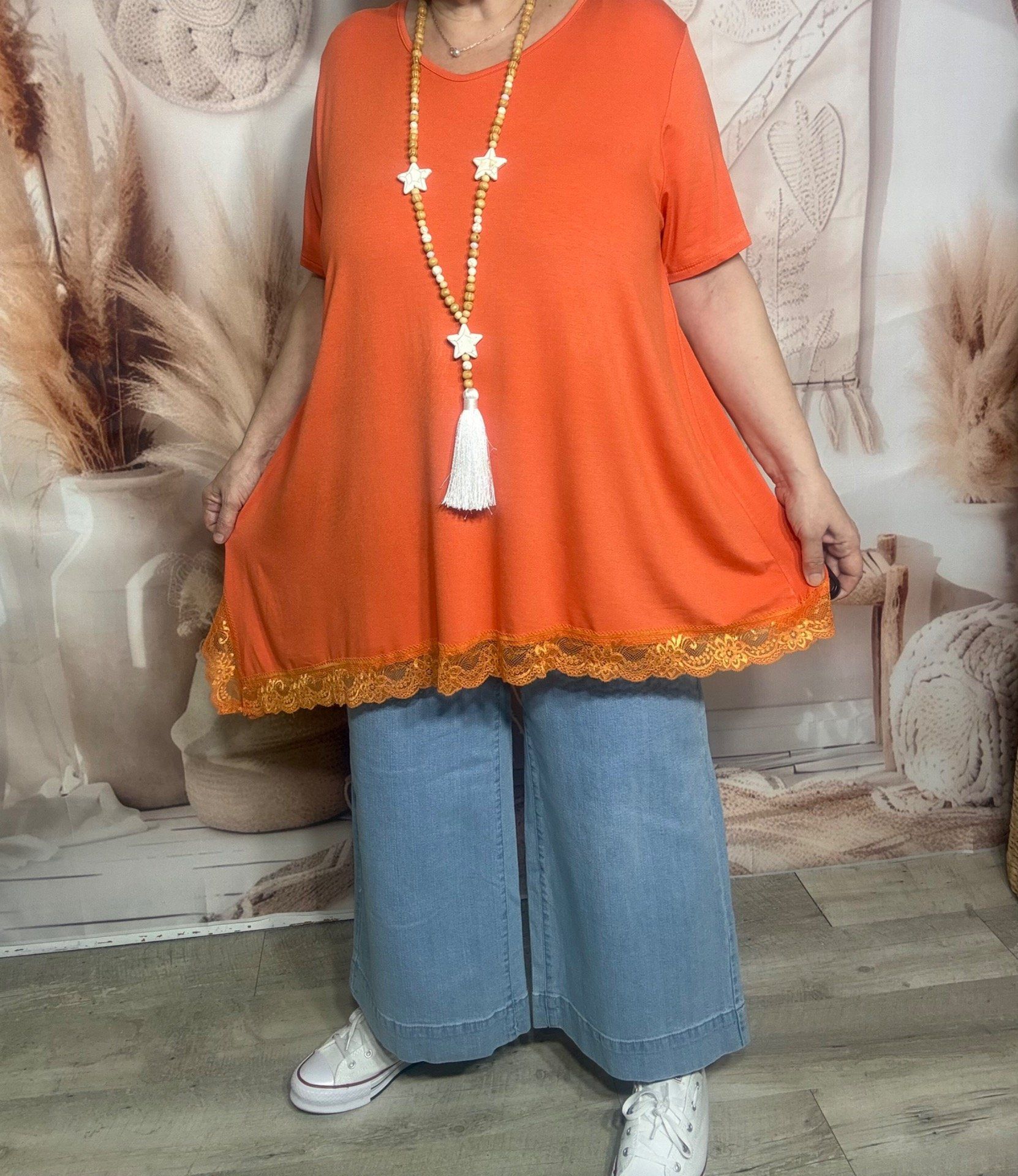 Top ample asymétrique orange manches courtes & dentelle en bas douceur +++ du 40 au 52/54