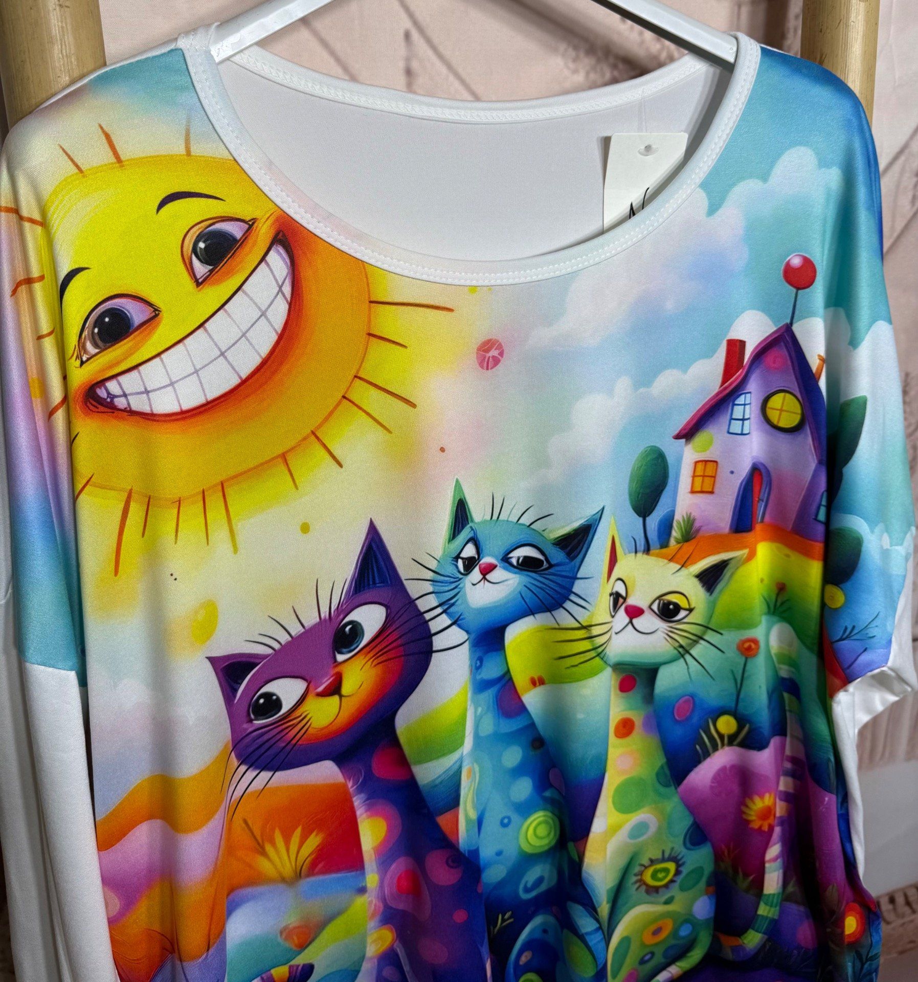 Top ample blanc manches longues La Famille Chats fleuris au Jardin