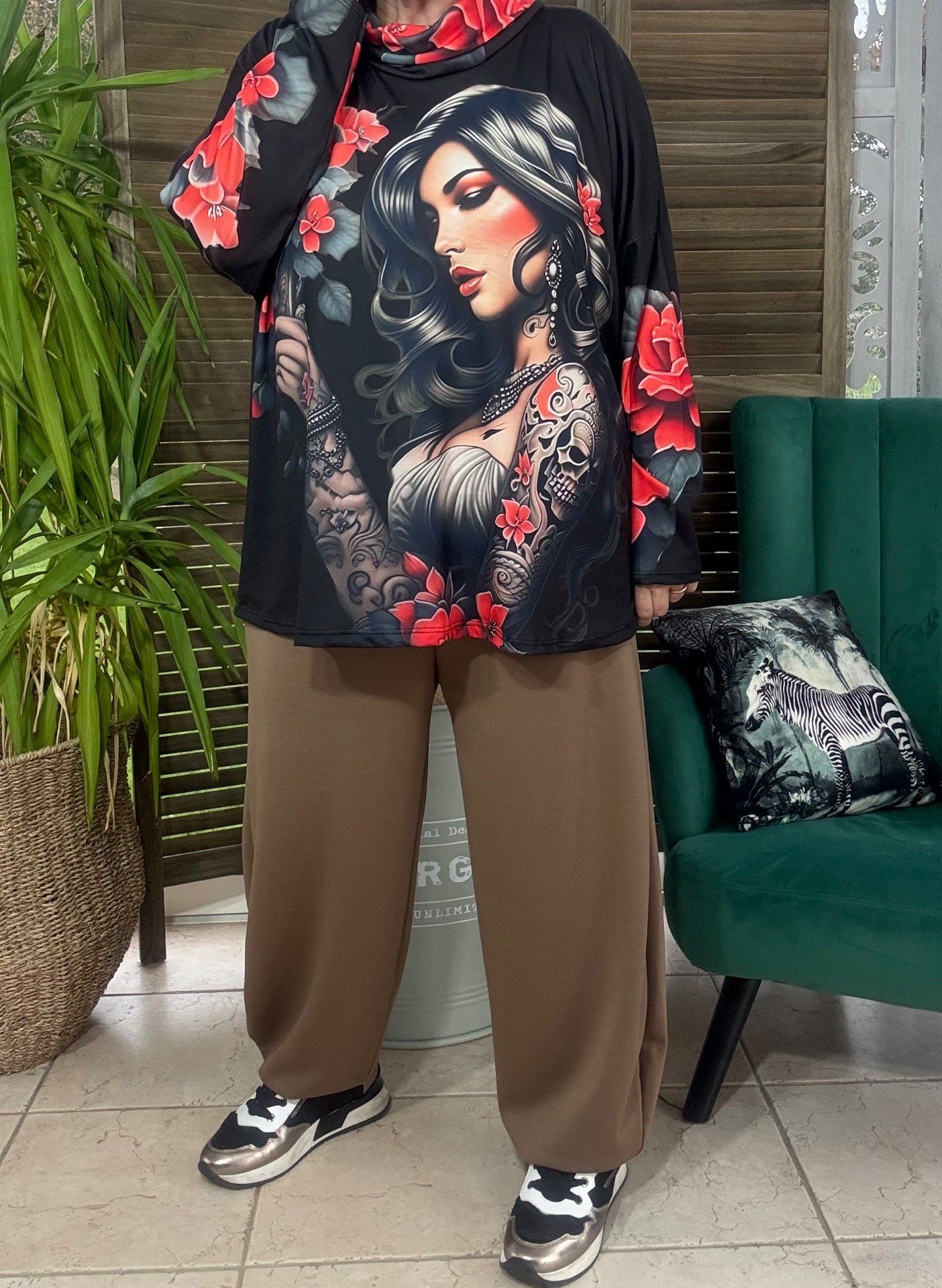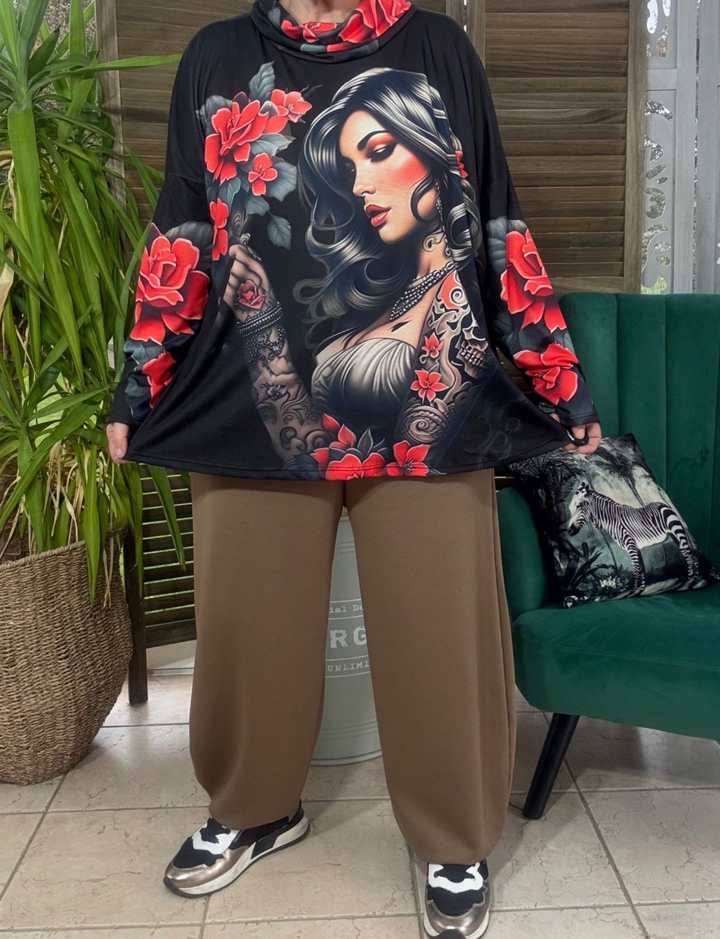Top ample col bénitier noir Pretty Tattoo Girl & Red Roses du 42 au 54/56