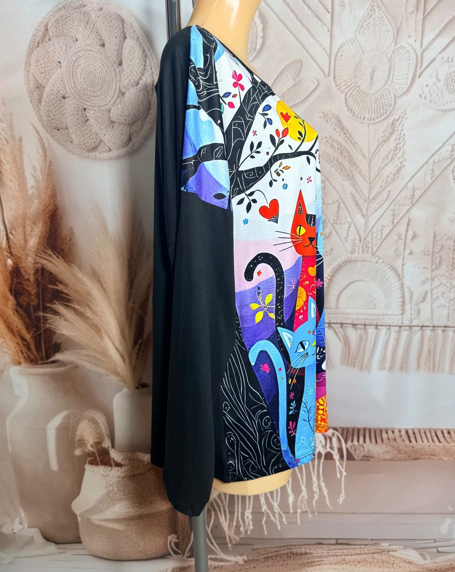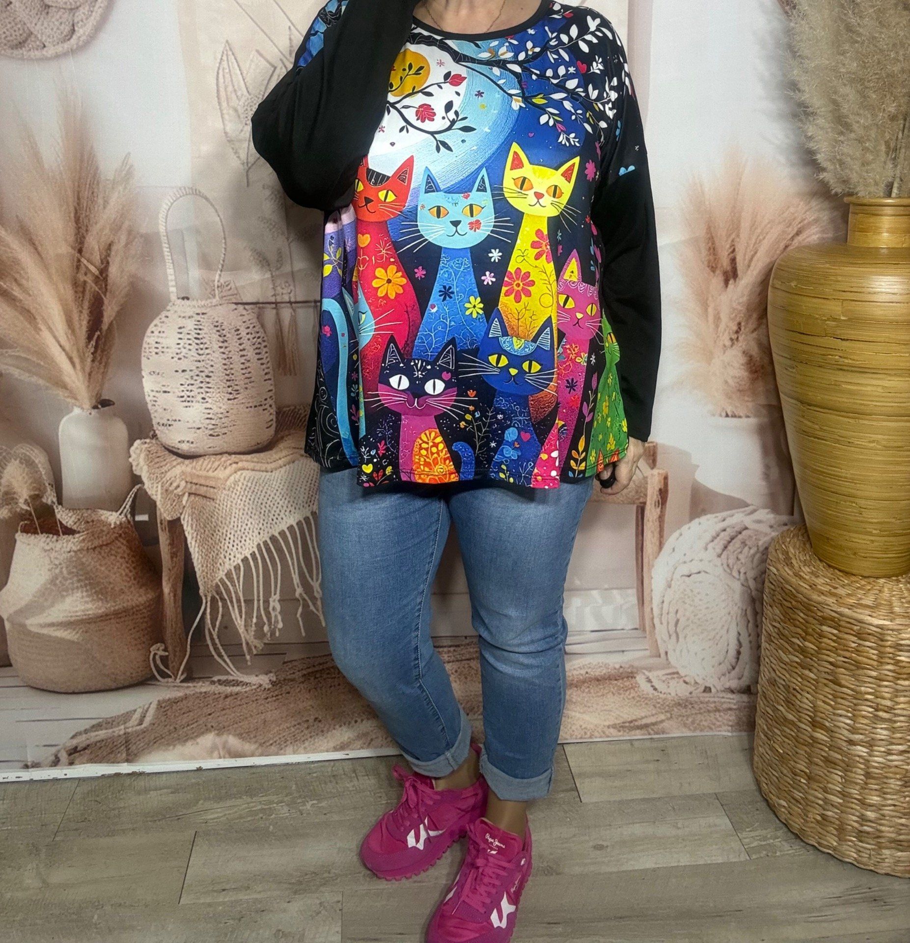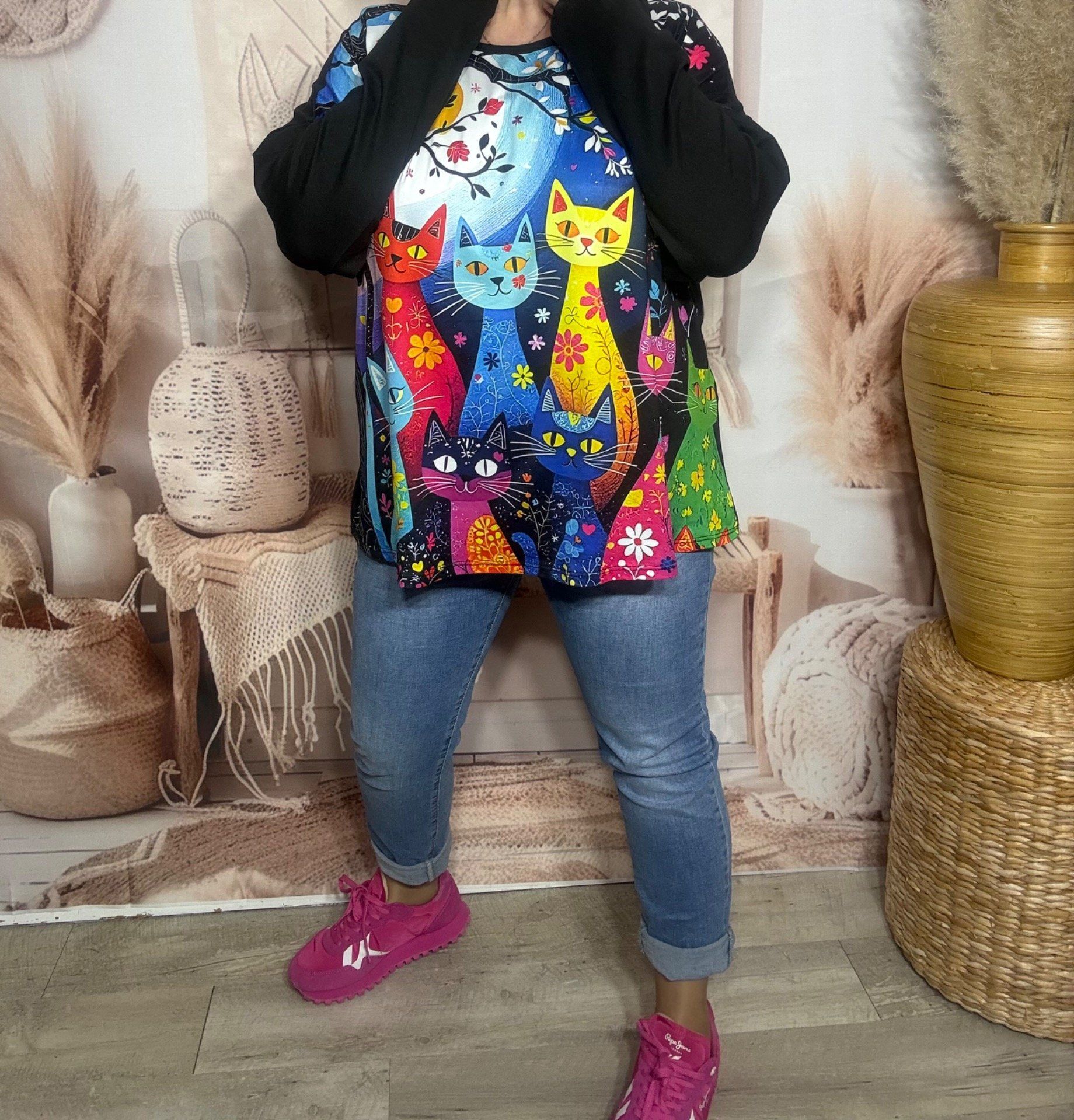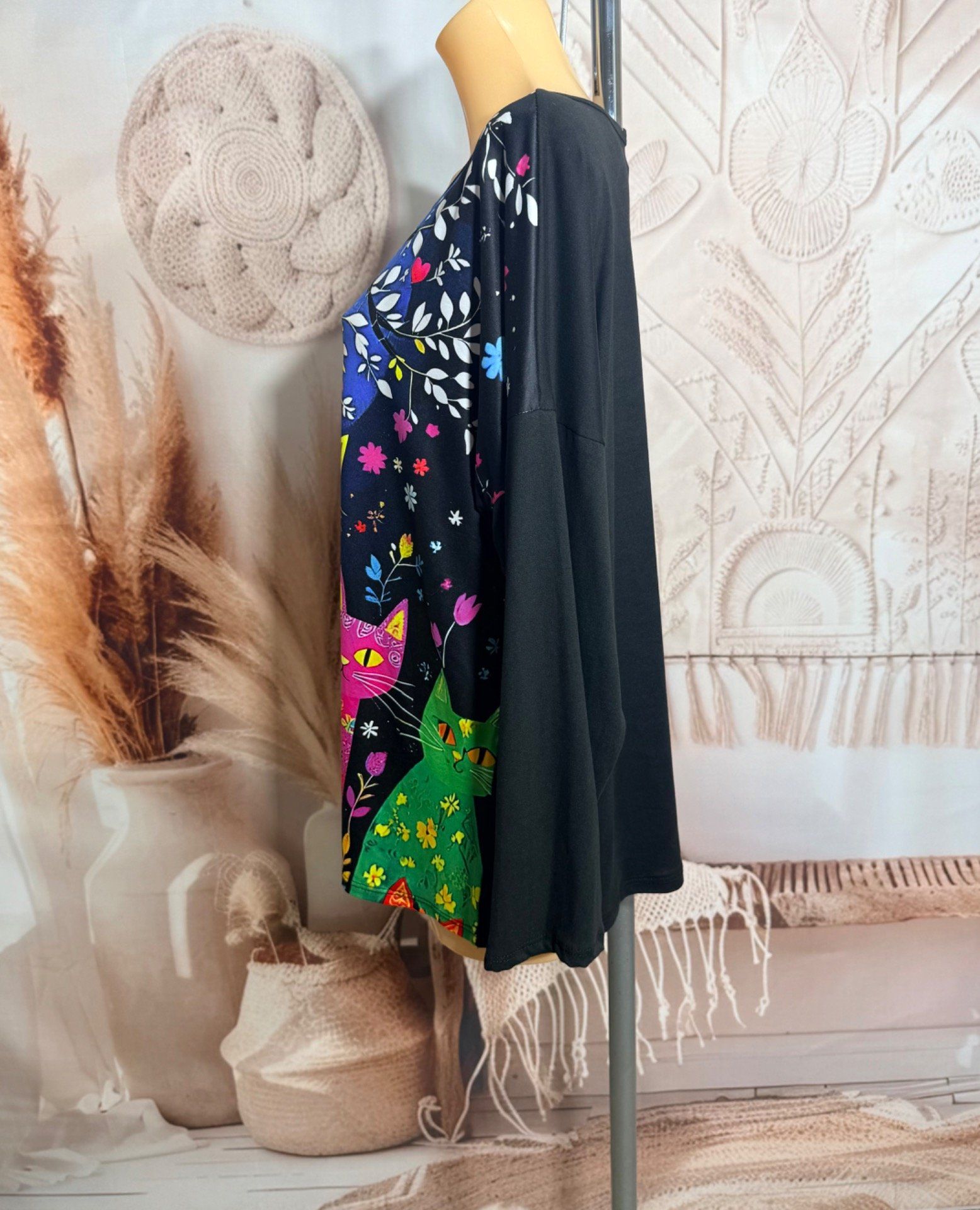 Top ample noir manches longues La Famille des chats fleuris du 40 au 52/54
