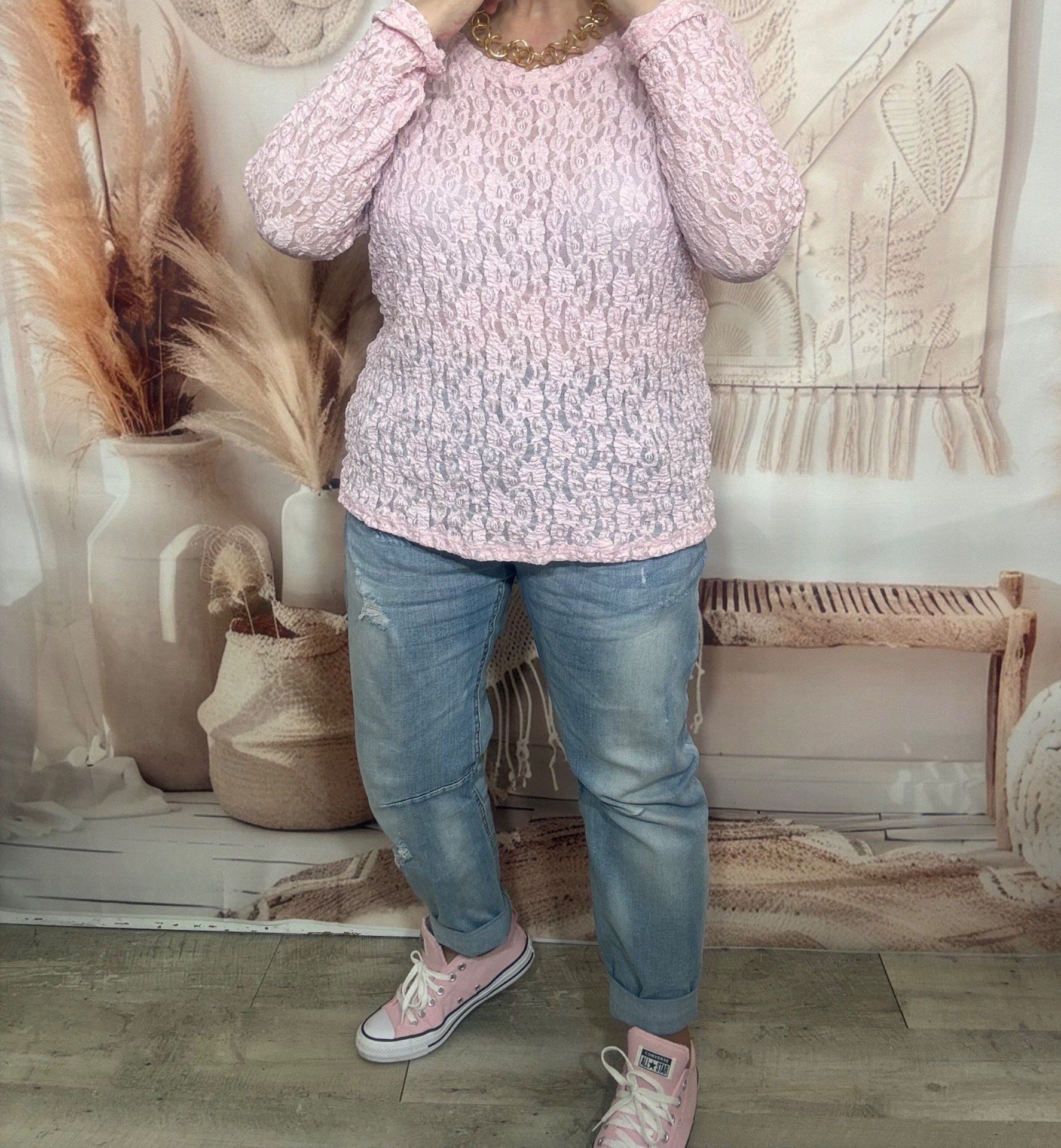 Top dentelle rose poudré Col arrondi manches longues confort +++ du 36 au 48