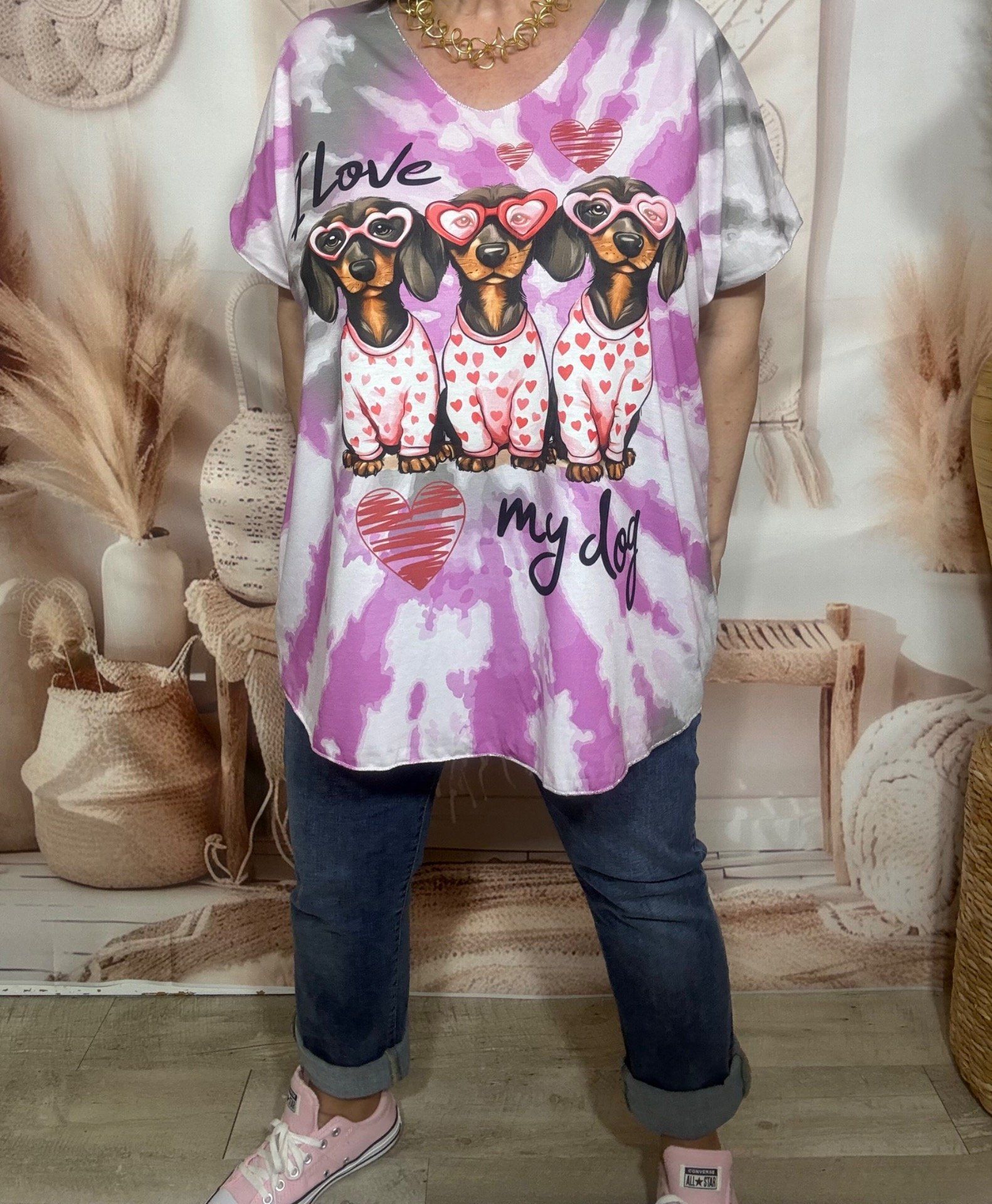 Top fin ample Tie & Dye Violine Gris I love my Dogs Teckels