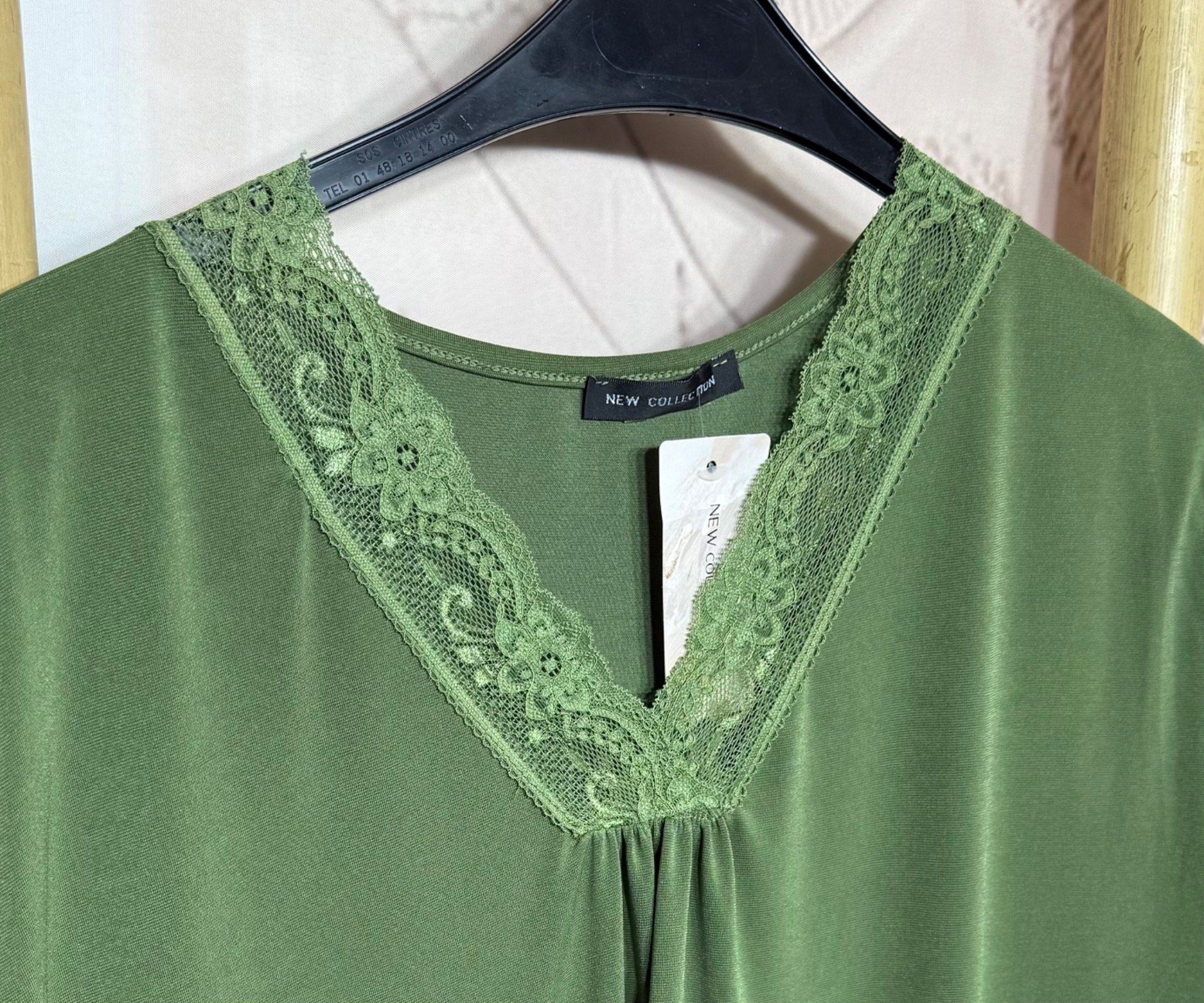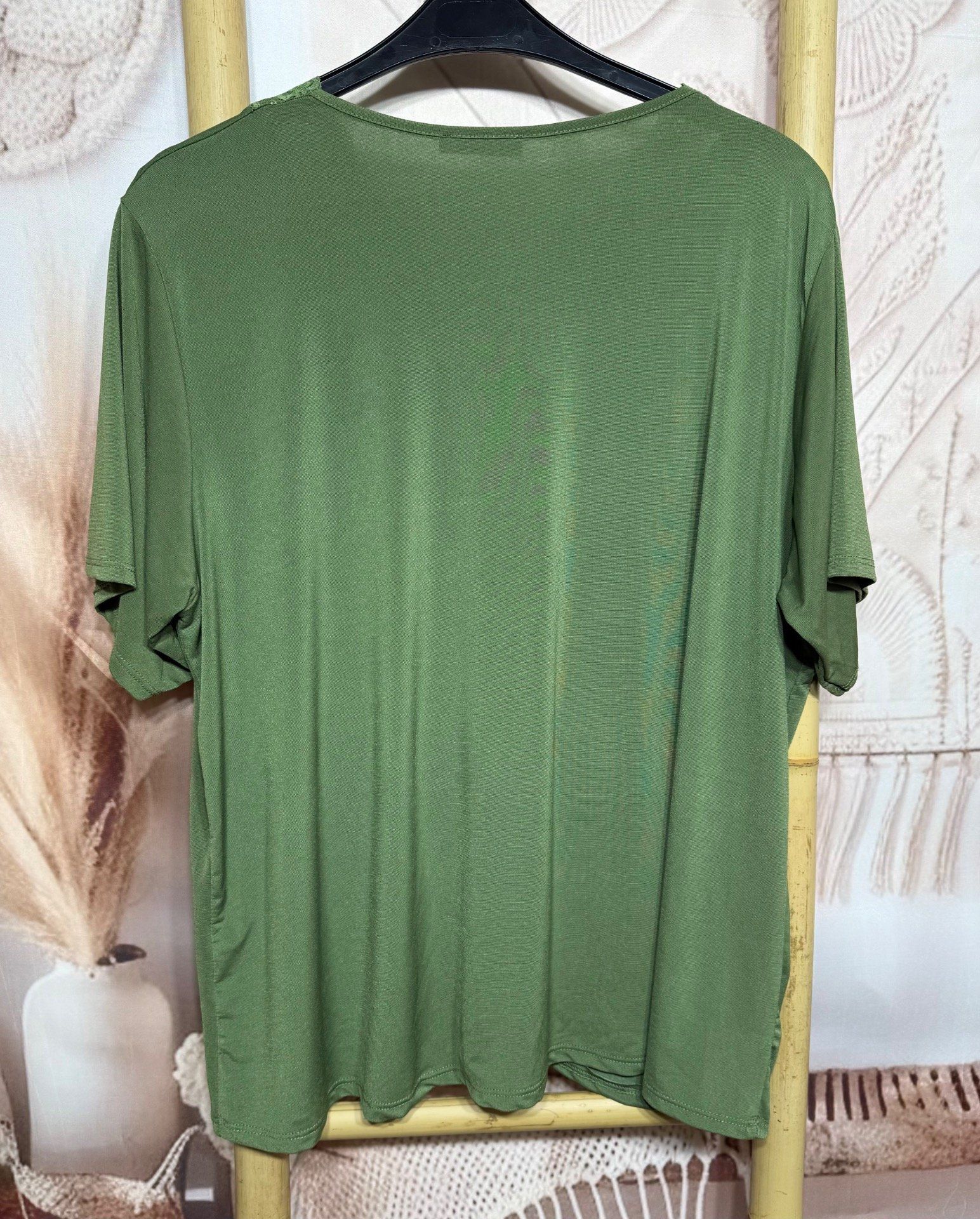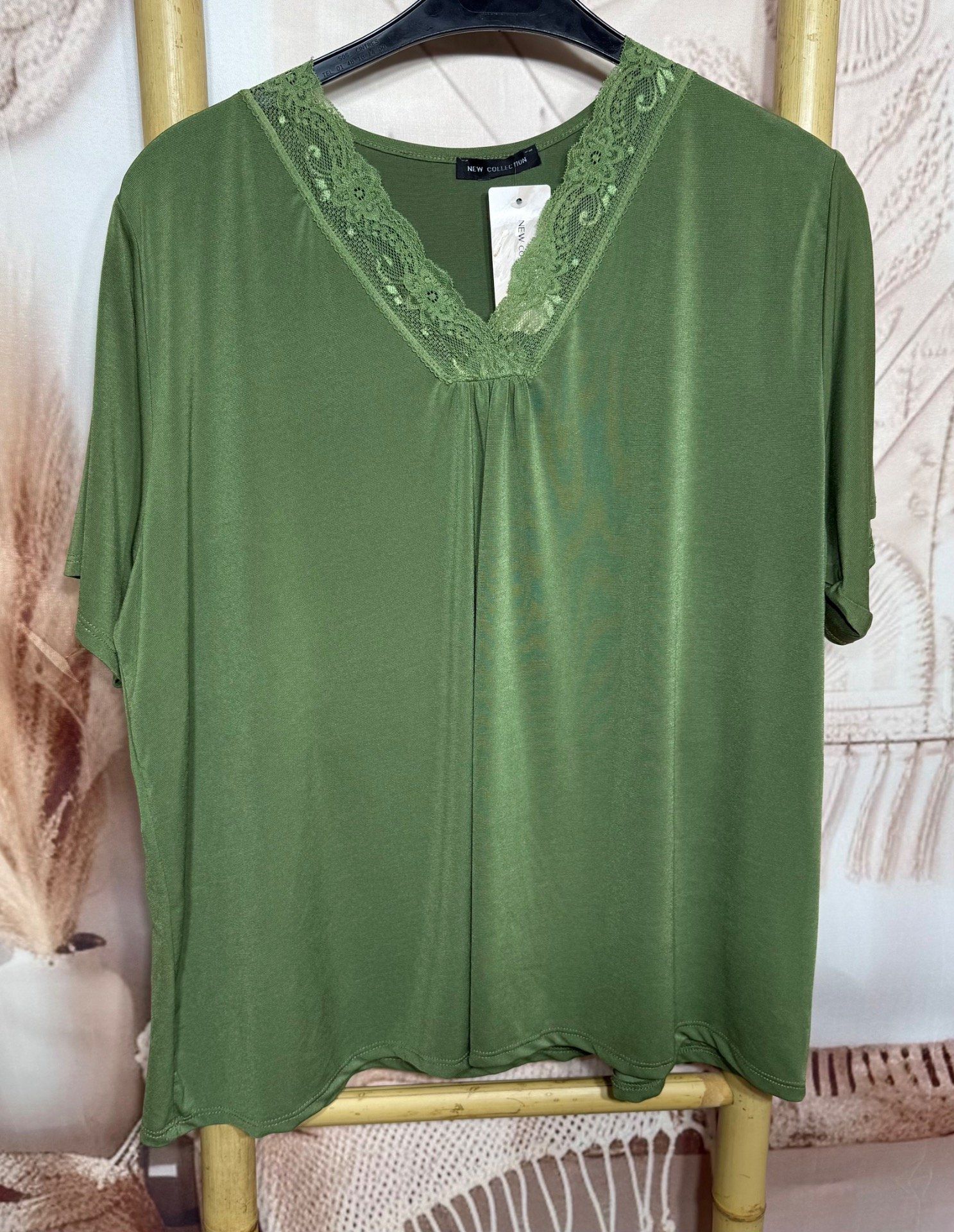 Top Kaki col V dentelle manches courtes Les Basiques du Dressing du 40 au 52/54