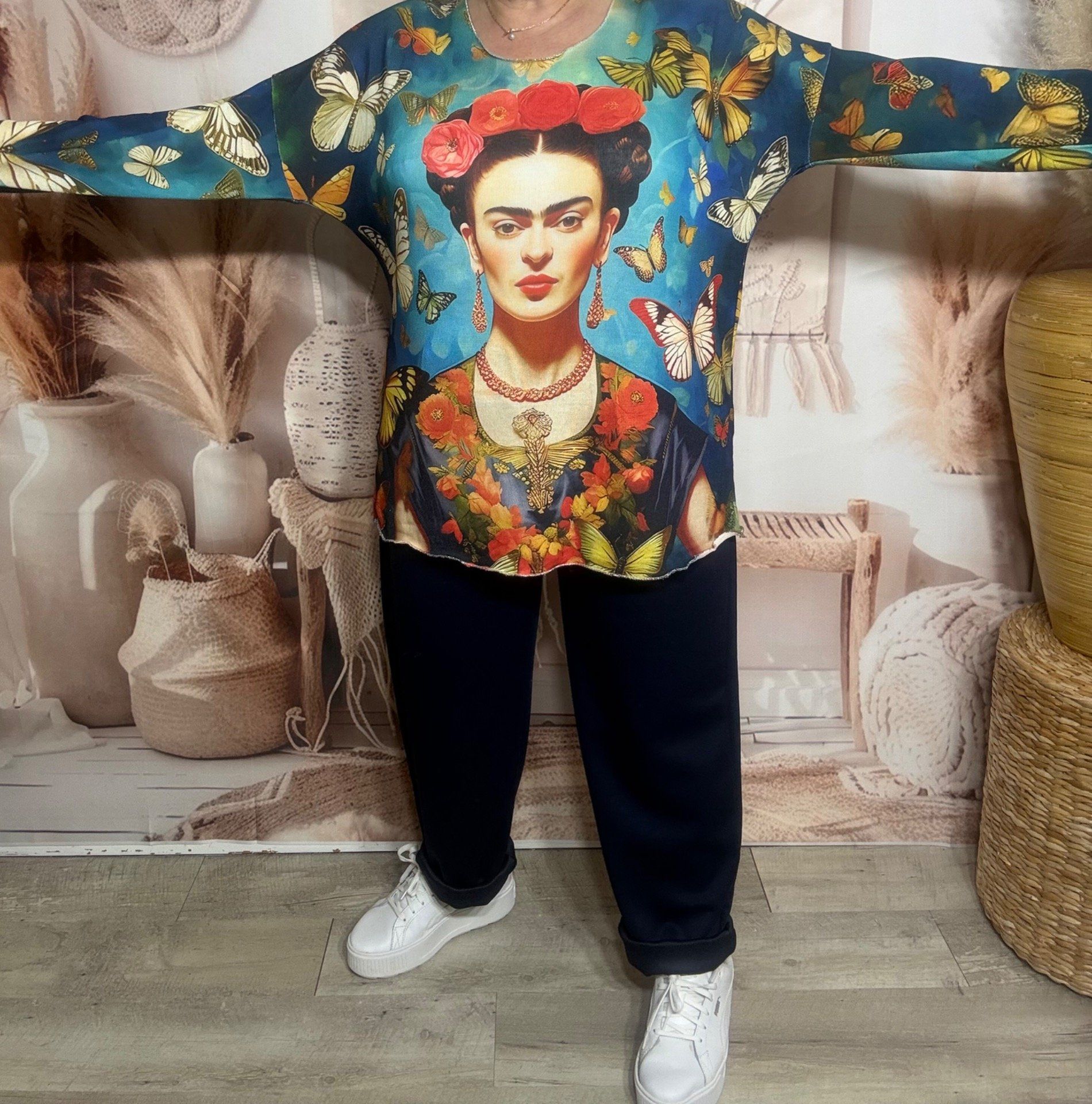 Top manches longues bleuté Frida Kahlo et les papillons du 40 au 50/52