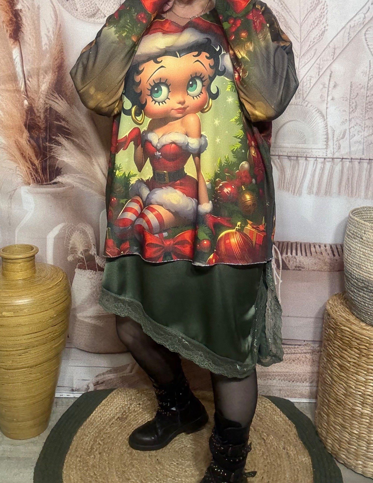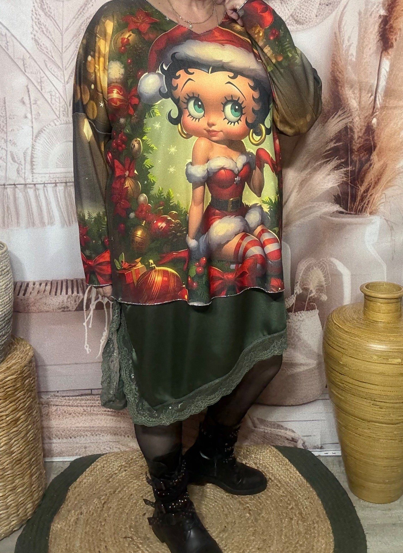 Top manches longues kaki Betty Boop Mère Noël doublé fine polaire du 40 au 54/56