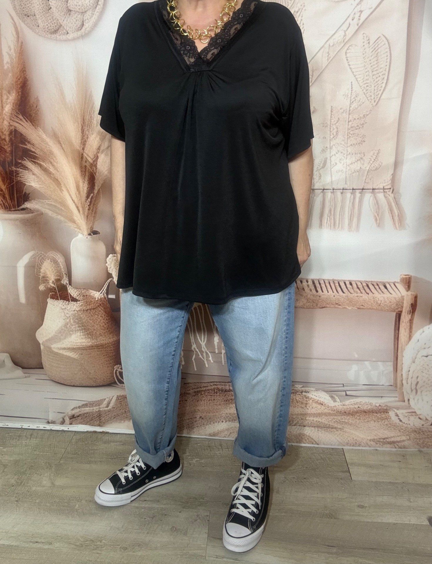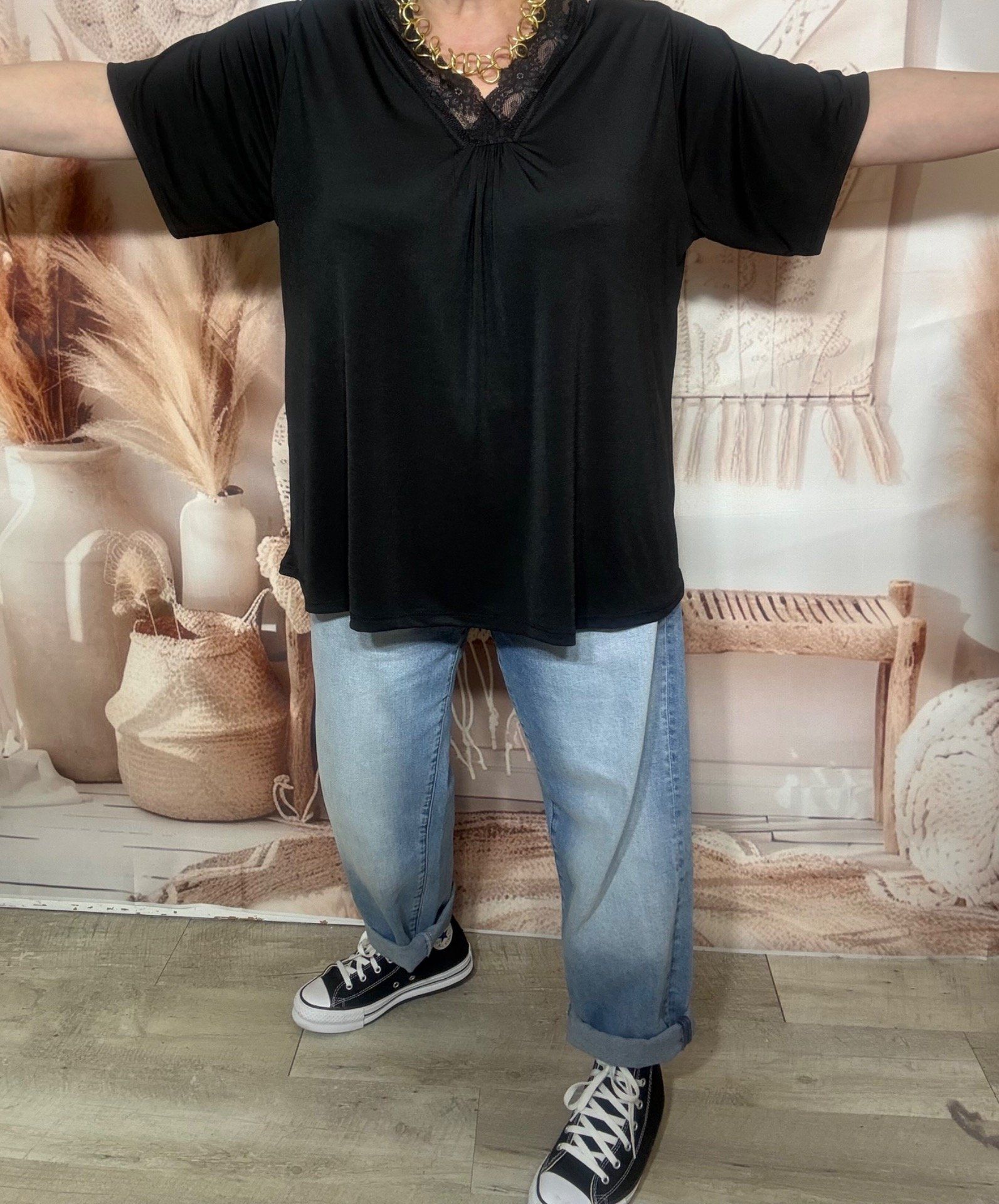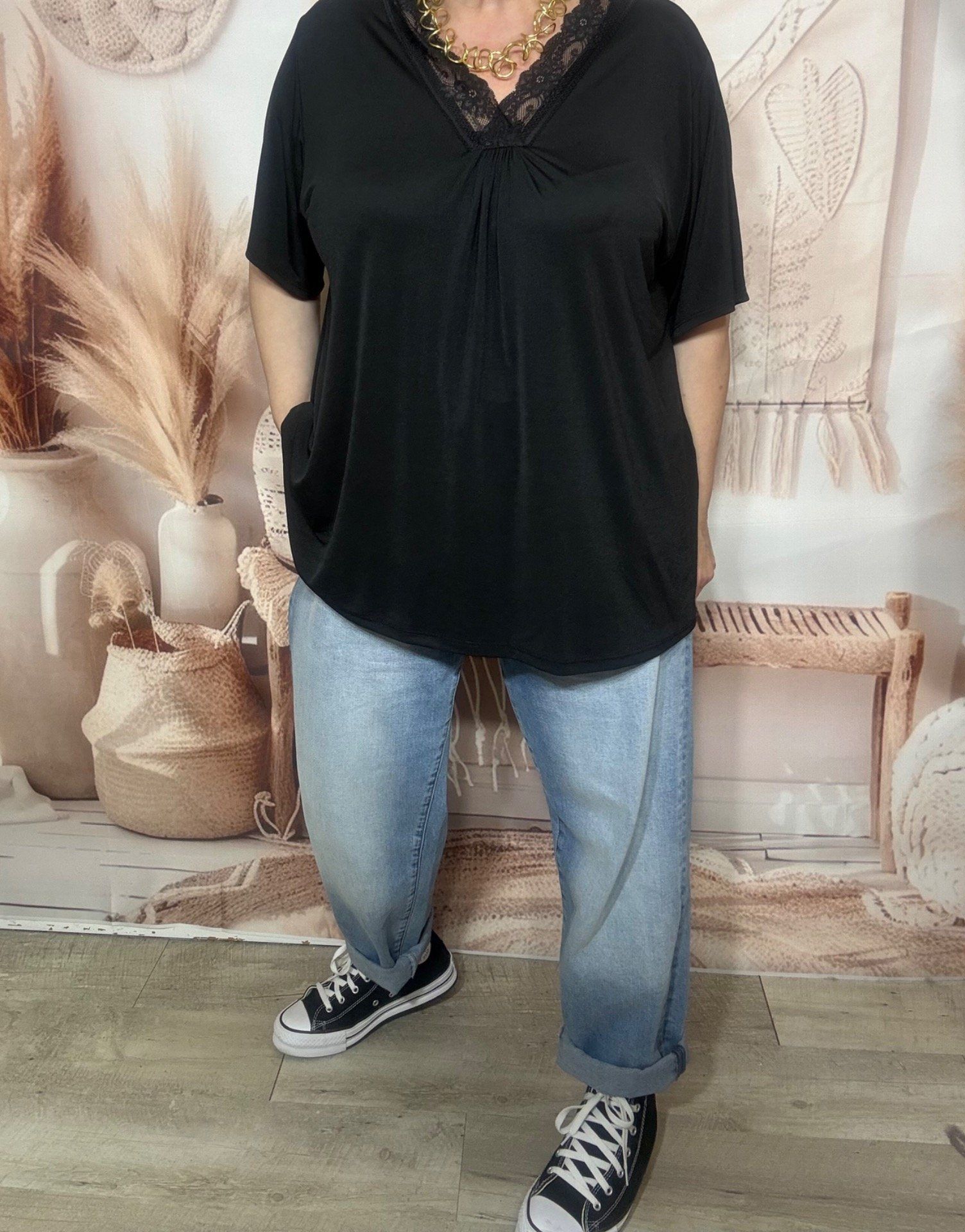 Top noir col V dentelle manches courtes Les Basiques du Dressing du 40 au 52/54